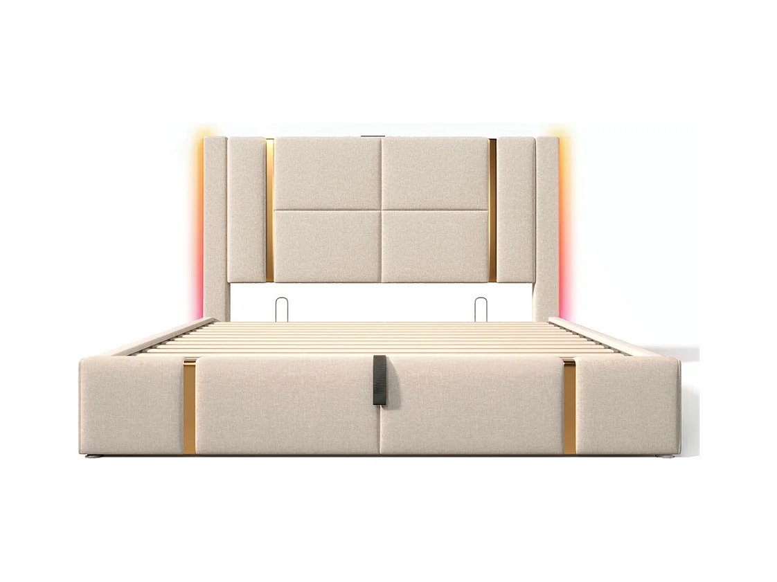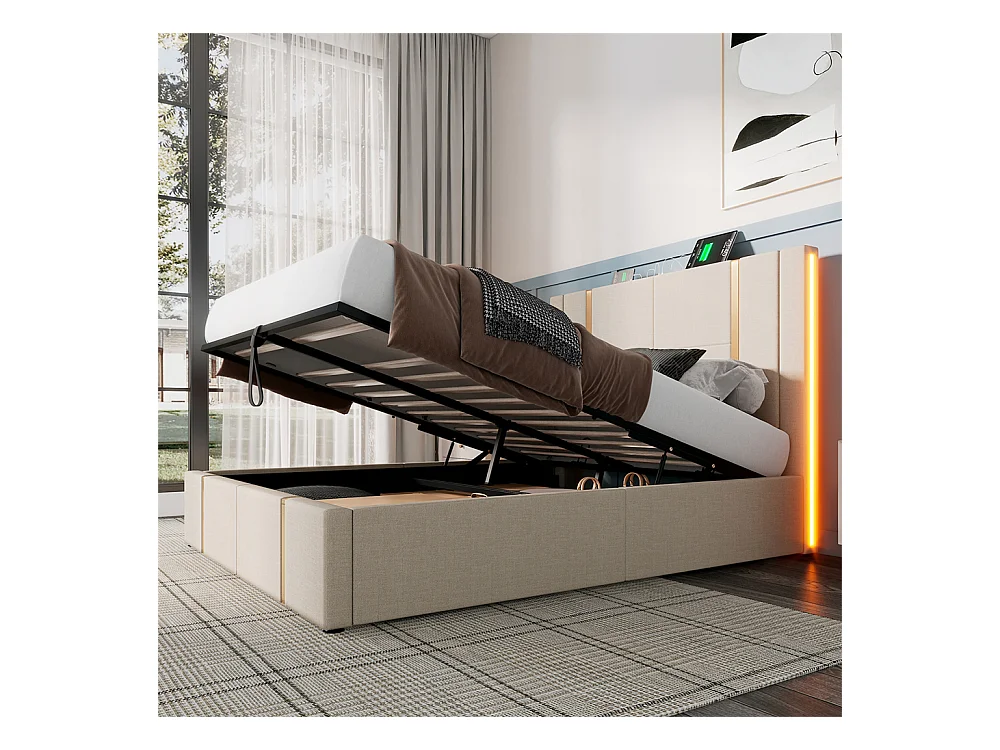 Lit adulte lit 160x200 cm lit rembourré lit de rangement lit sommier à lattes en bois lit double lin beige