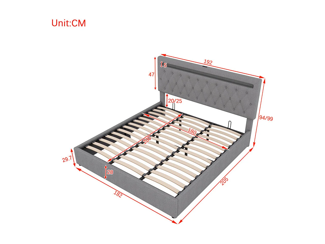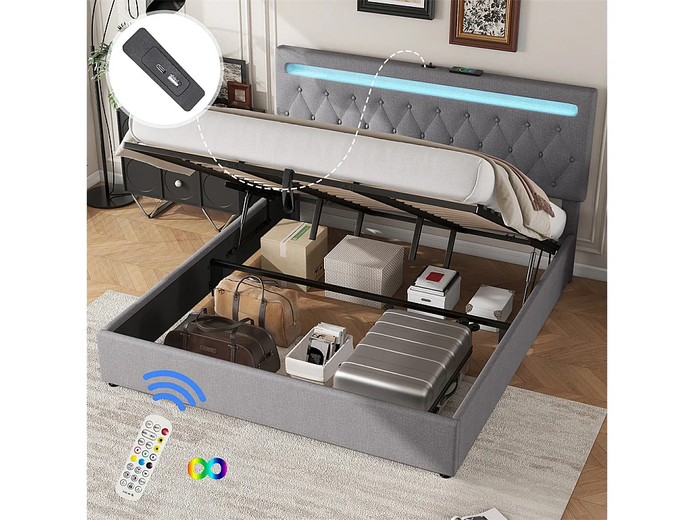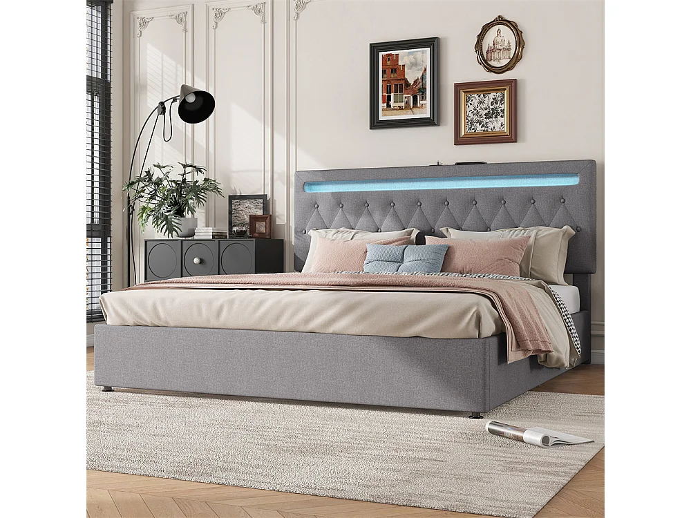 Lit adulte lit 180x200 cm lit rembourré hydraulique avec lumière ambiante lit double lin gris