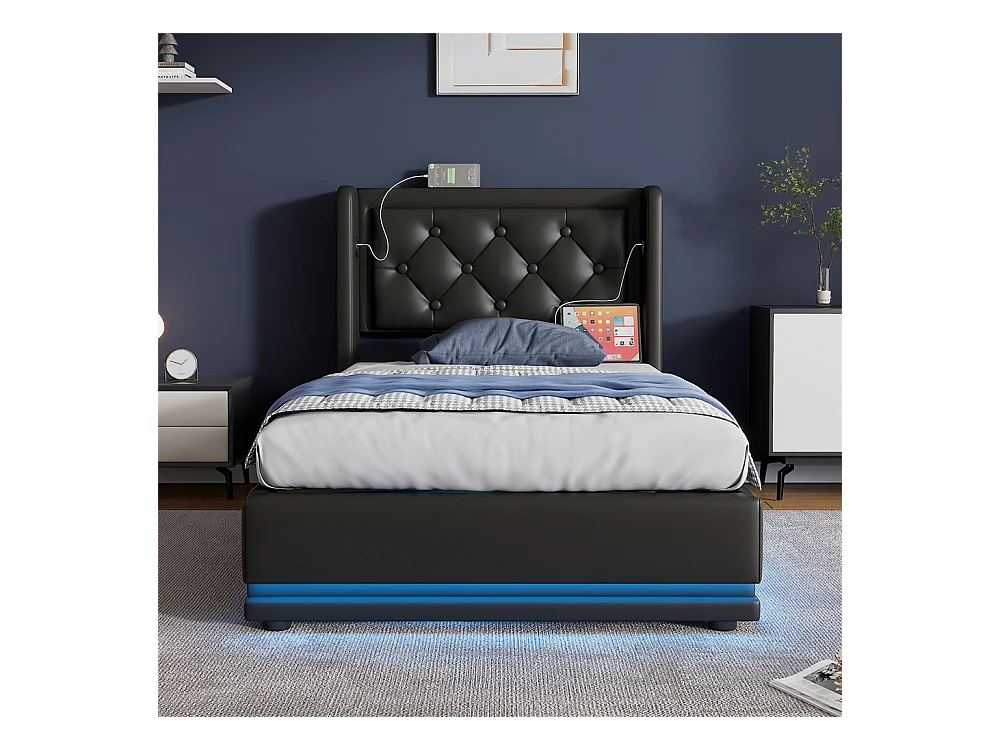 Lit adulte lit 90x200 cm lit rembourré hydraulique lit de rangement Single avec fonction de charge usb type-c tête de lit pu noir