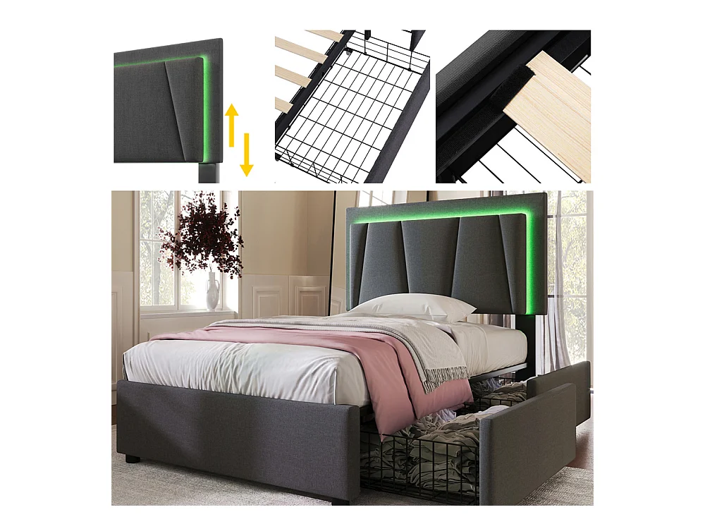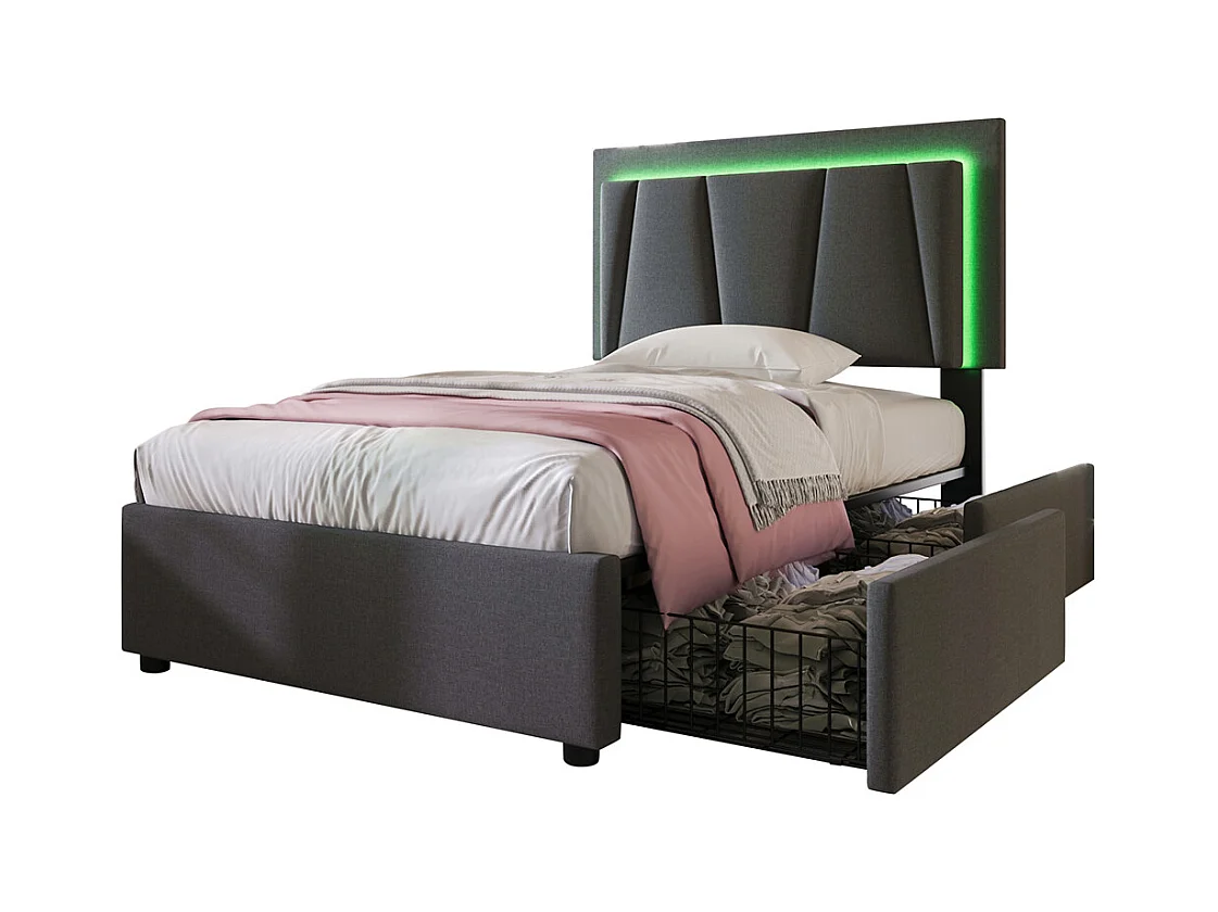Lit adulte lit 90x200 cm lit rembourré lit eclairage led lit 2 tiroirs lit sommier à lattes en bois Single lin gris