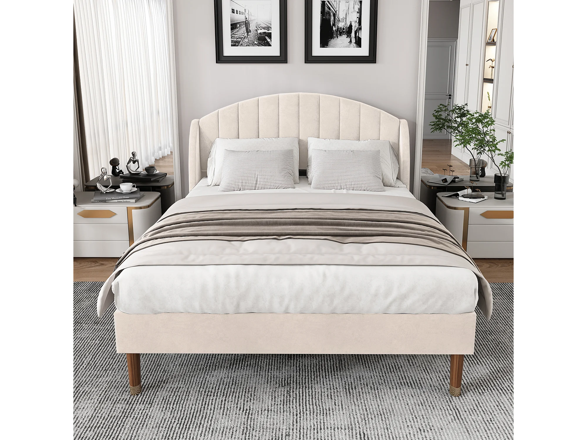 Lit adulte Lit capitonné 140x200 cm avec sommier à lattes - beige - Sweiko