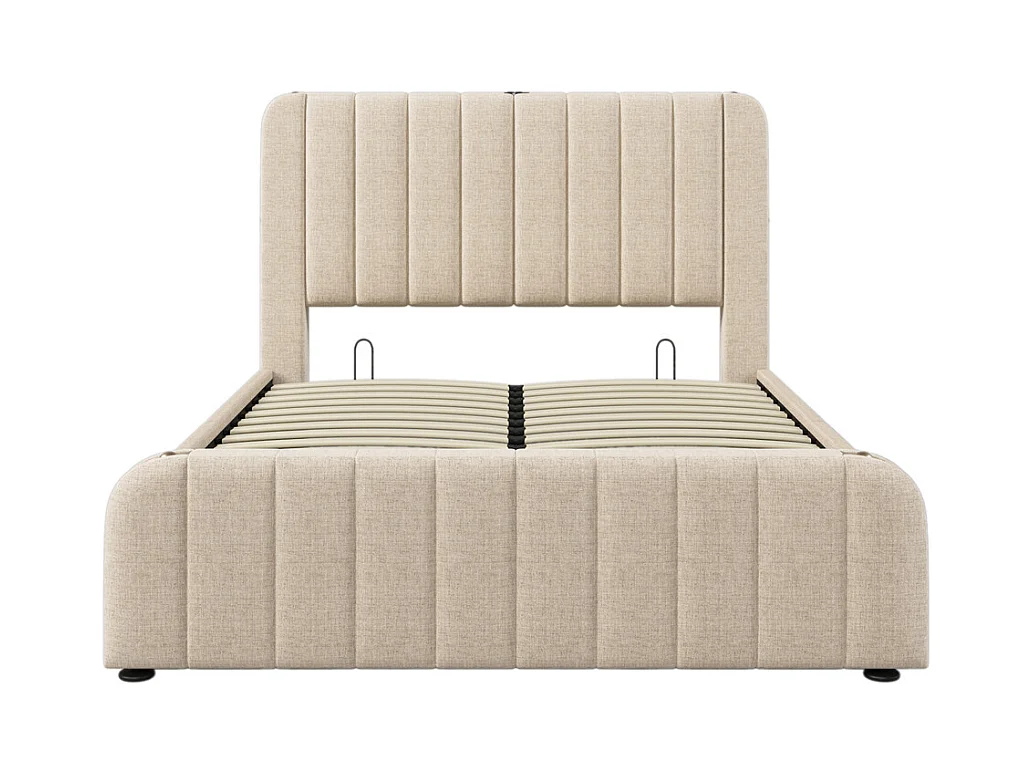 Lit adulte lit coffre lit 160x200 cm lit de rangement lit rembourré hydraulique fonction de charge usb type-c lit double lin beige