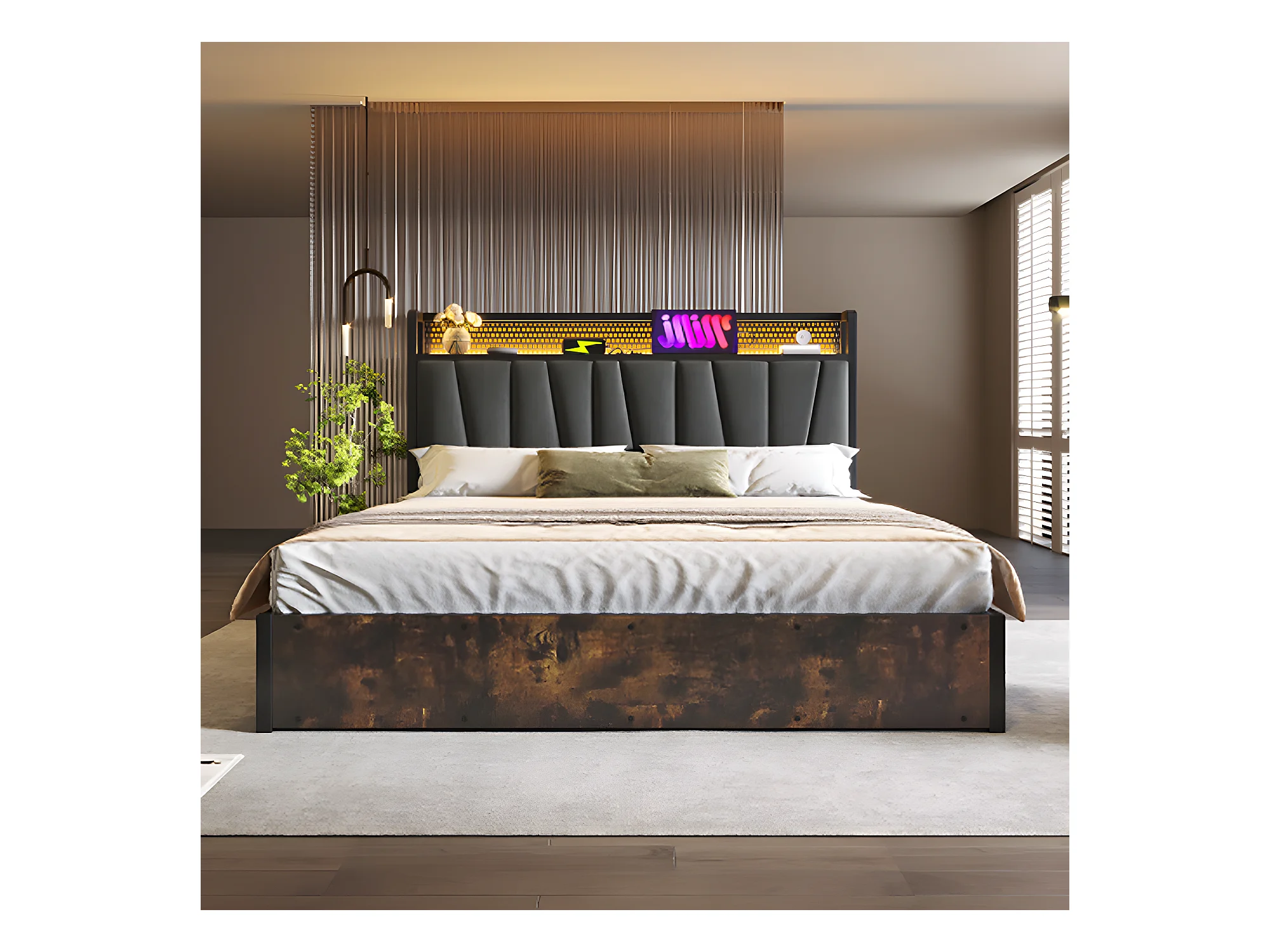 Lit adulte Lit coffre Lit rembourré lit en métal LED App Control lit double160x200 cm sommier à lattes en bois gris