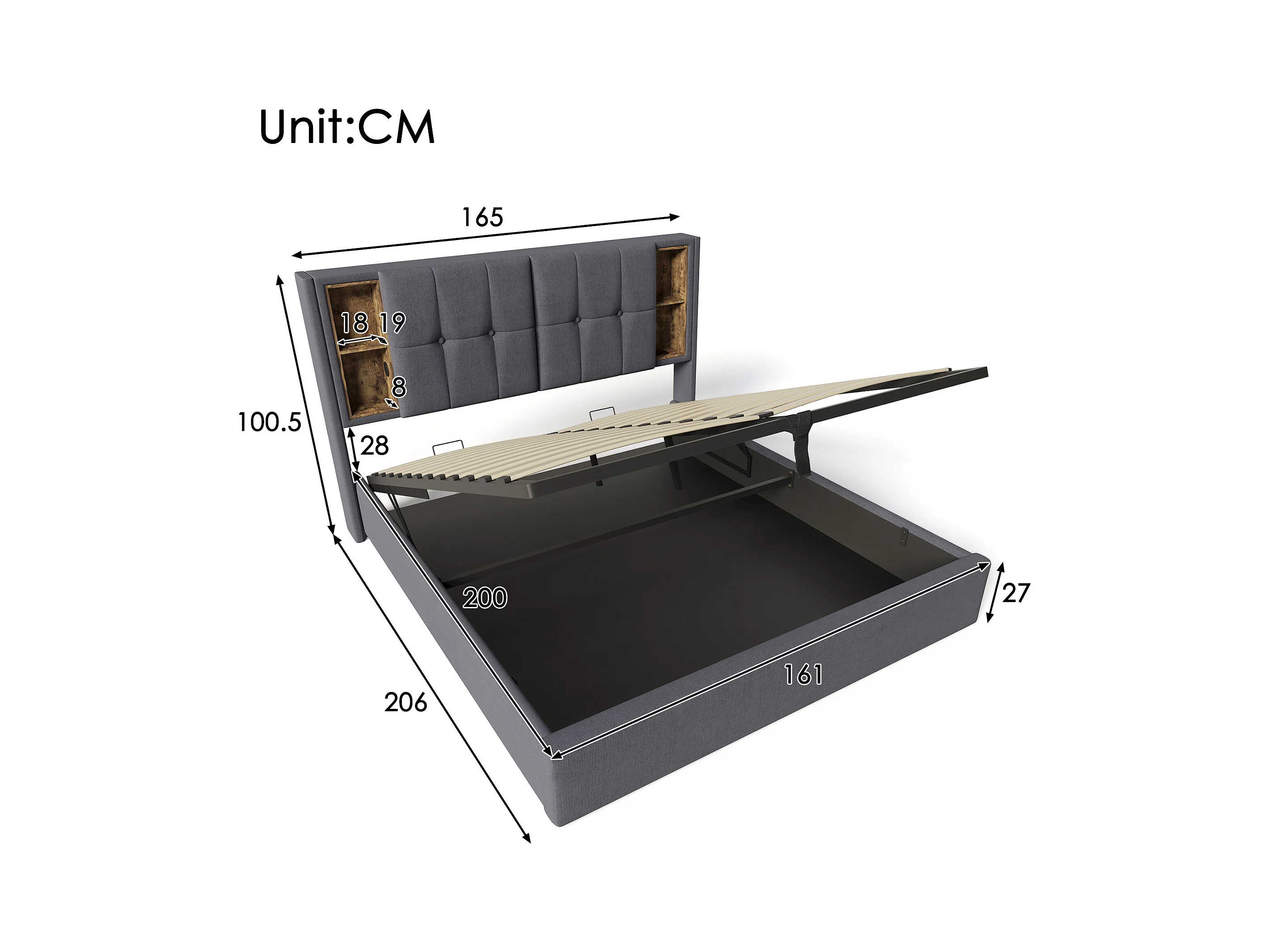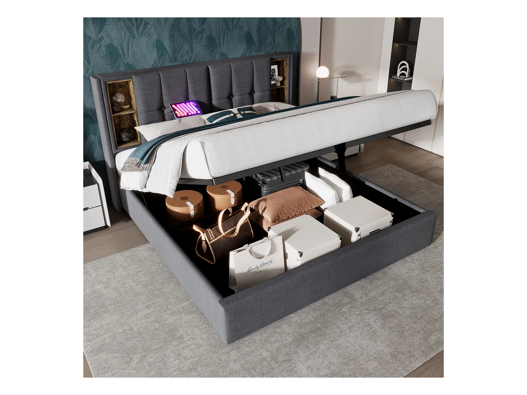 Lit adulte, lit double capitonné 160x200 cm, avec espace de rangement et recharge sans fil USB C, coton gris (matelas non inclus)