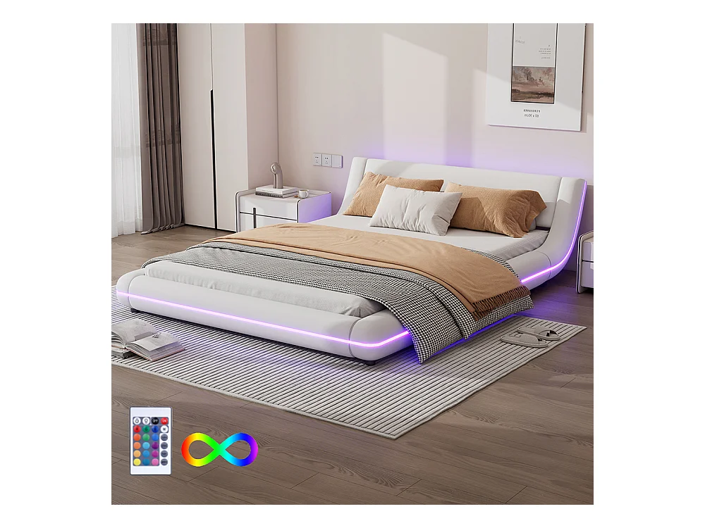 Lit adulte Lit double Lit 140x200 cm avec d'ambiance LED télécommande 24 touches PU blanc