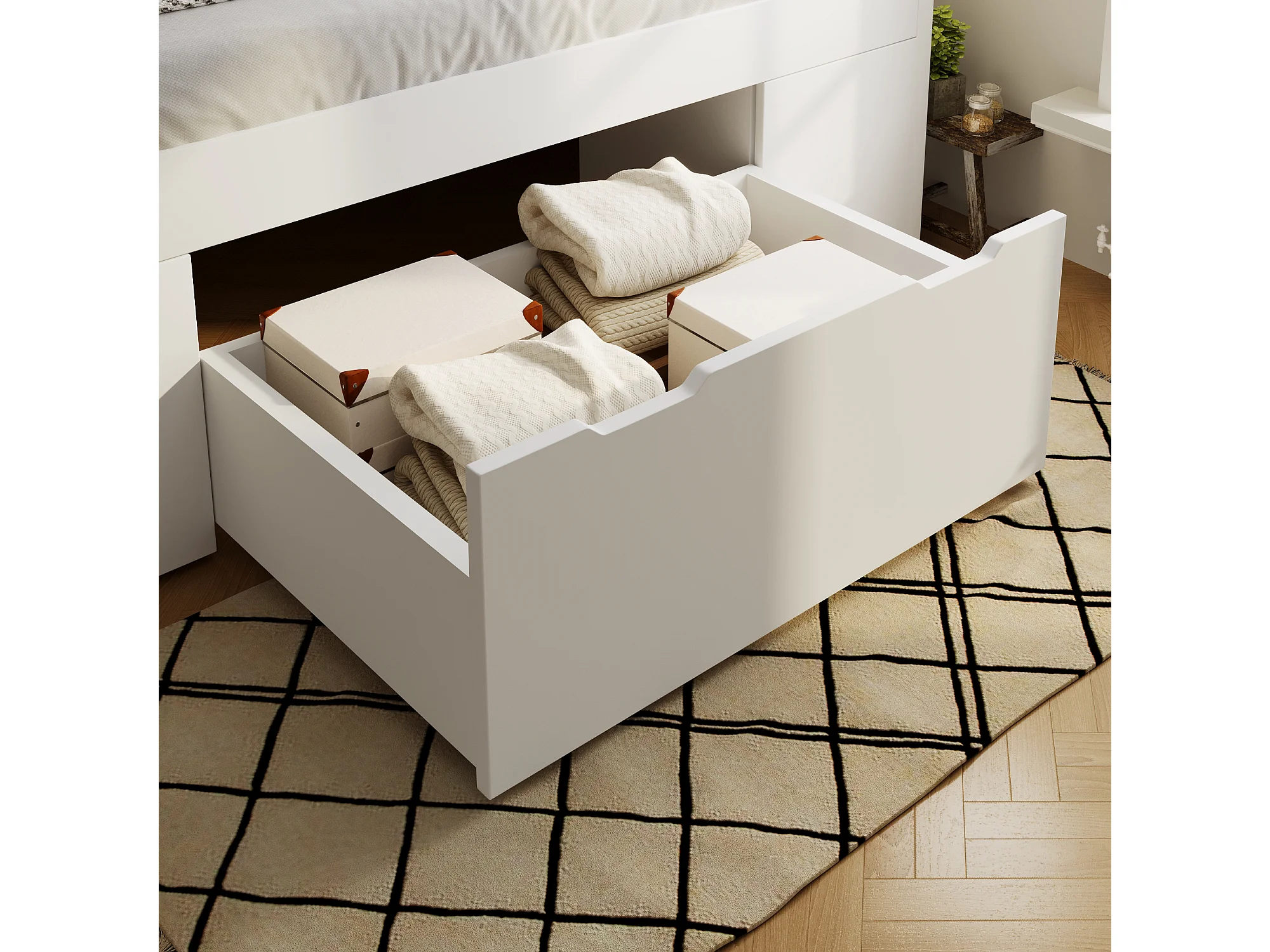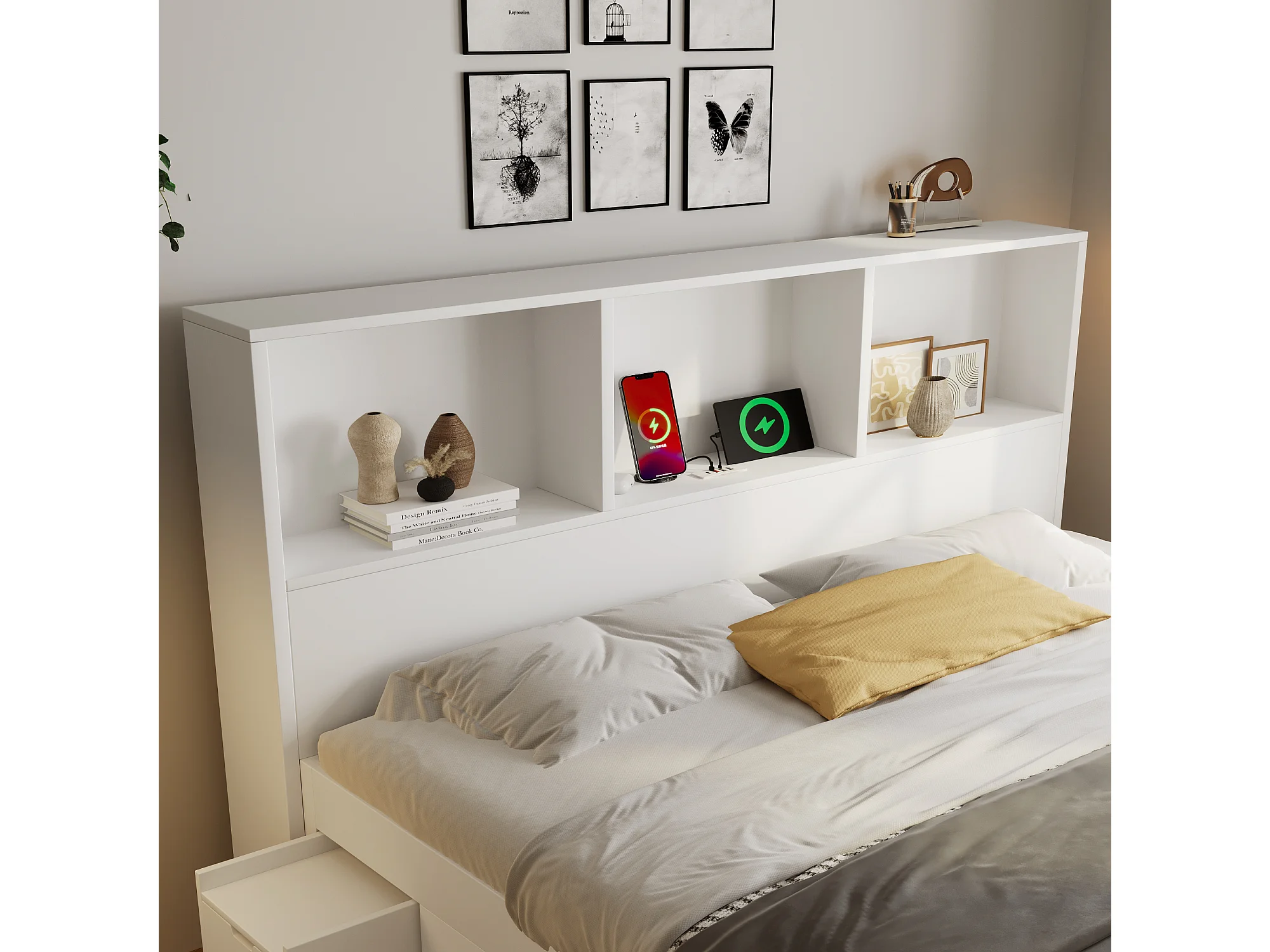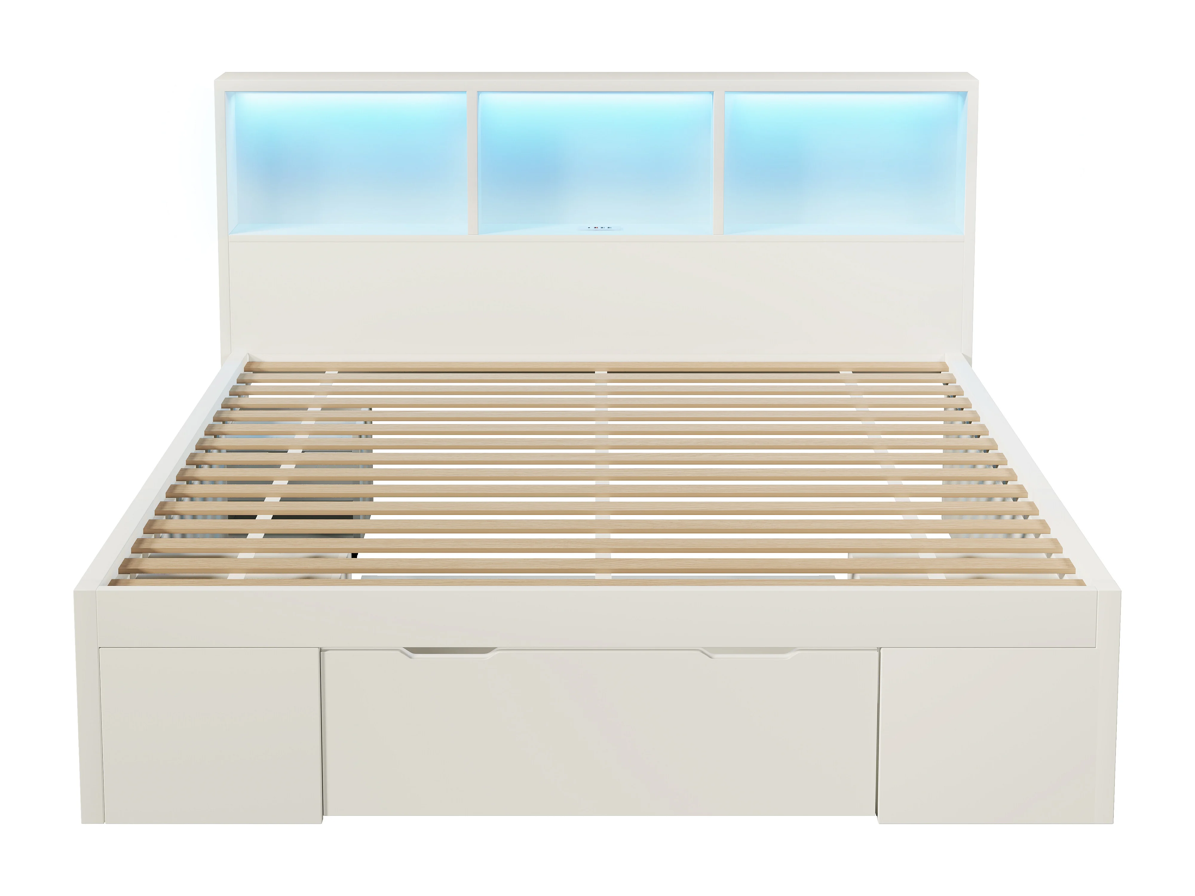 Lit adulte140x190 cm avec LED, ports USB/Type-C, tiroirs et chevets mobile - Blanc