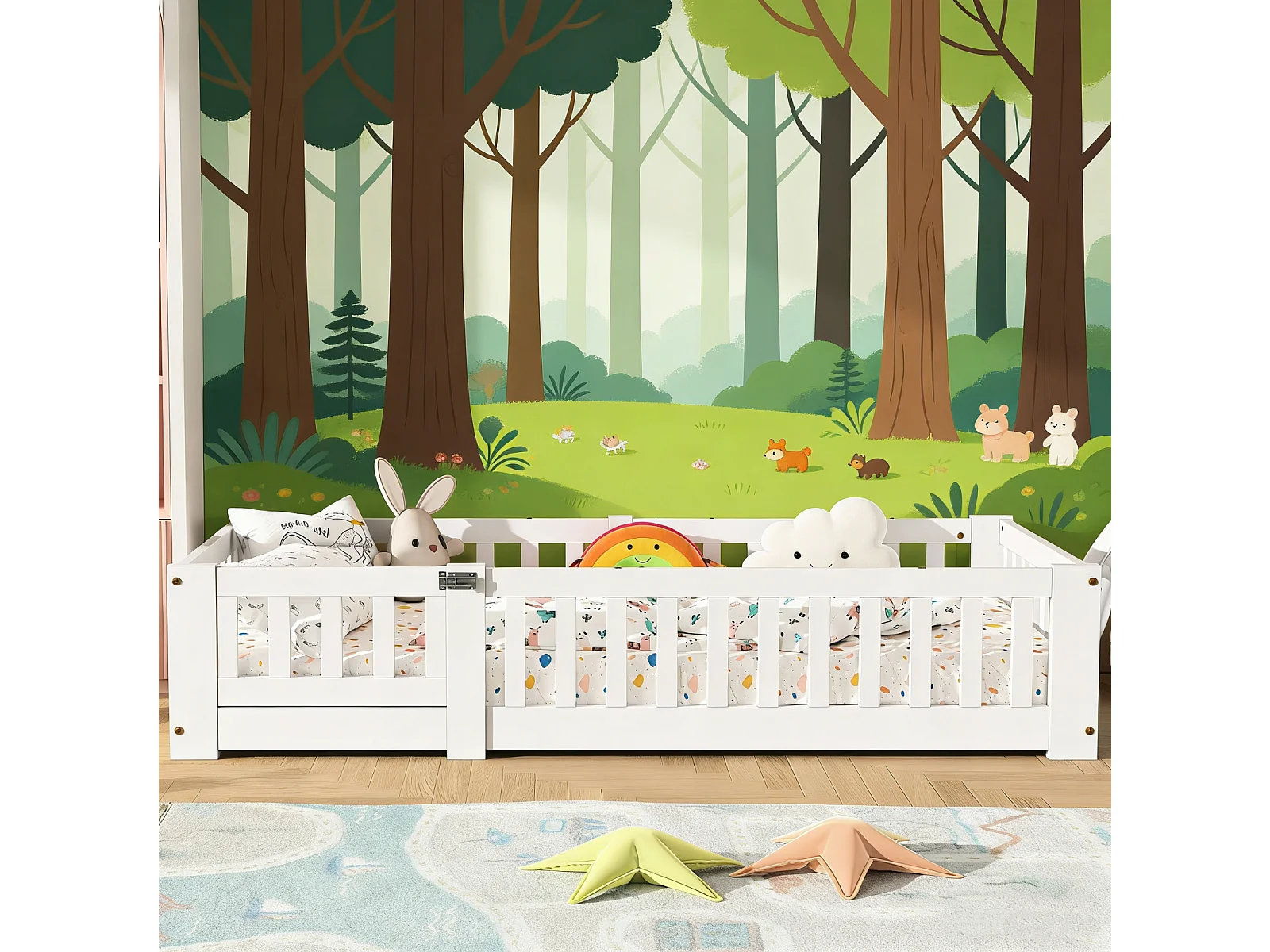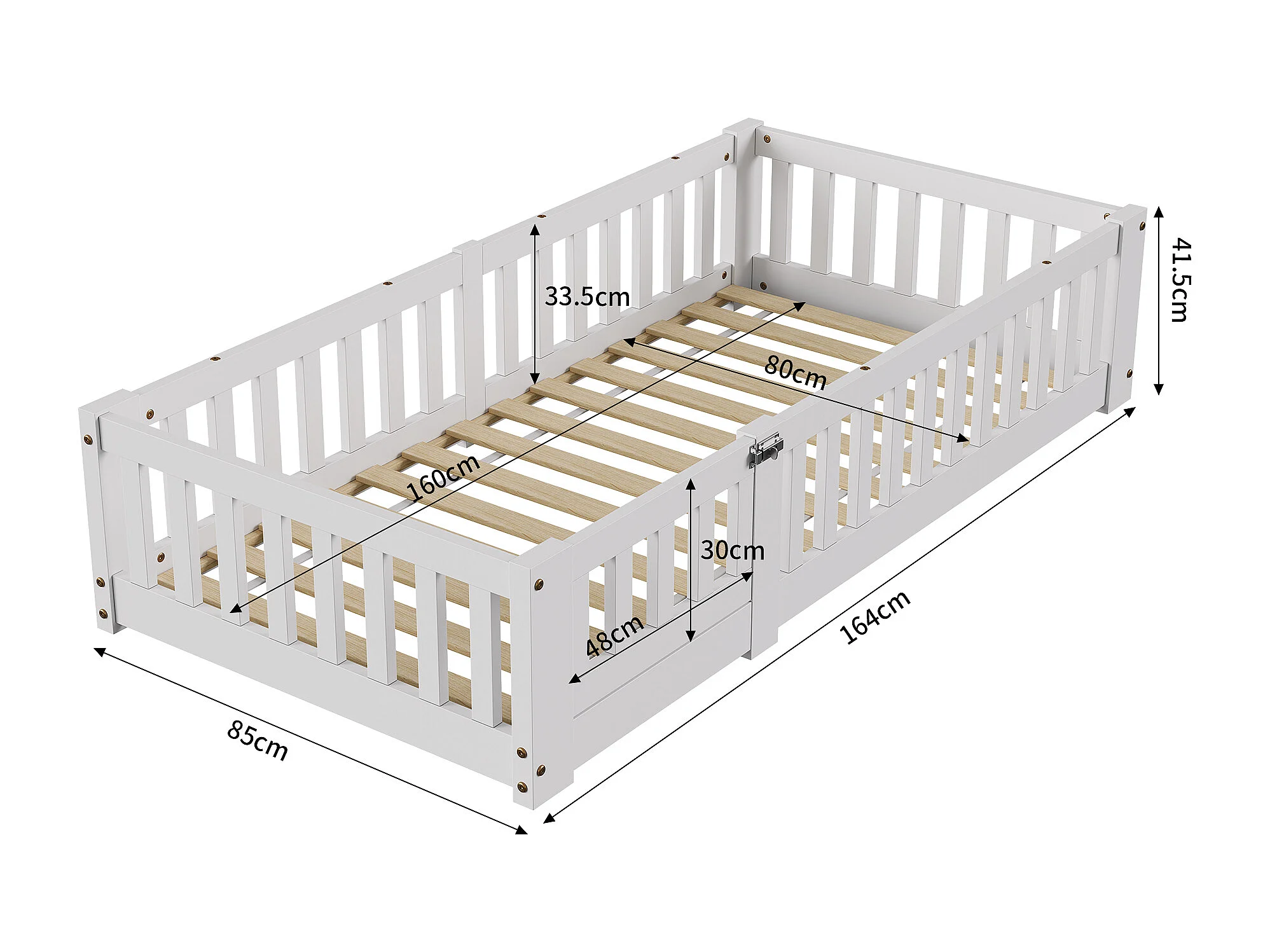 Lit au Sol Enfant 80x160, Lit Montessori au Sol en Bois Massif avec Barrière de Sécurité et Sommier à Lattes, blanc