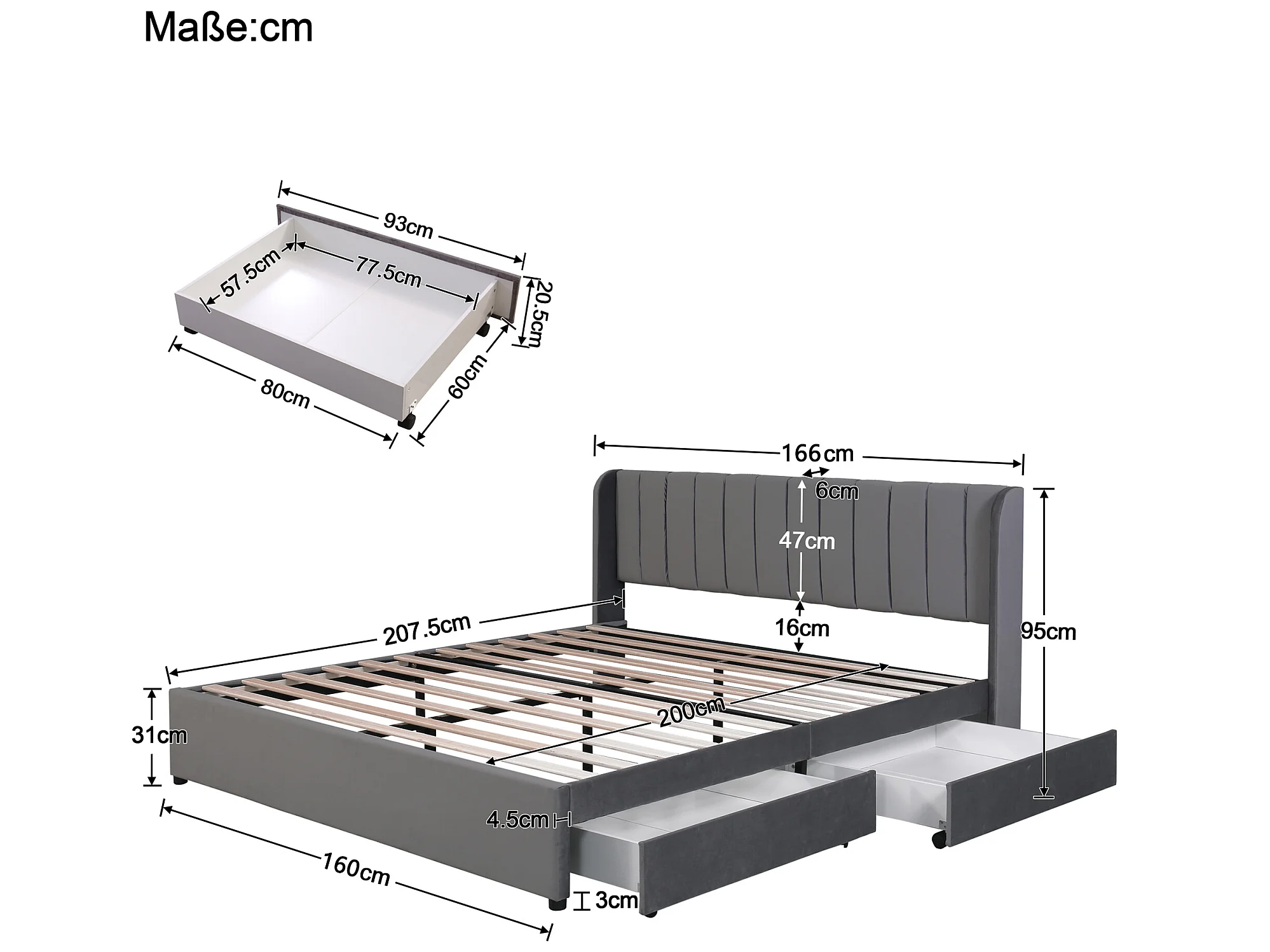 Lit avec 2 tiroirs - 160 x 200 cm - Gris - Sweiko
