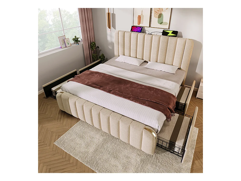 Lit avec 4 tiroirs Lit rembourré Double tête de lit rembourrée avec bandes décoratives dorées fonction de chargement USB Type-C Lit 180x200 cm Beige
