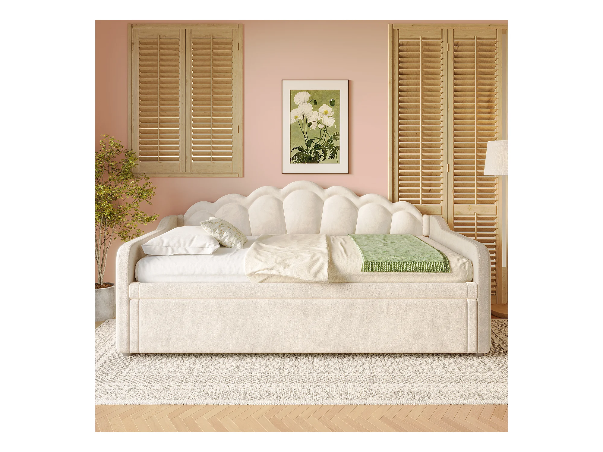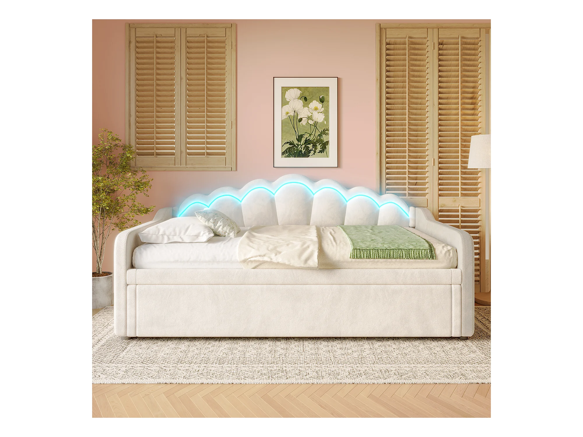 Lit avec canapé-lit et lit extensible, 90x200cm(180x200cm), en velours, avec bandes LED multicolores, beige (214x187x87 cm)