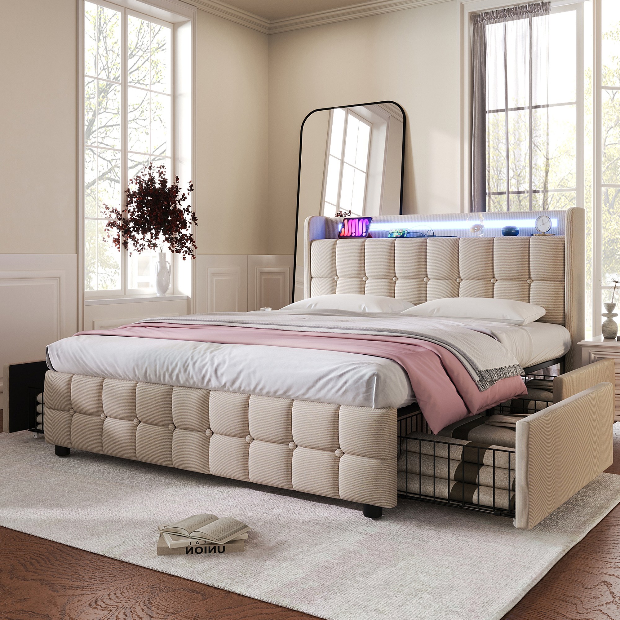 Lit avec fonction de chargement USB, tête de lit avec éclairage LED et 4 tiroirs, 160x200 cm, beige