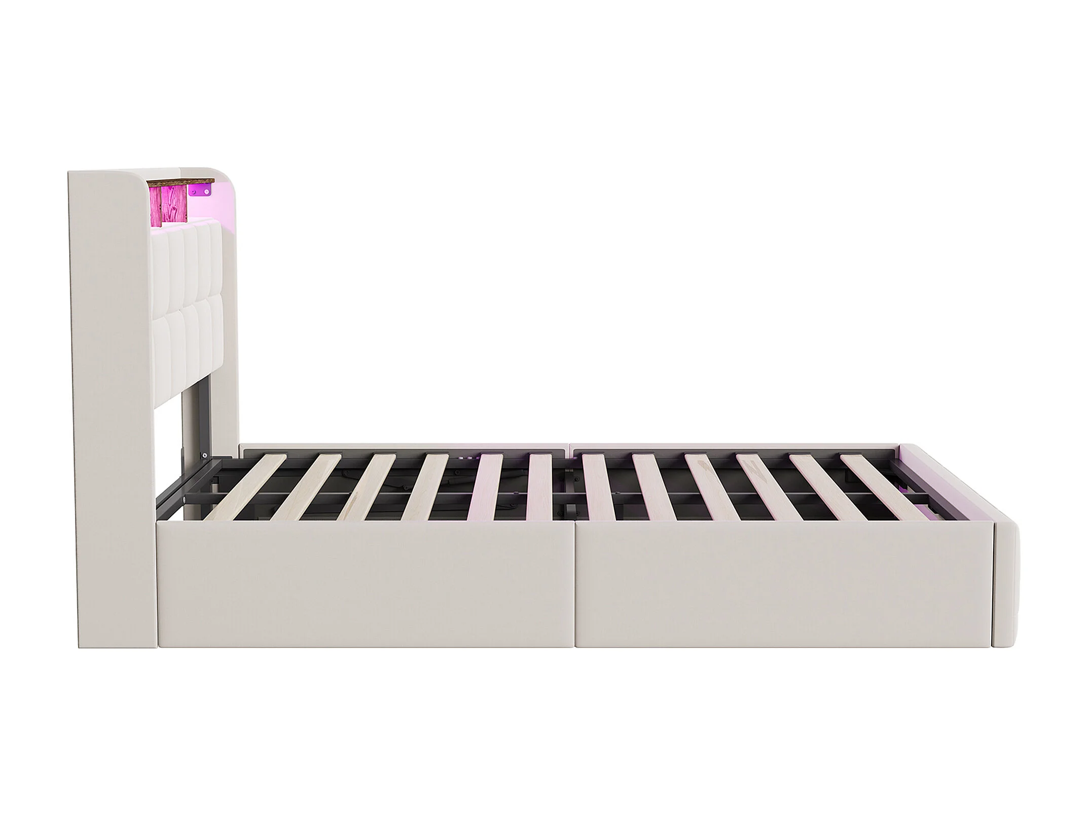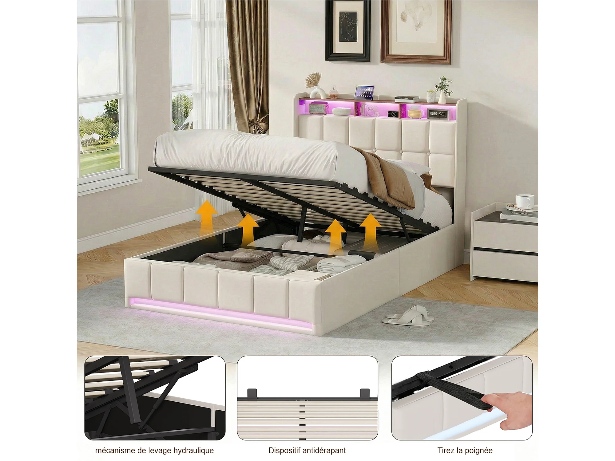 Lit avec rangement - 140 x 190 cm - avec chargement USB et éclairage LED - Tissu de lin - beige
