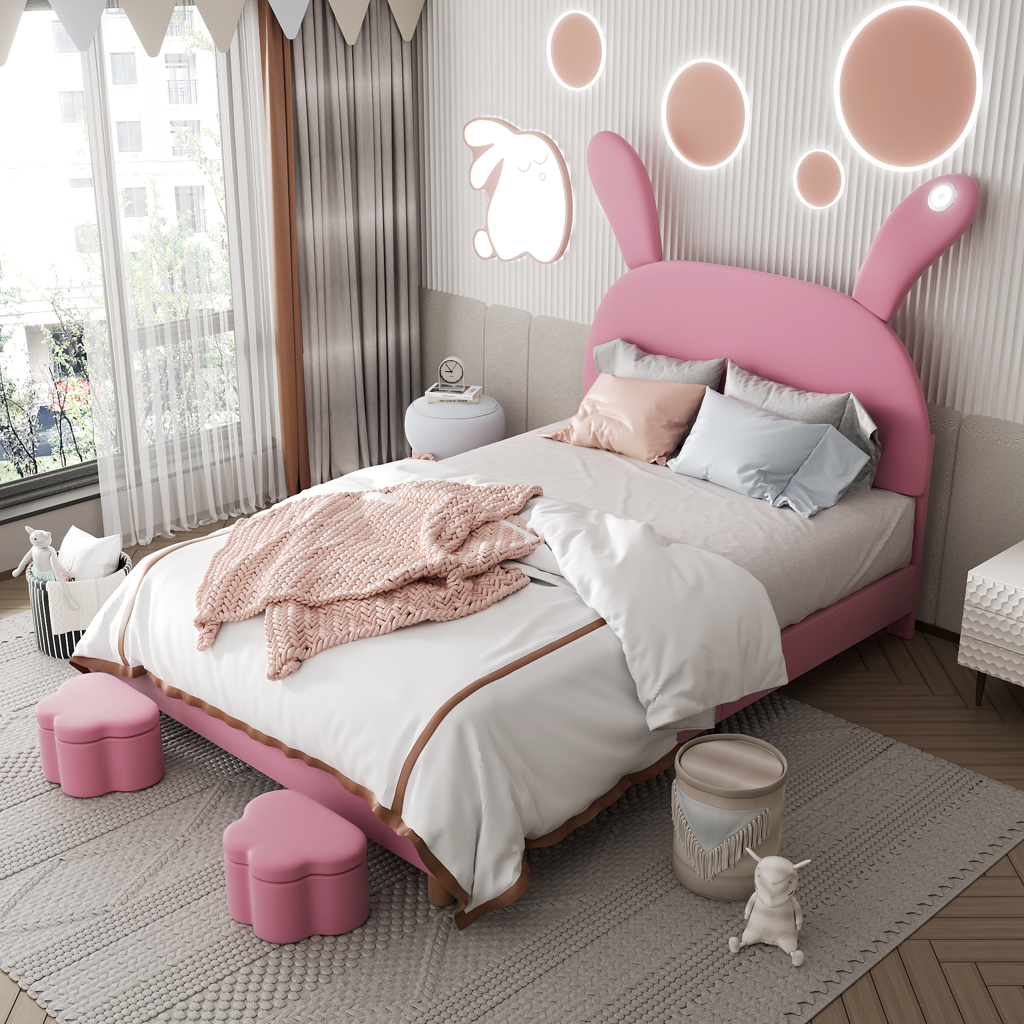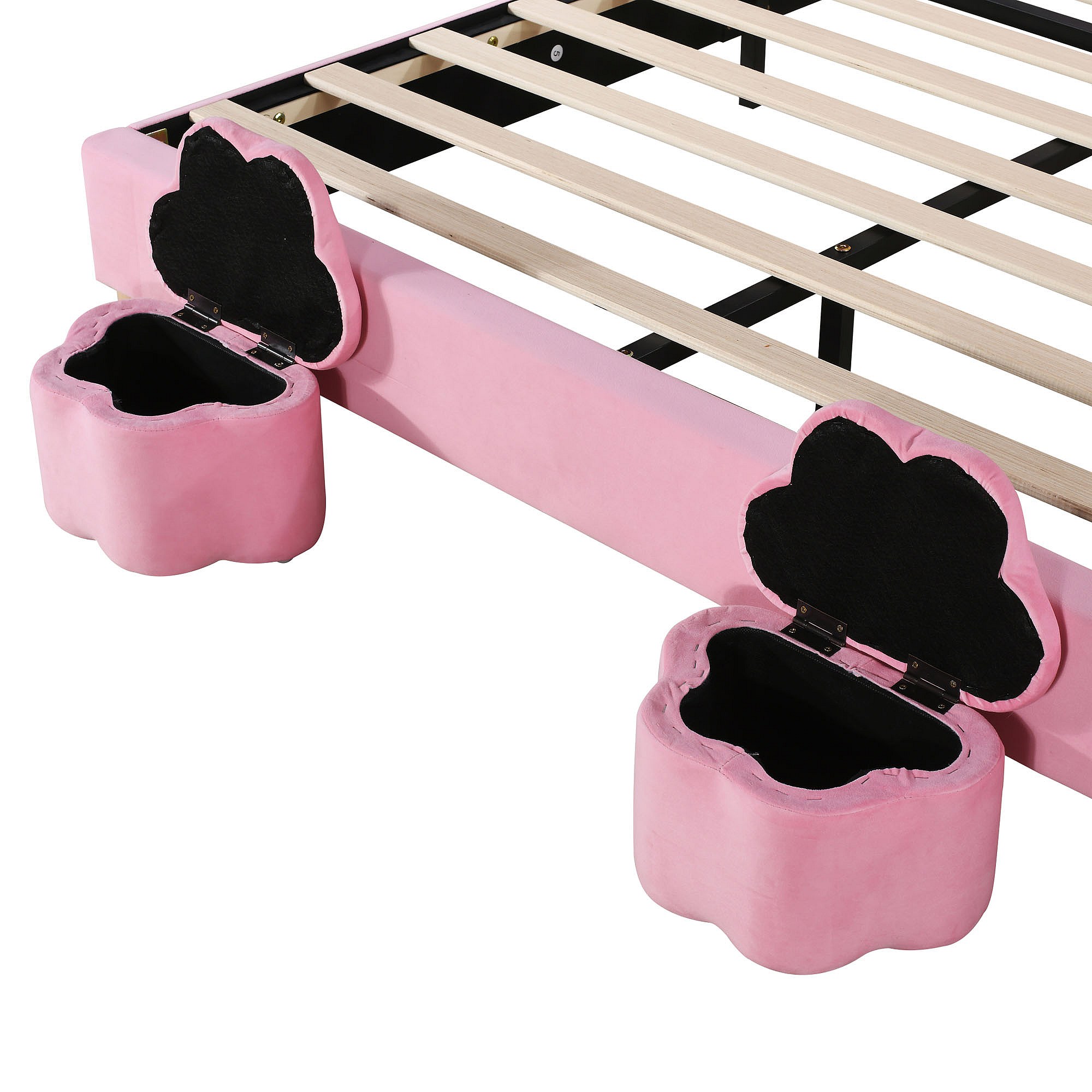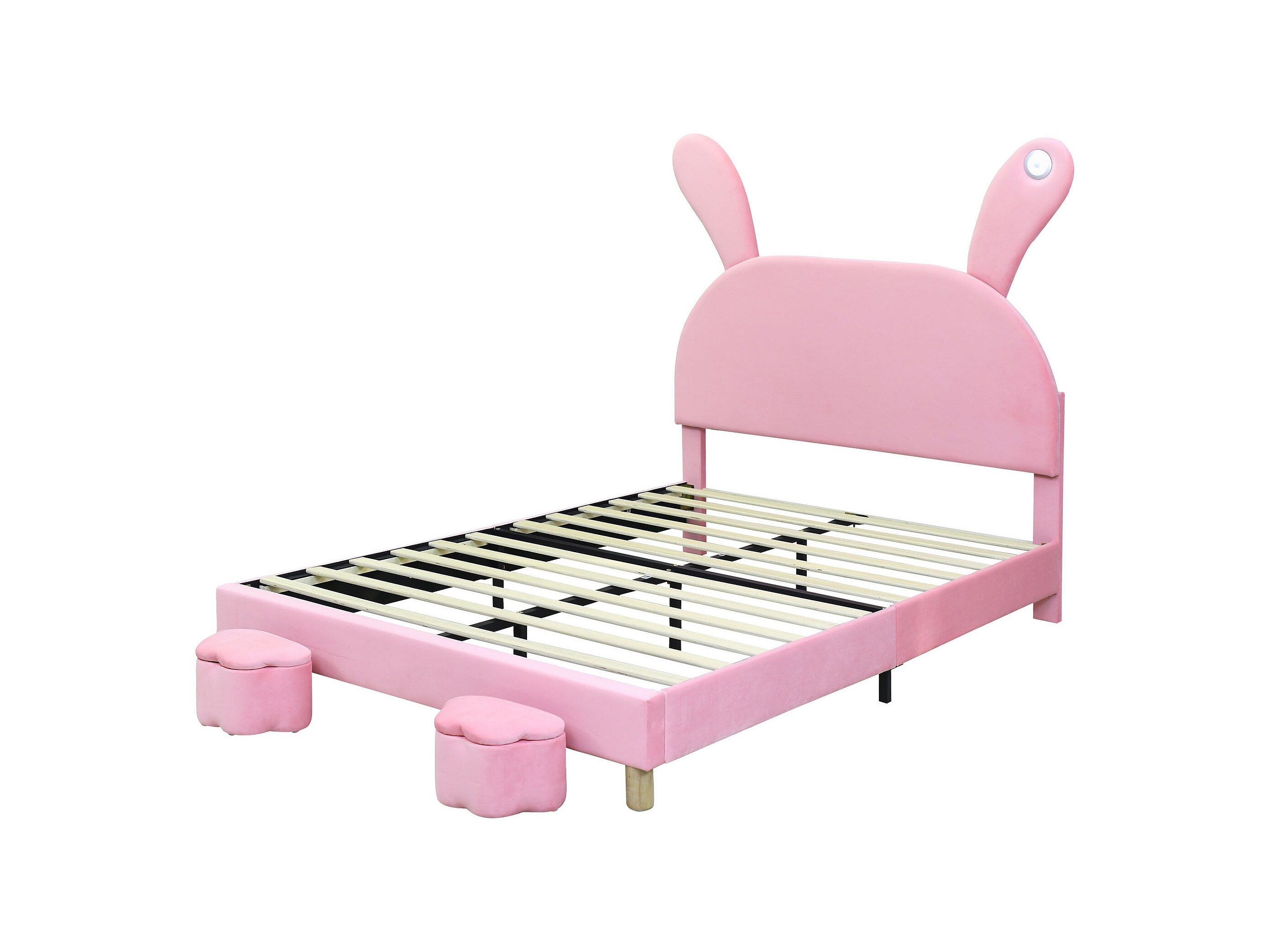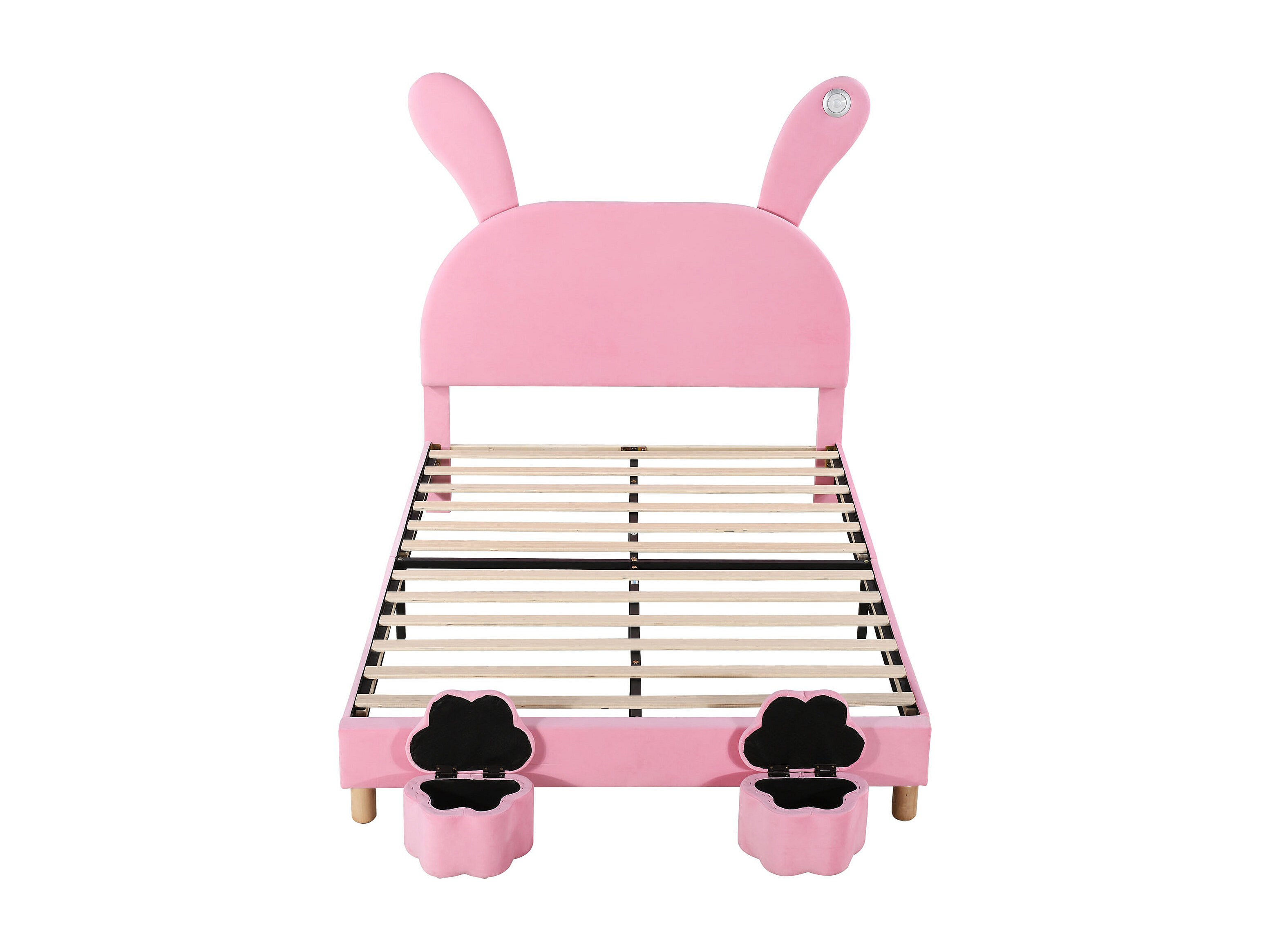 Lit avec rangement 140x200 cm, en velours rose, avec deux bancs de rangement et éclairage LED