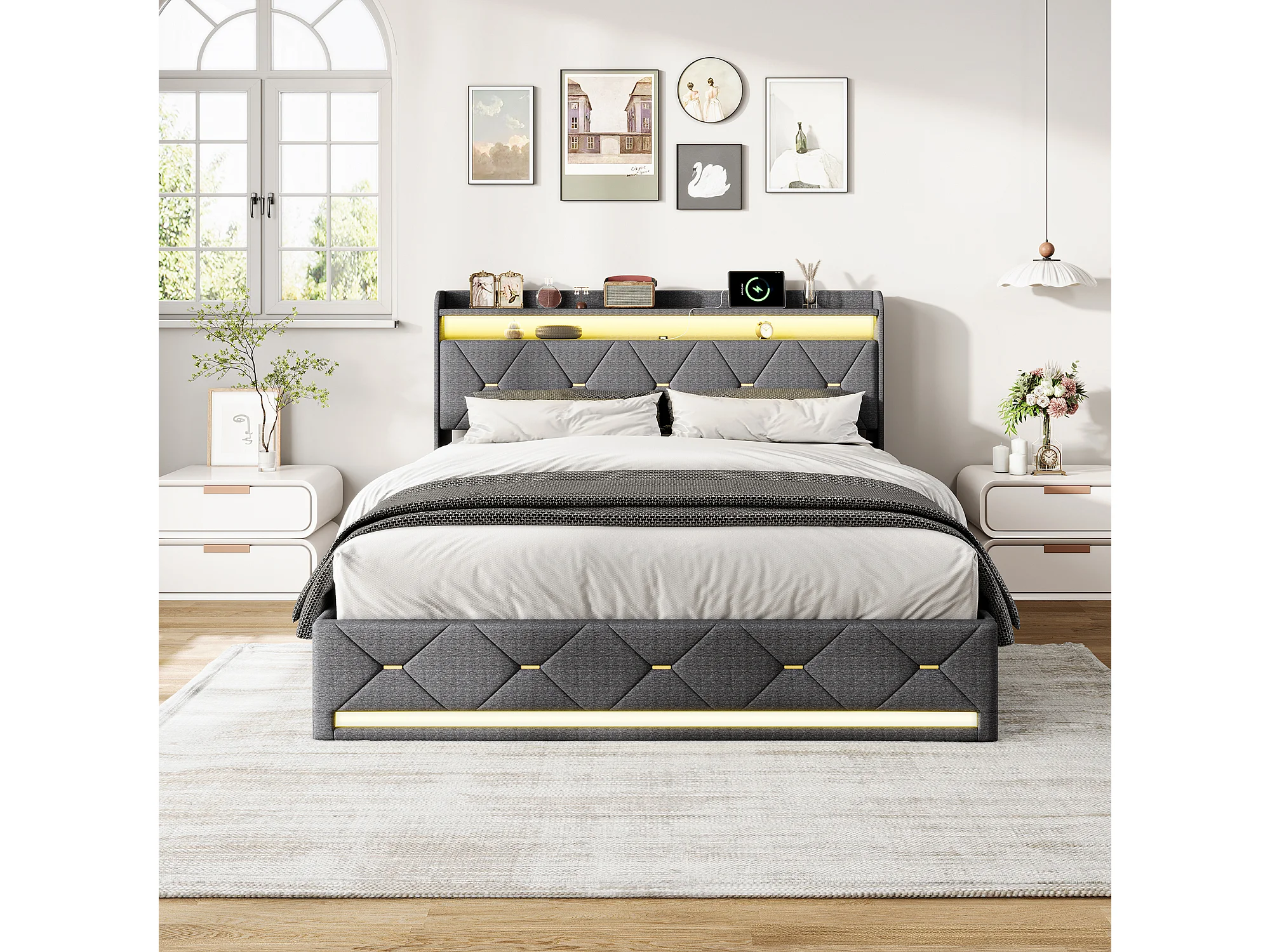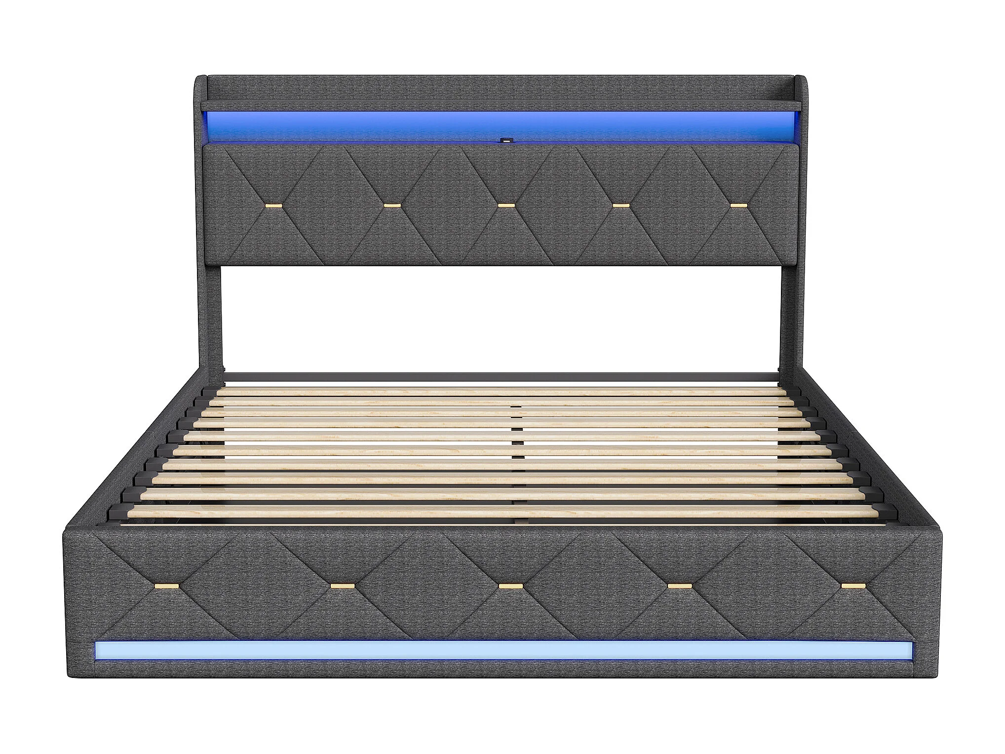 Lit avec rangement - 160 x 200 cm - Cadre de lit avec éclairage RGB LED - Décoration bouton doré - lin - gris