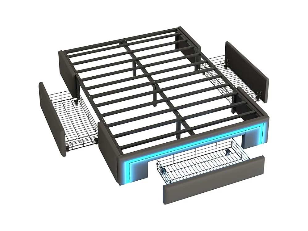 lit avec rangement 160x200 avec tiroirs lit en cuir PU sans tête de lit Avec bandeau lumineux LED sommier à lattes métalliques gris