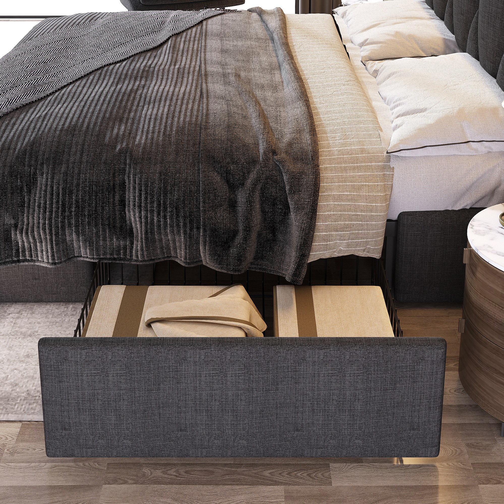 Lit avec rangement 160x200 cm en gris, tête de lit avec prises USB et 4 tiroirs pratiques