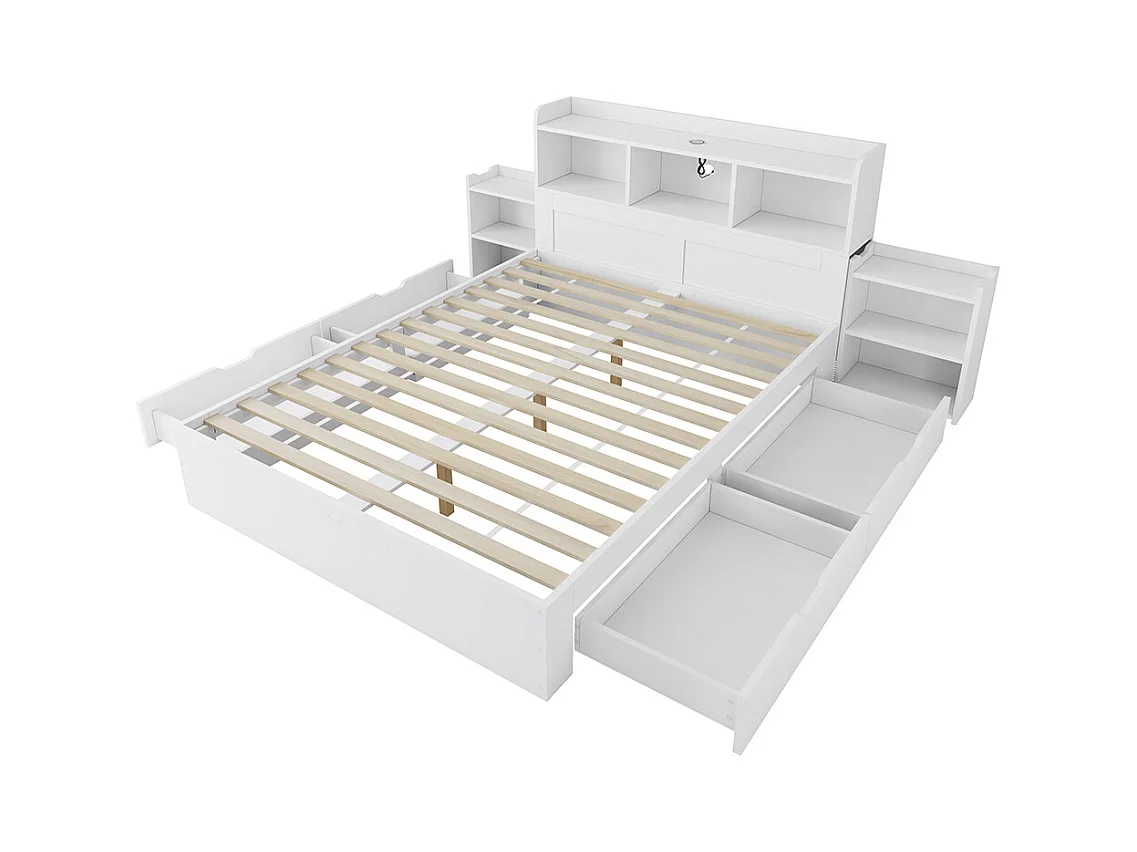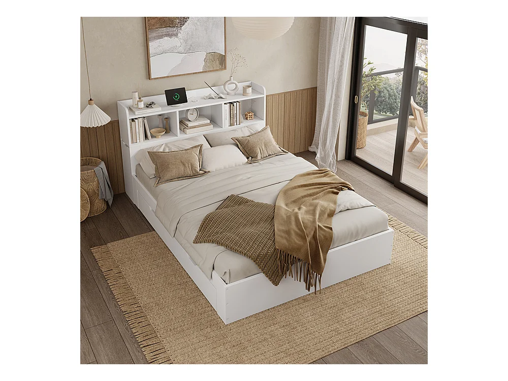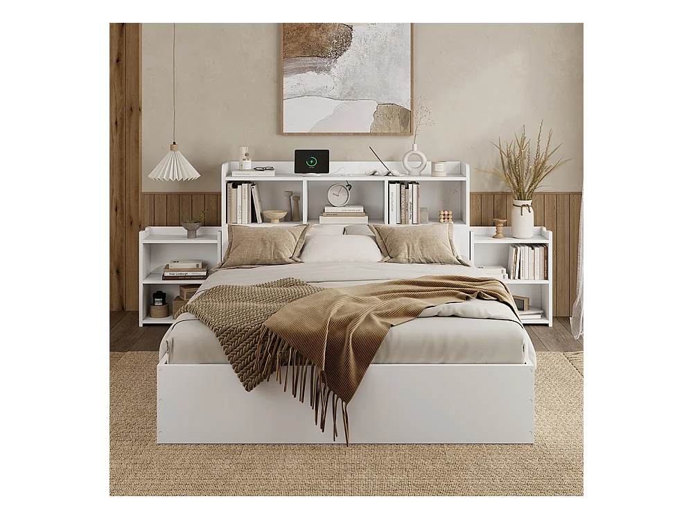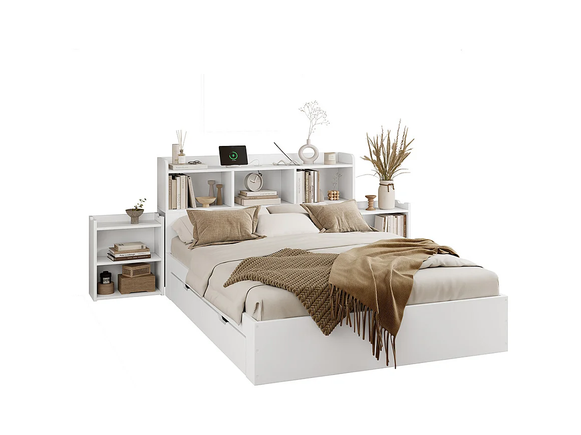 lit avec rangement bois 140x200 avec sommier lattes tête de lit 2 tables chevet coulissantes rangement recharge USB-C et sans fil tiroirs blanc