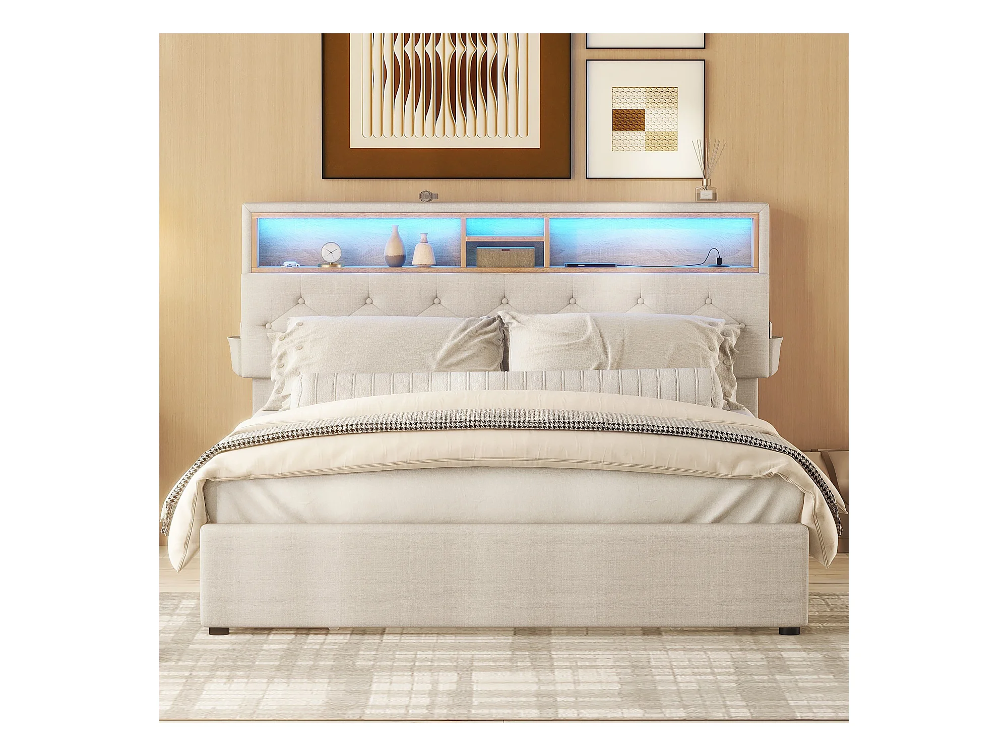 Lit avec rangement de tête de lit - 140 x 200 cm - 4 tiroirs - LEDs - beige
