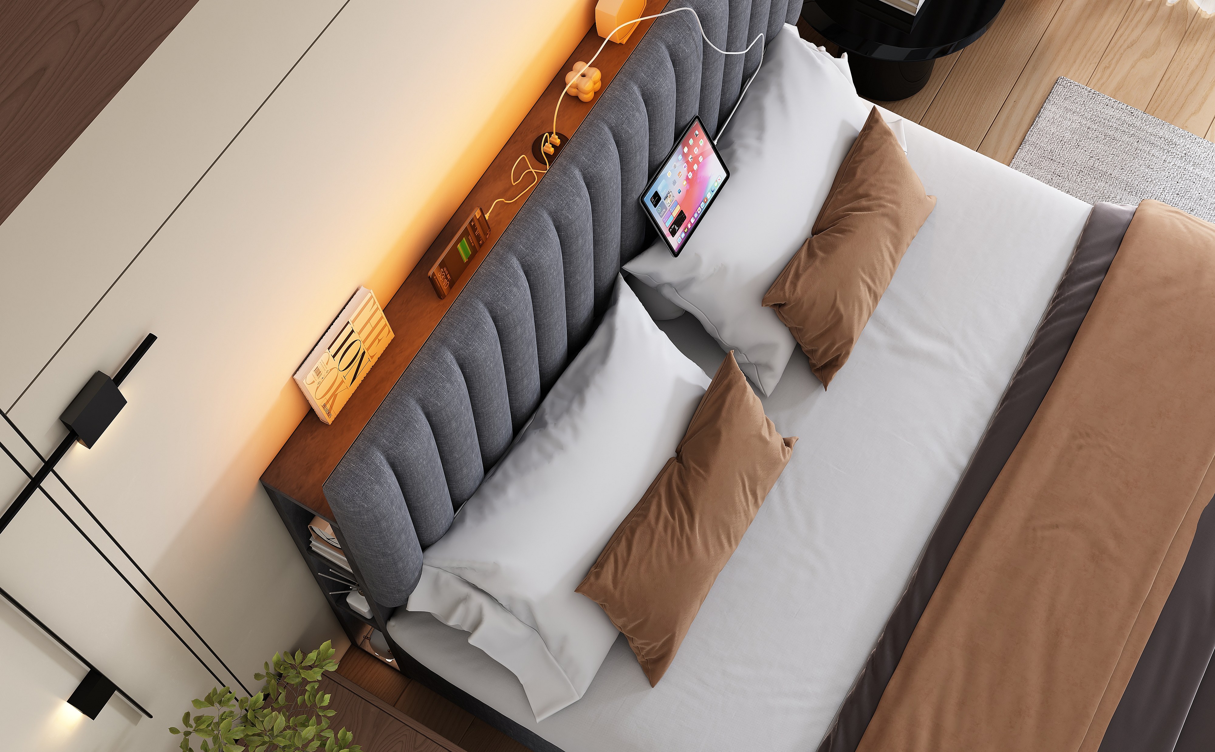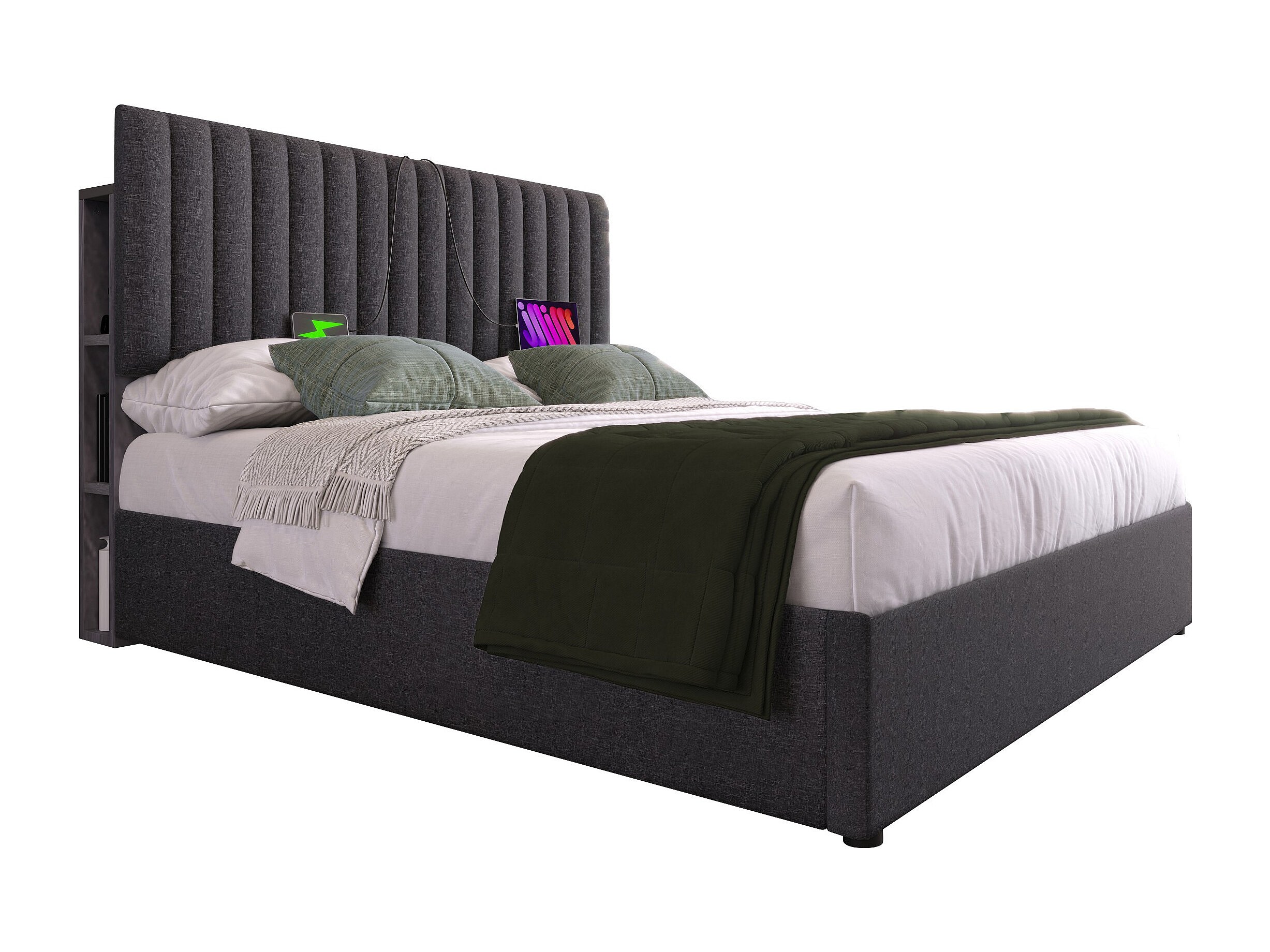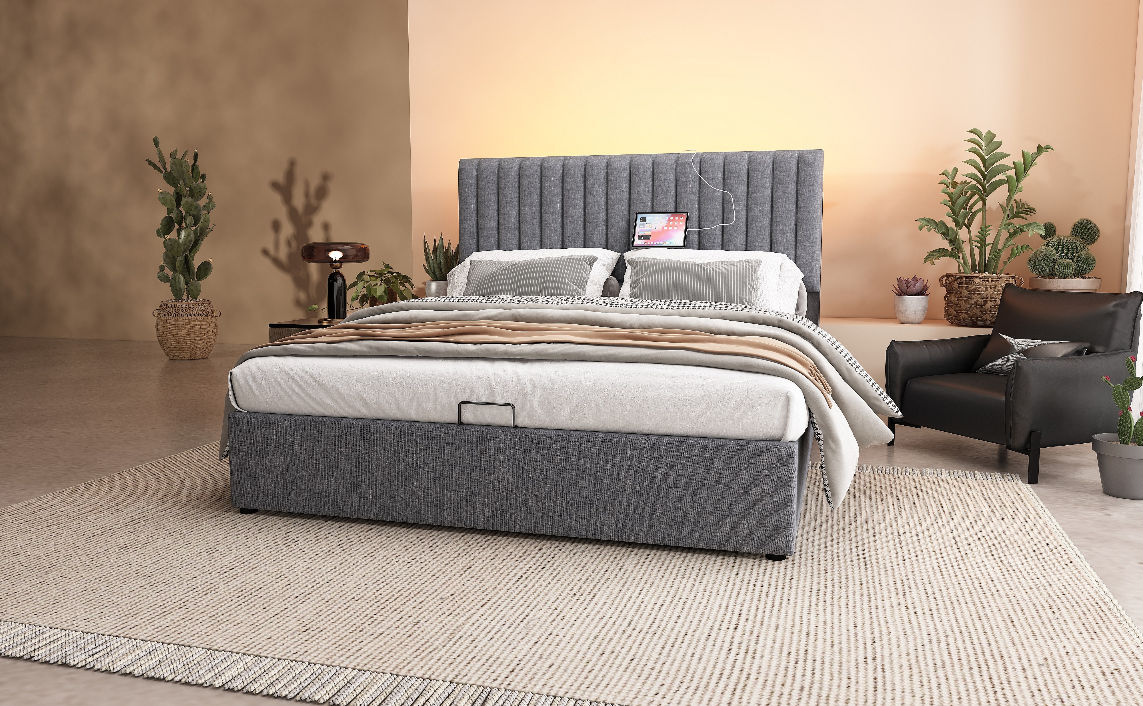 Lit avec rangement et tête de lit LED, 140x200 cm, gris, avec ports USB et Type-C