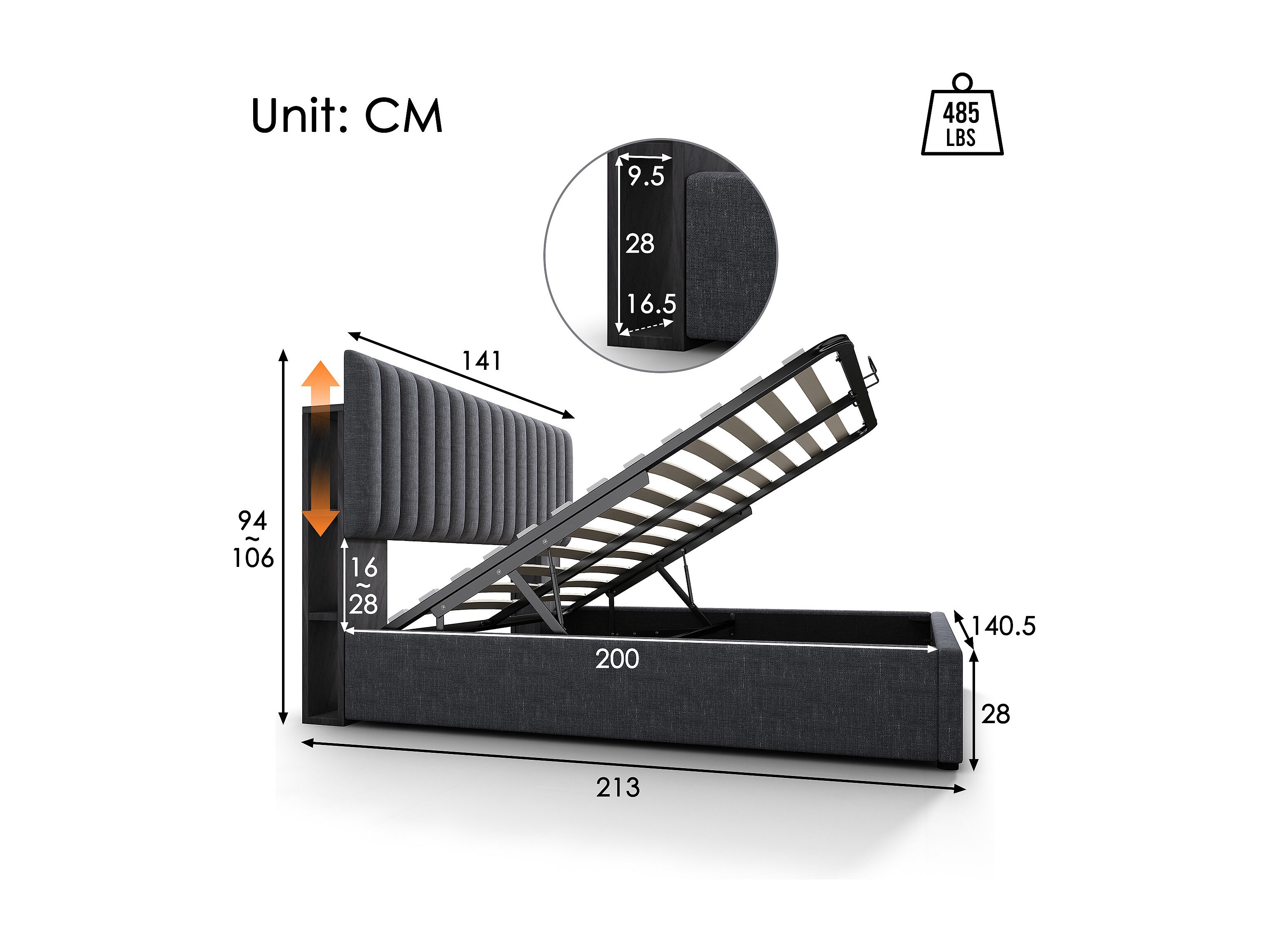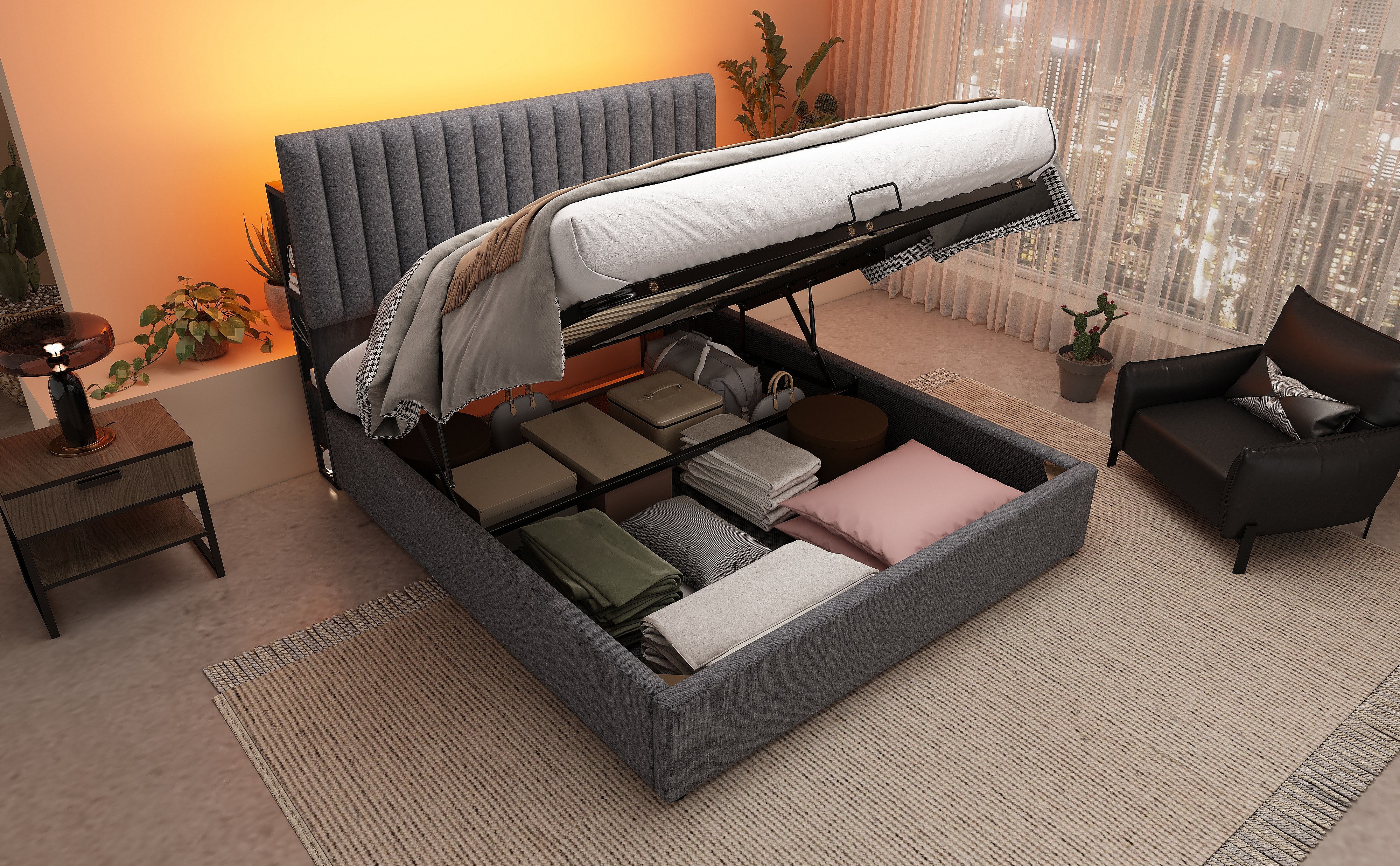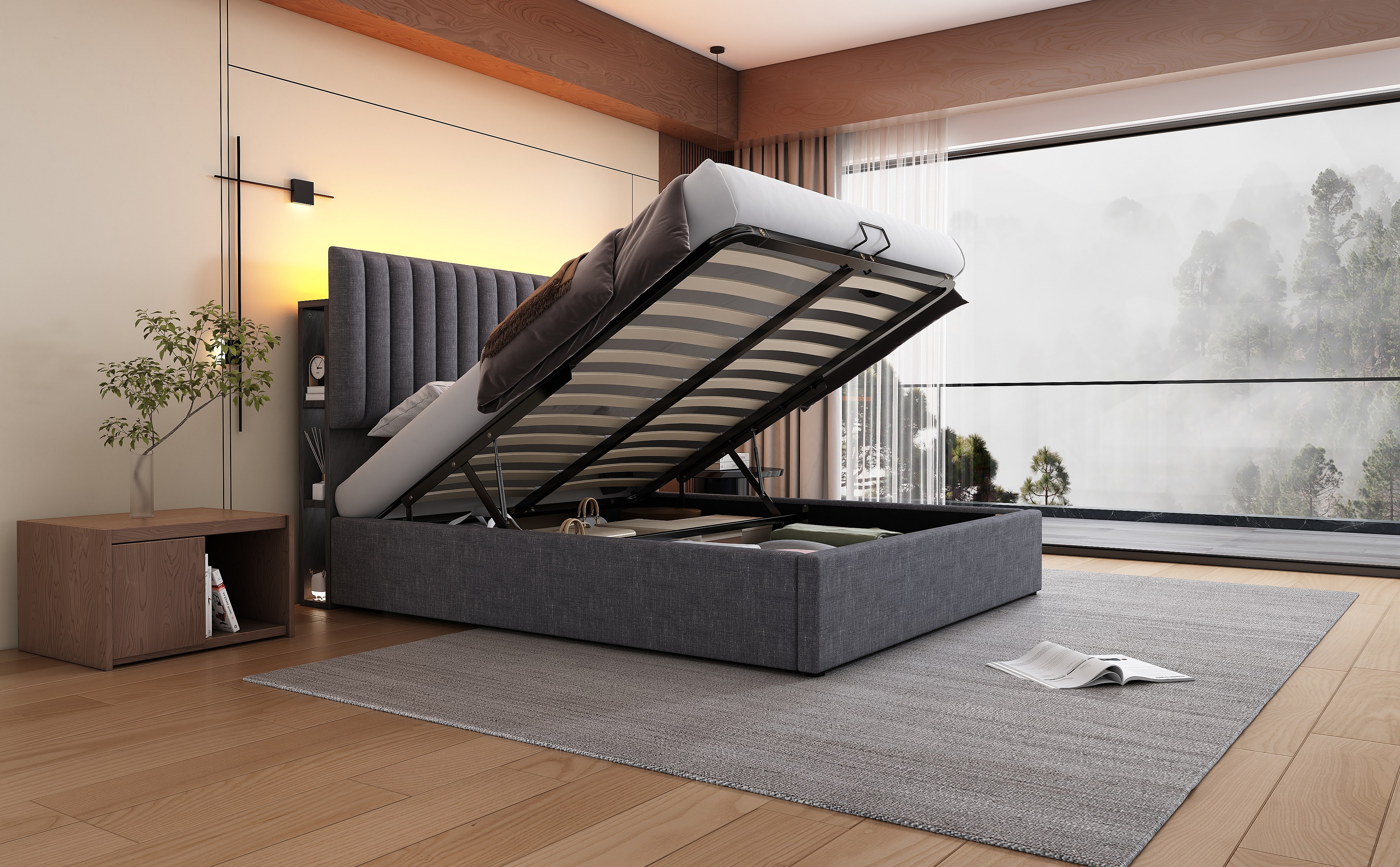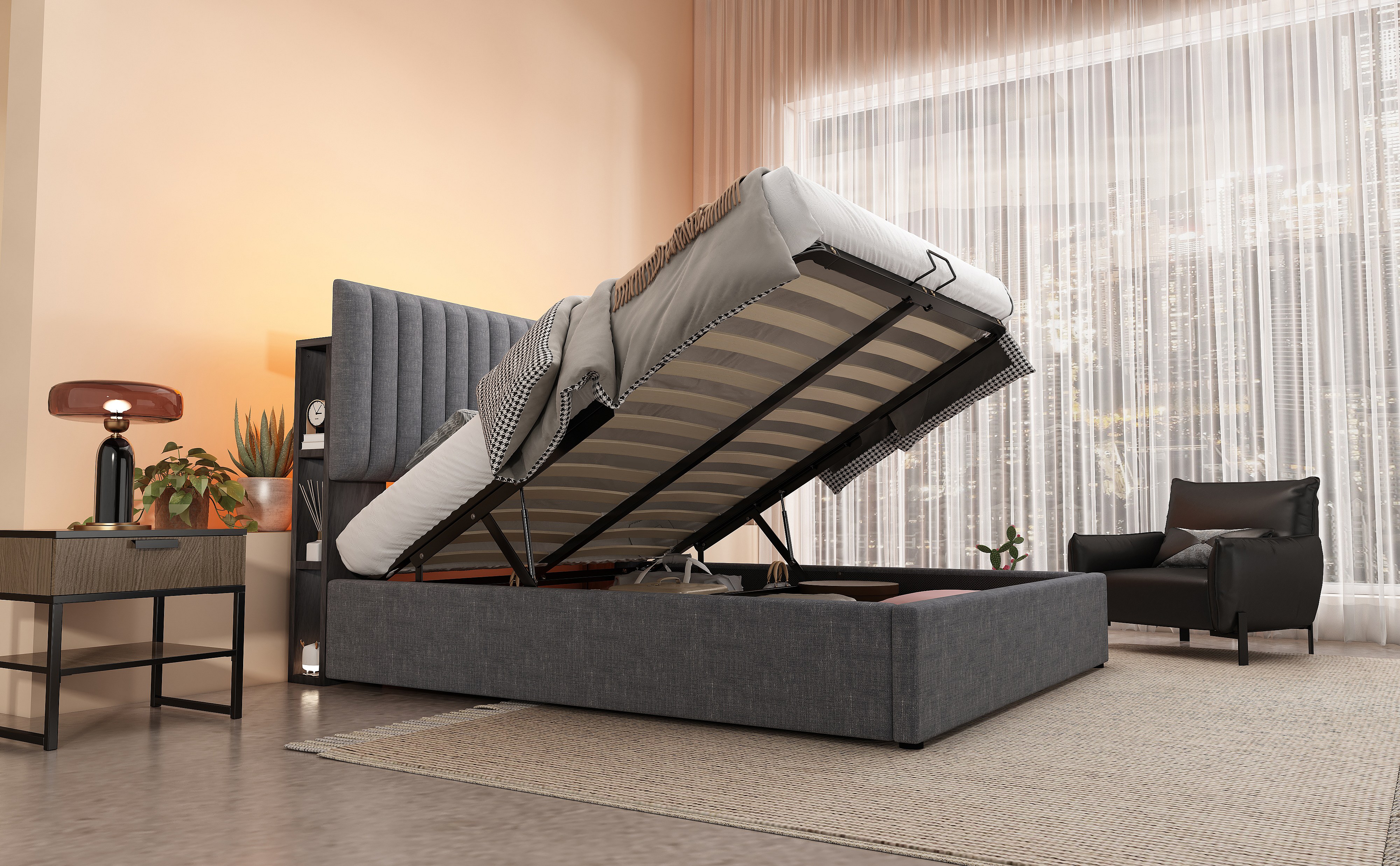 Lit avec rangement et tête de lit LED, 140x200 cm, gris, avec ports USB et Type-C