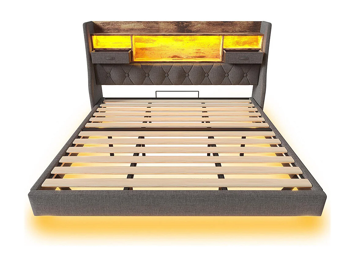 lit avec rangement rembourré 180x200 cm suspendu éclairage LED tête lit station recharge 1 Type-C 3 USB double moderne tête lit lin gris