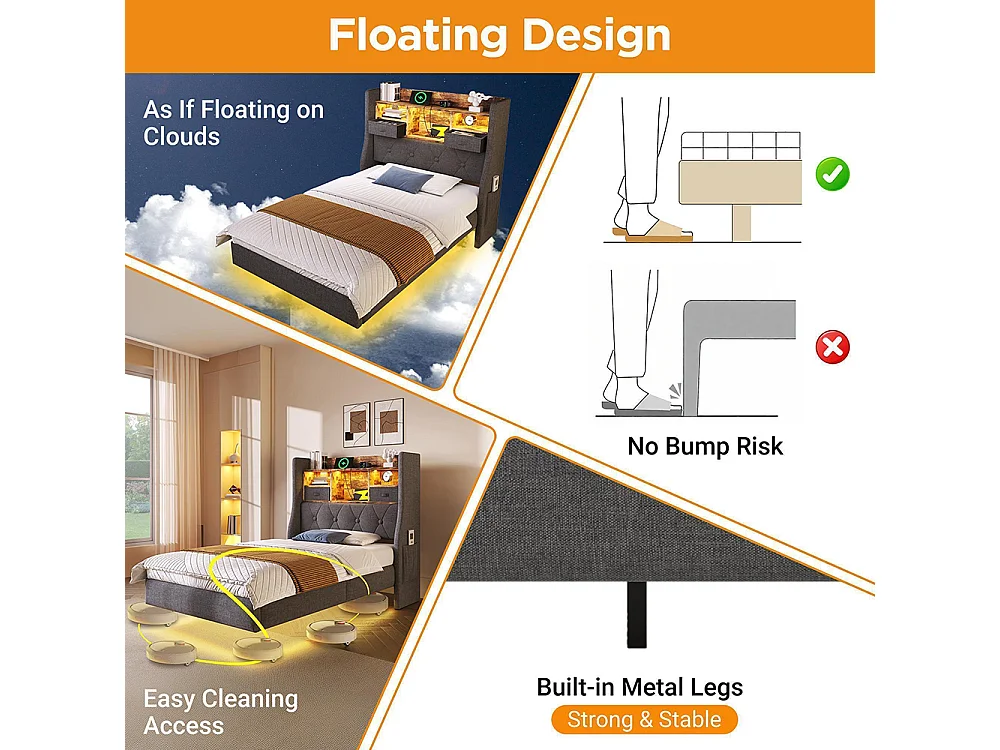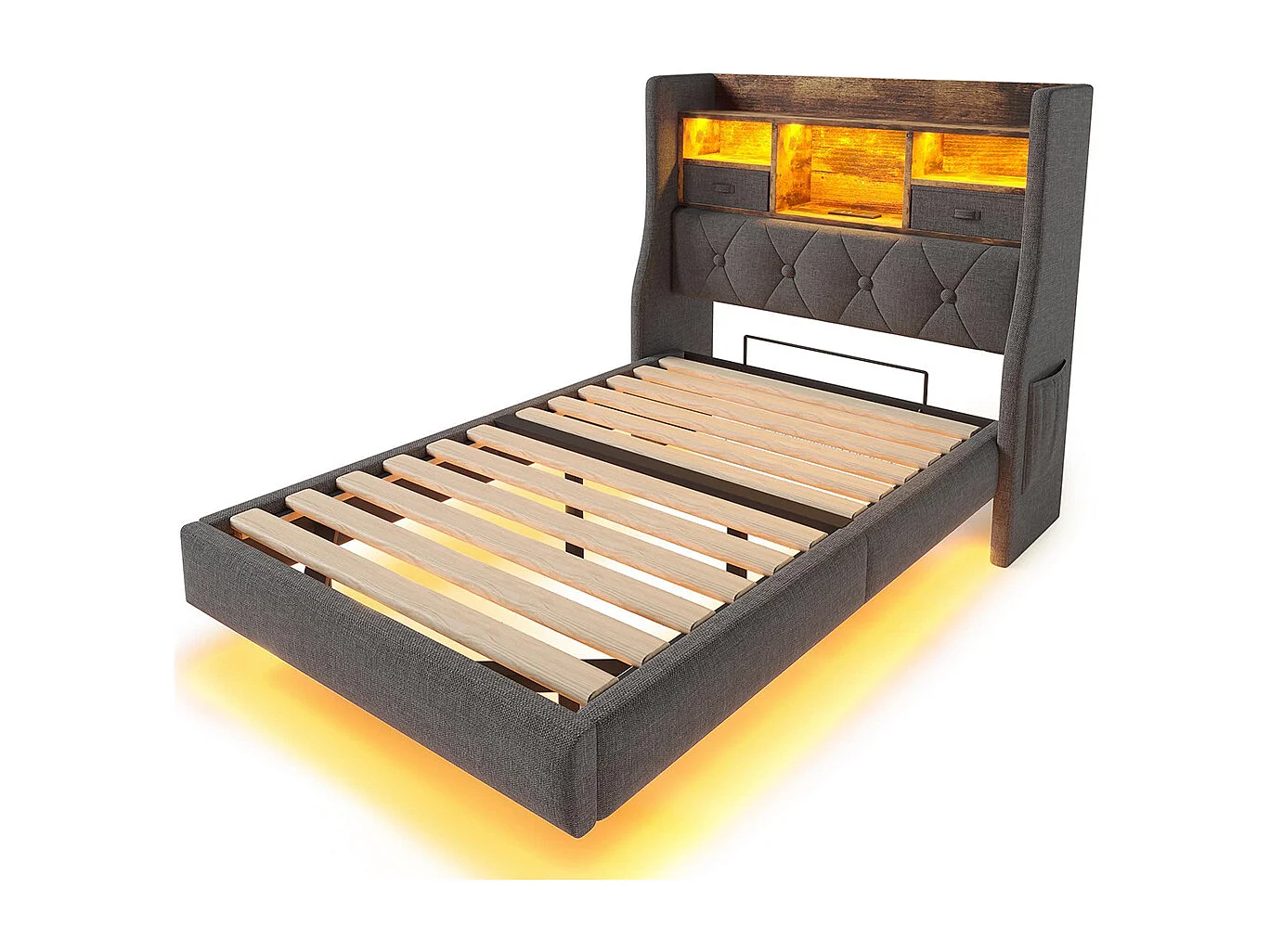 lit avec rangement rembourré 90x200 cm suspendu éclairage LED tête lit station recharge 1 Type-C 3 USB lin gris avec matelas