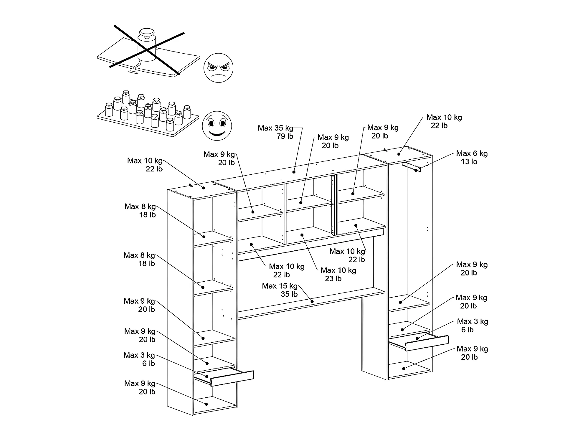 Lit pont 160 x 200 cm avec rangements - Avec LEDs - Coloris : Naturel et noir + Sommier + Matelas - VELONA