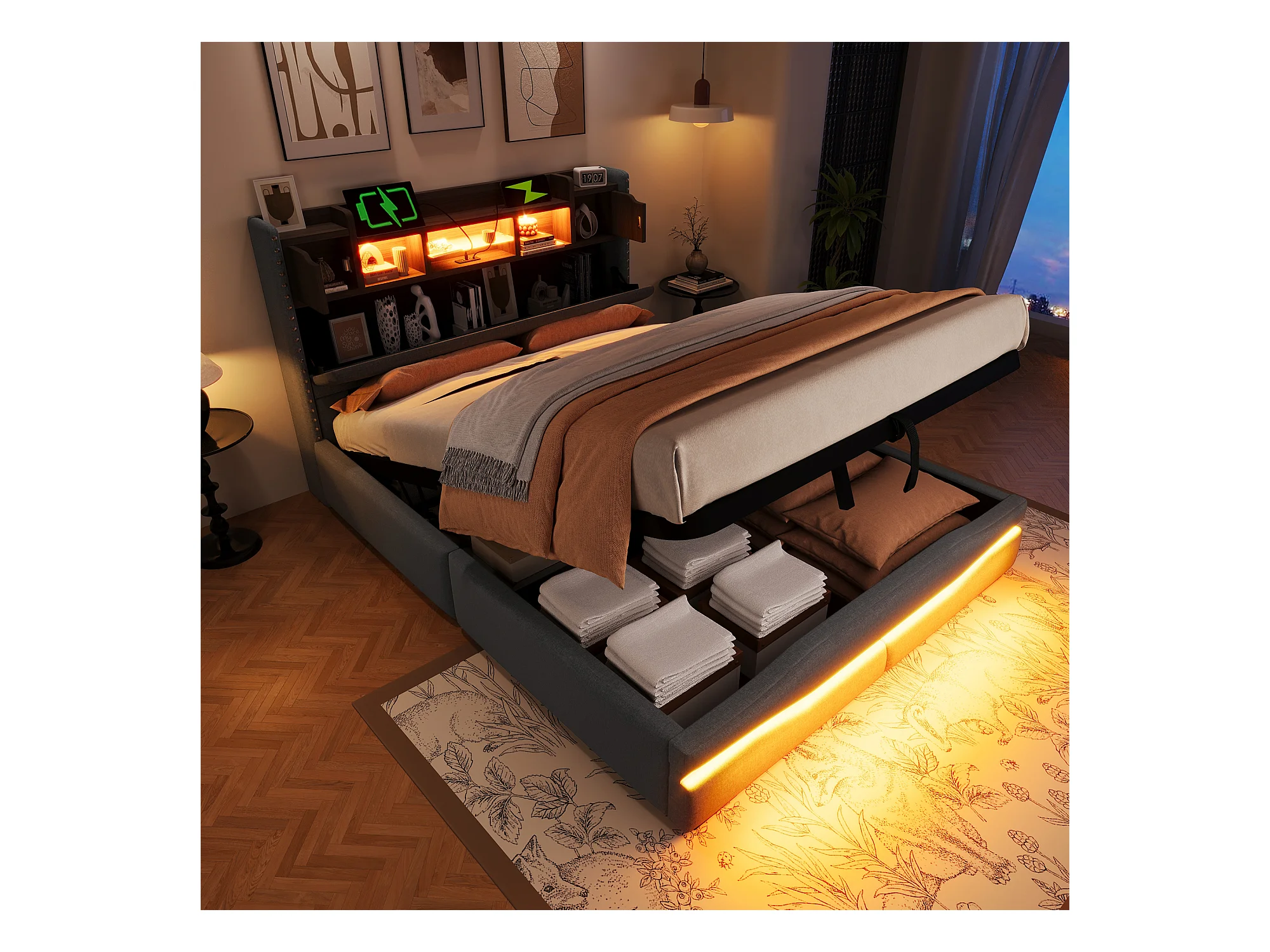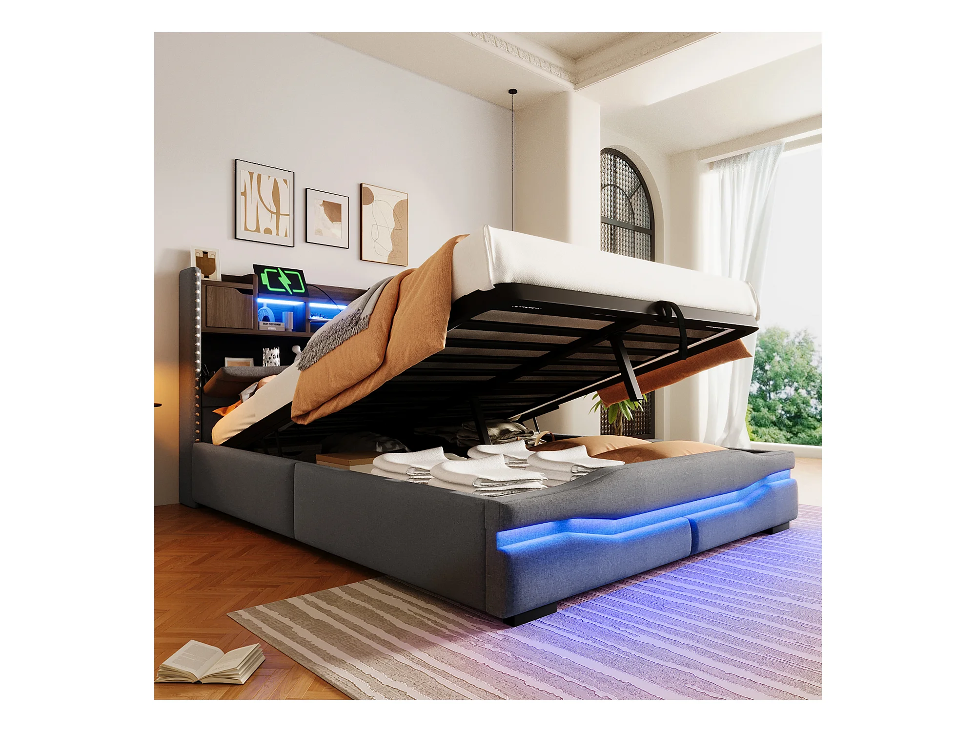 Lit avec Tiroir et LED, 140 x 200 cm, Design Moderne, Lin + MDF, Gris, Éclairage Ambiance Télécommande (222x166x111 cm)