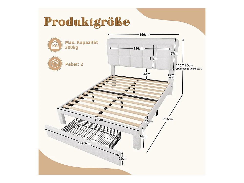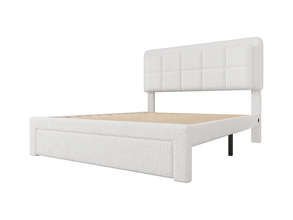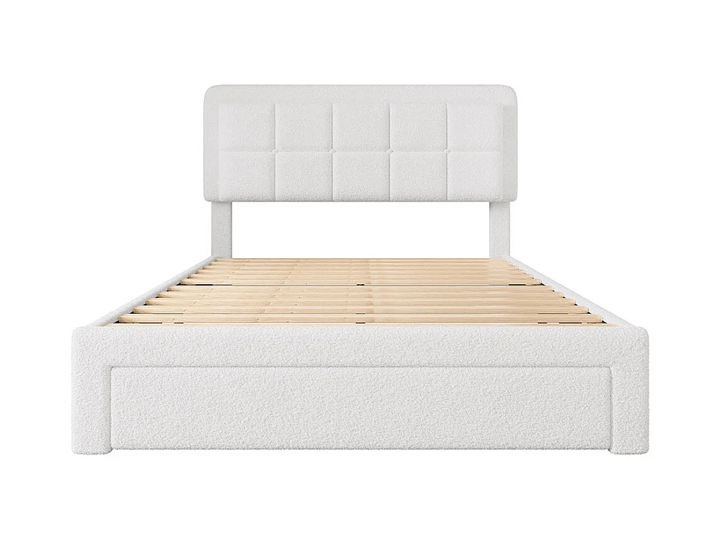 Lit avec tiroir moderne 160x200 avec revêtement en velours Teddy structure en fer et bois tête de lit réglable éclairage d'ambiance réglable port USB blanc