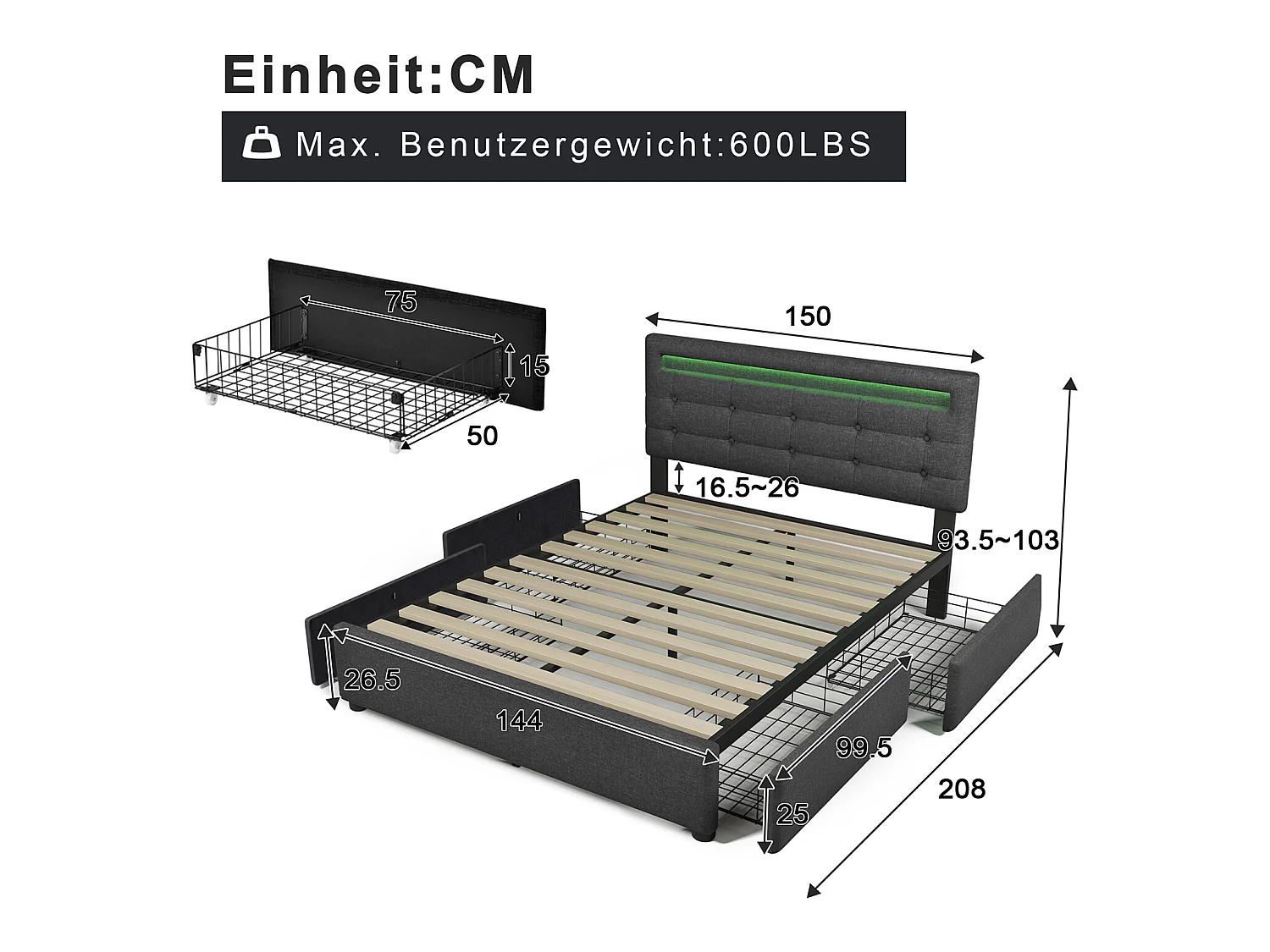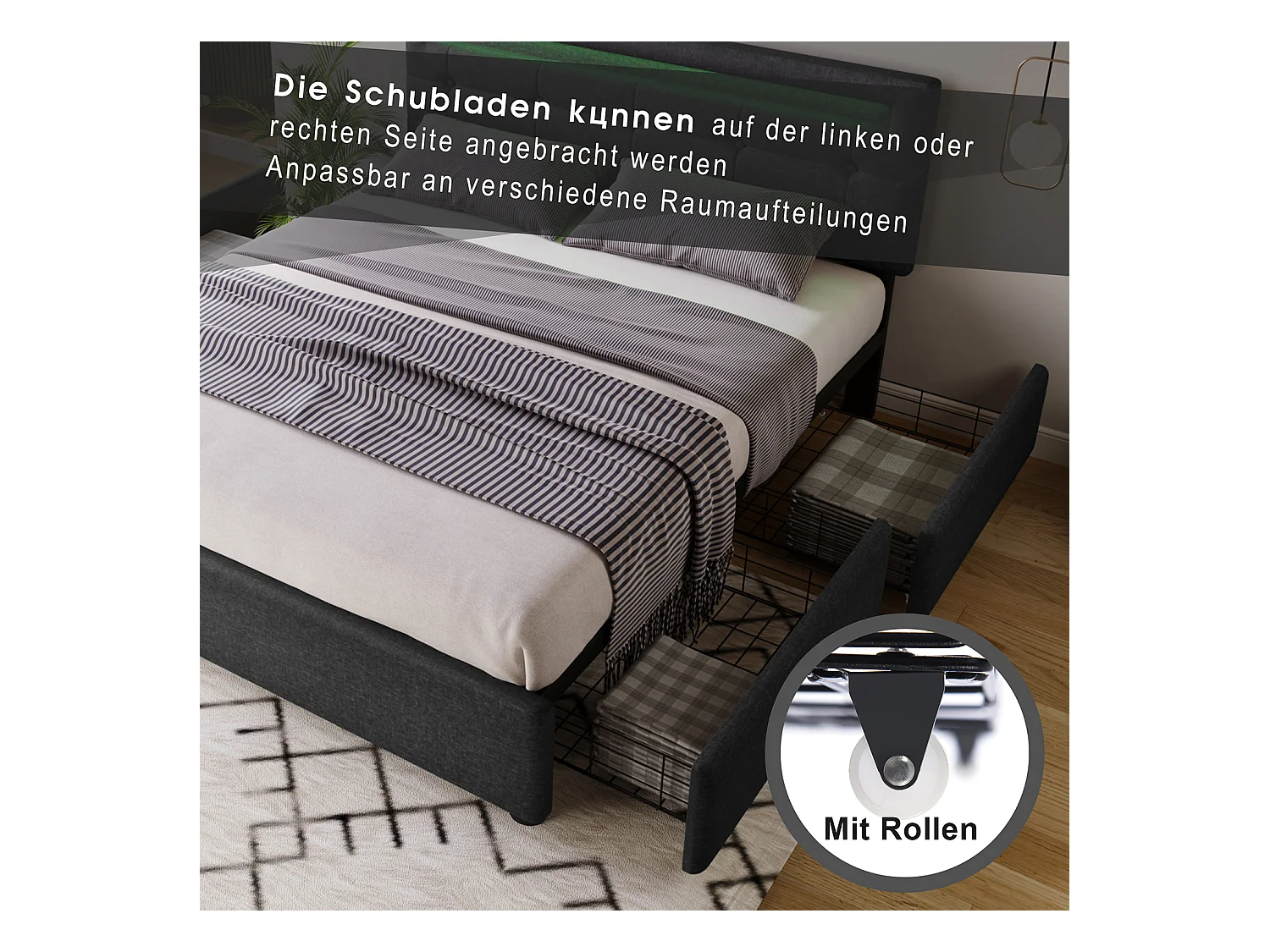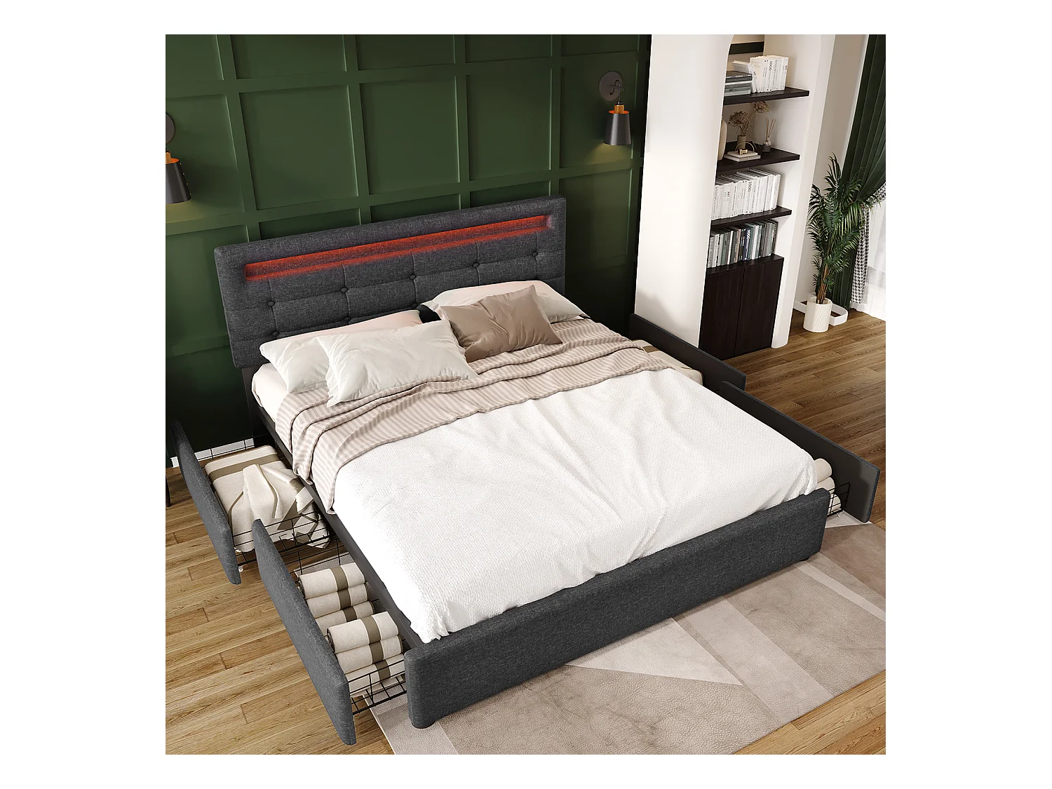 Lit avec tiroirs - 140x200cm avec éclairage LED et 4 tiroirs Gris (sans matelas) - Sweiko