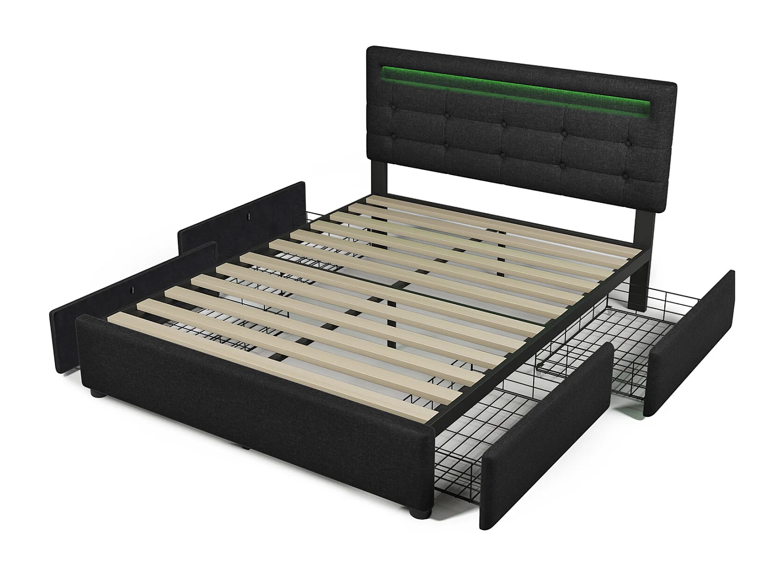 Lit avec tiroirs - 140x200cm avec éclairage LED et 4 tiroirs Noir (sans matelas) - Sweiko