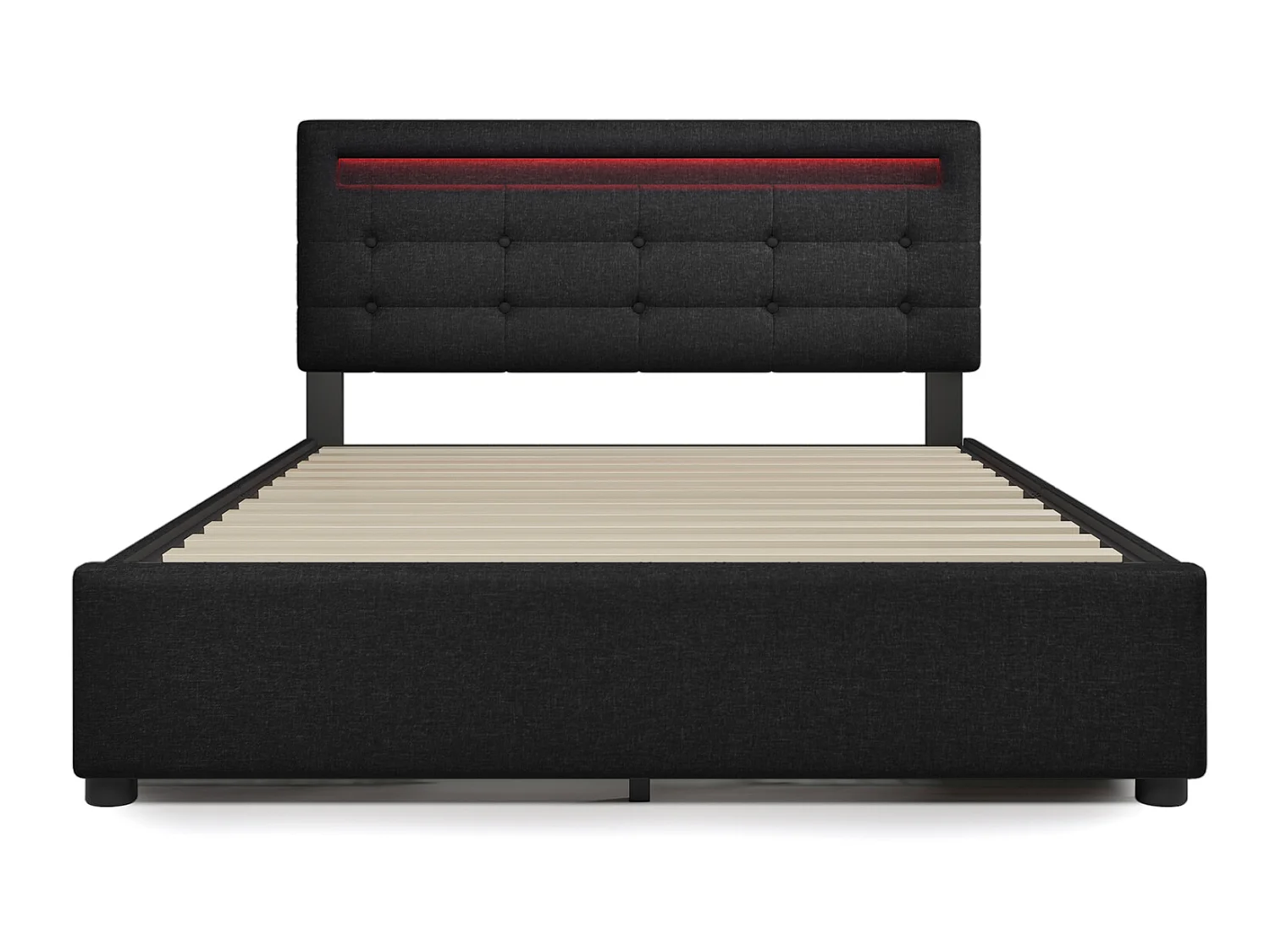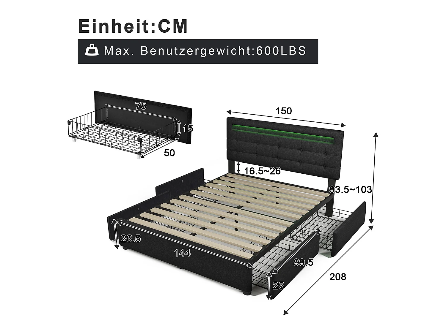 Lit avec tiroirs - 140x200cm avec éclairage LED et 4 tiroirs - Noir - Sweiko