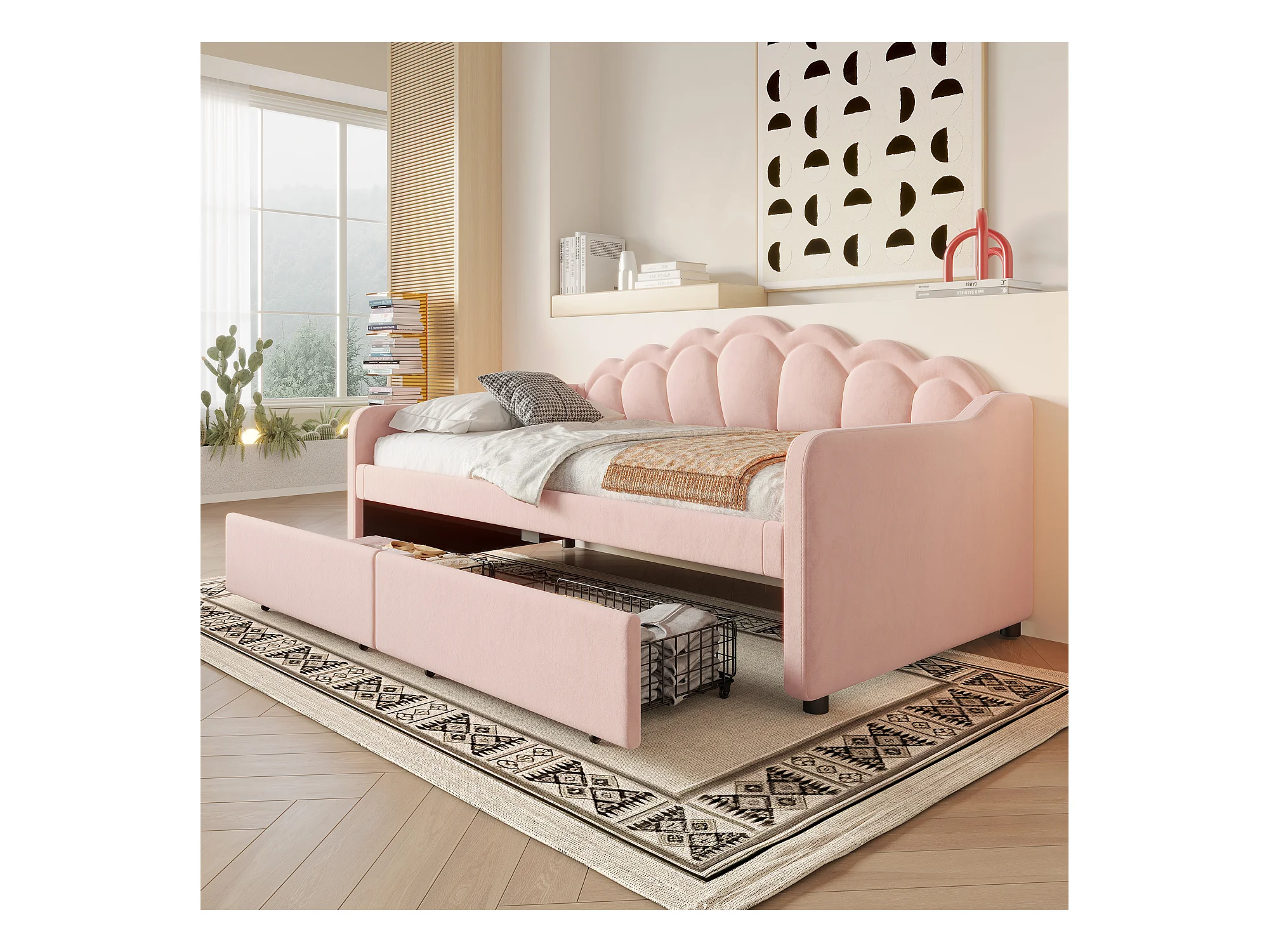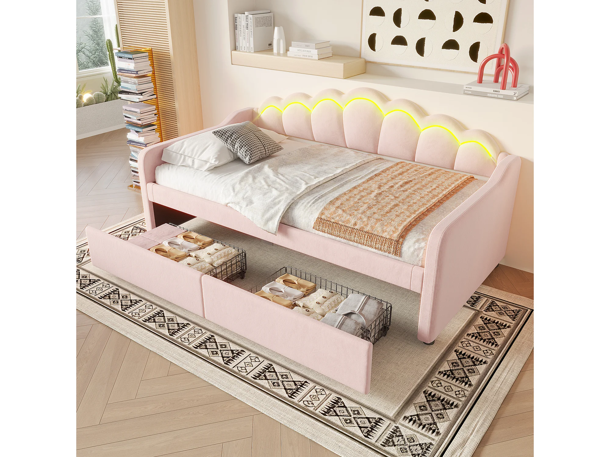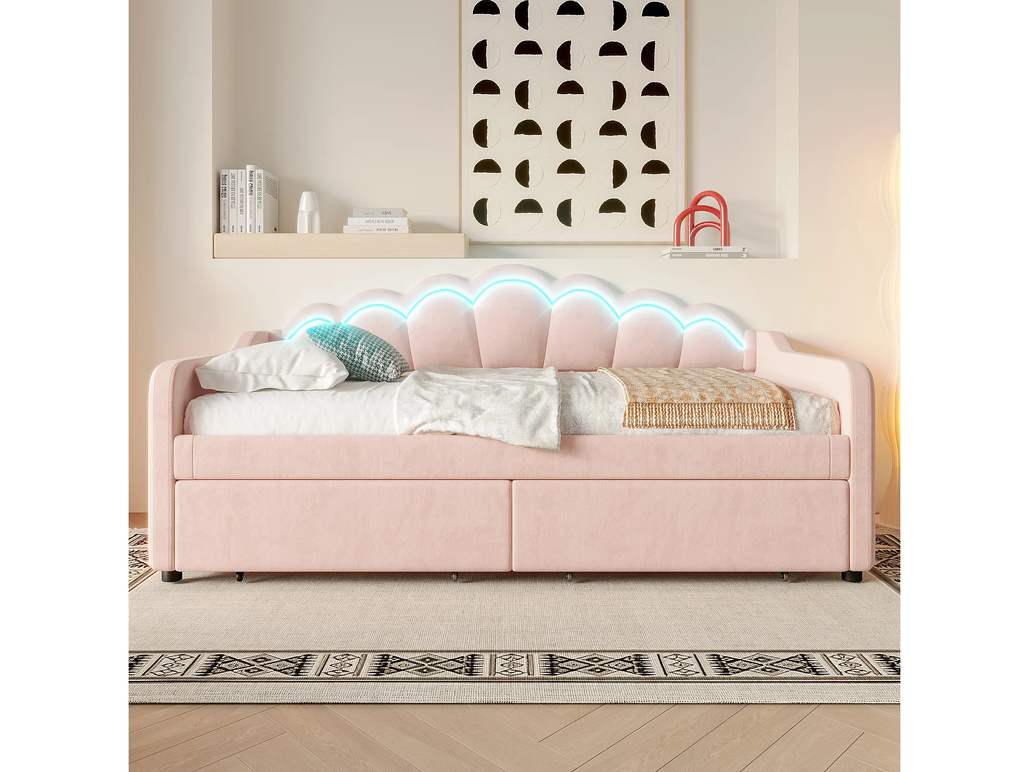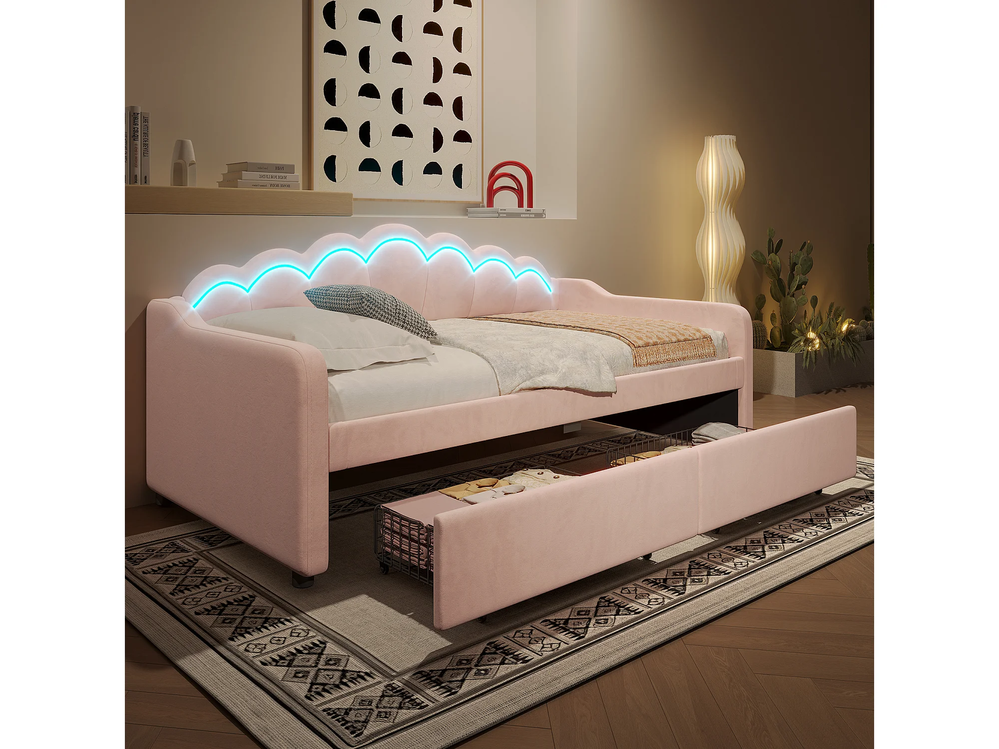 Lit avec tiroirs de rangement, canapé-lit, lit 90x200cm, en velours, avec bande LED changeant de couleur, rose (214x98x87 cm)