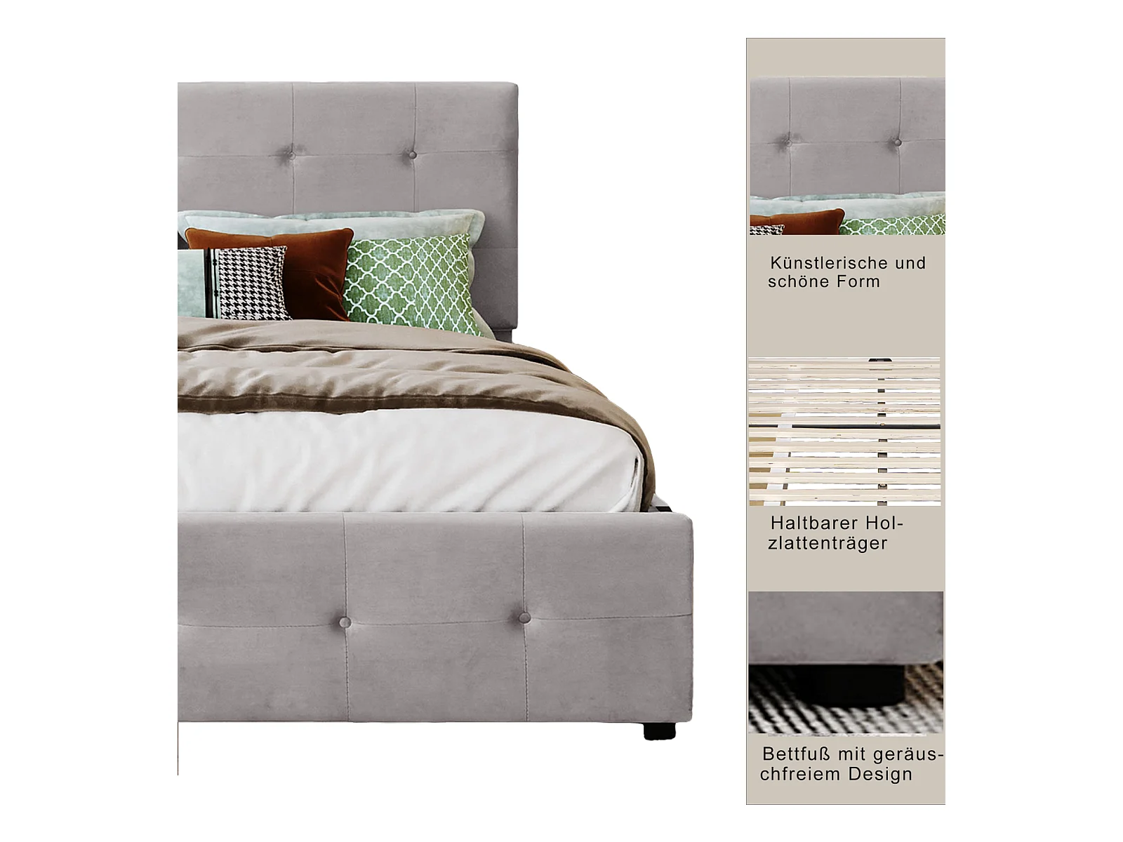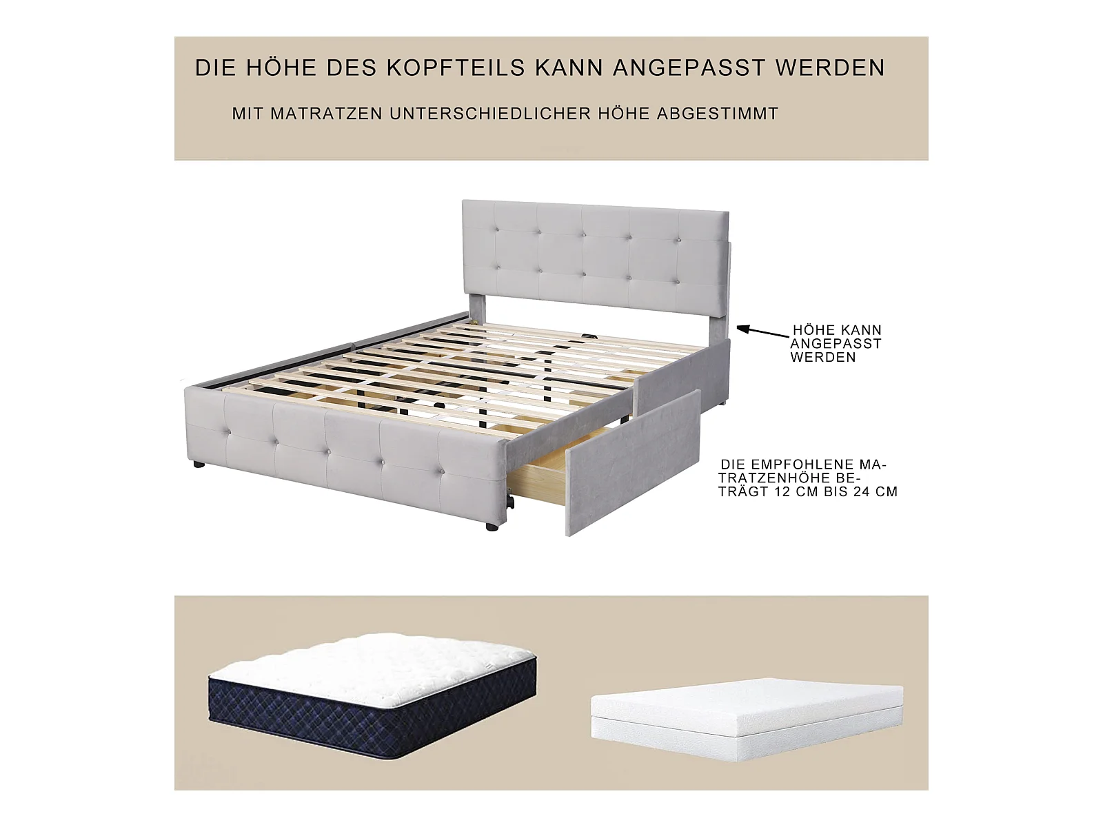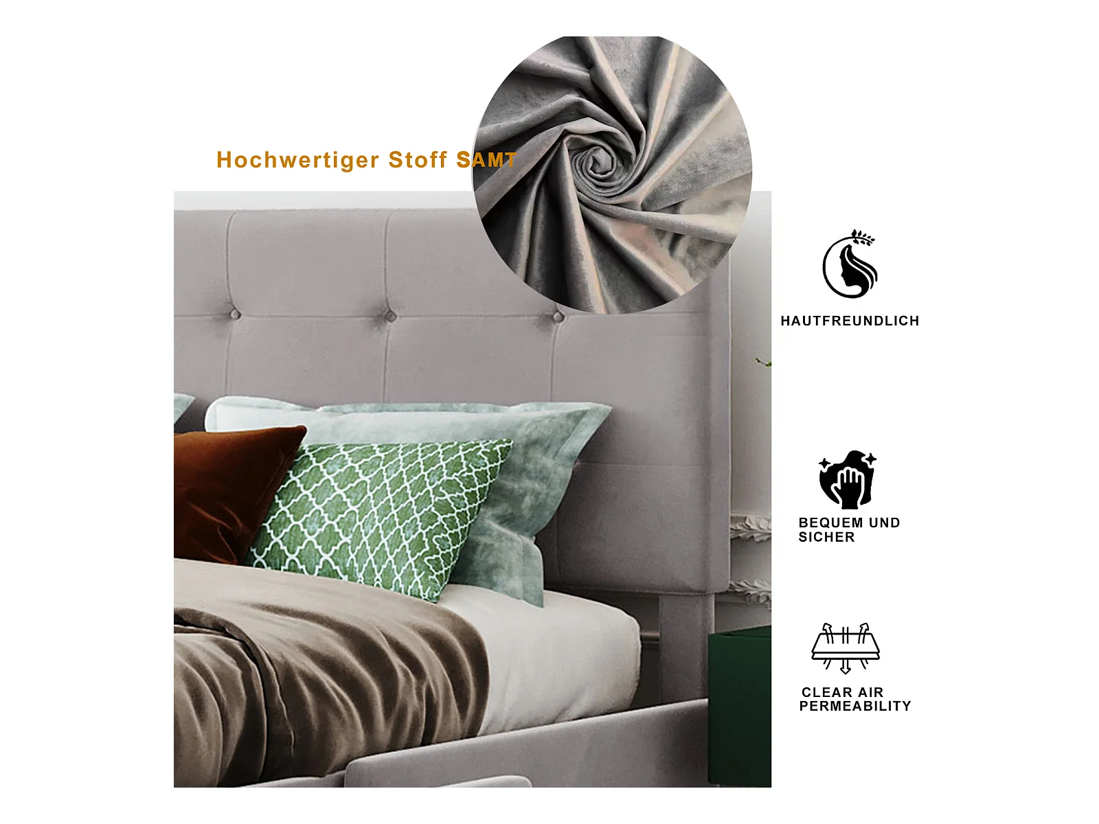 Lit avec tiroirs double capitonné 140 x 200 cm - avec 4 tiroirs, sommier à lattes, tête de lit, velours, style scandinave -lit adulte Gris
