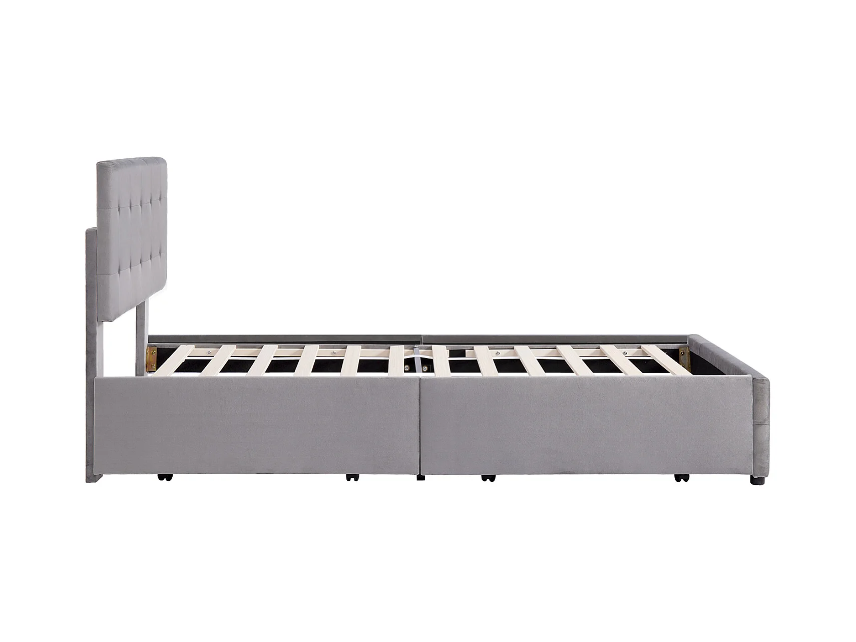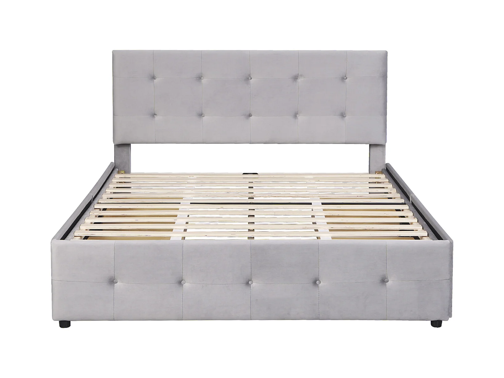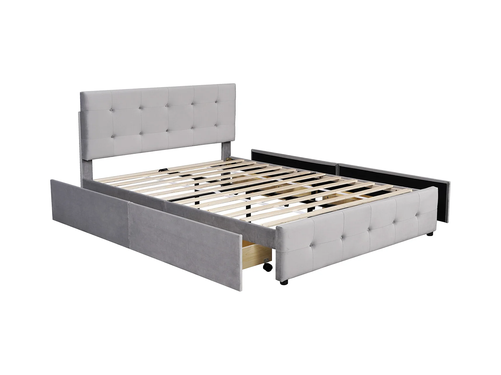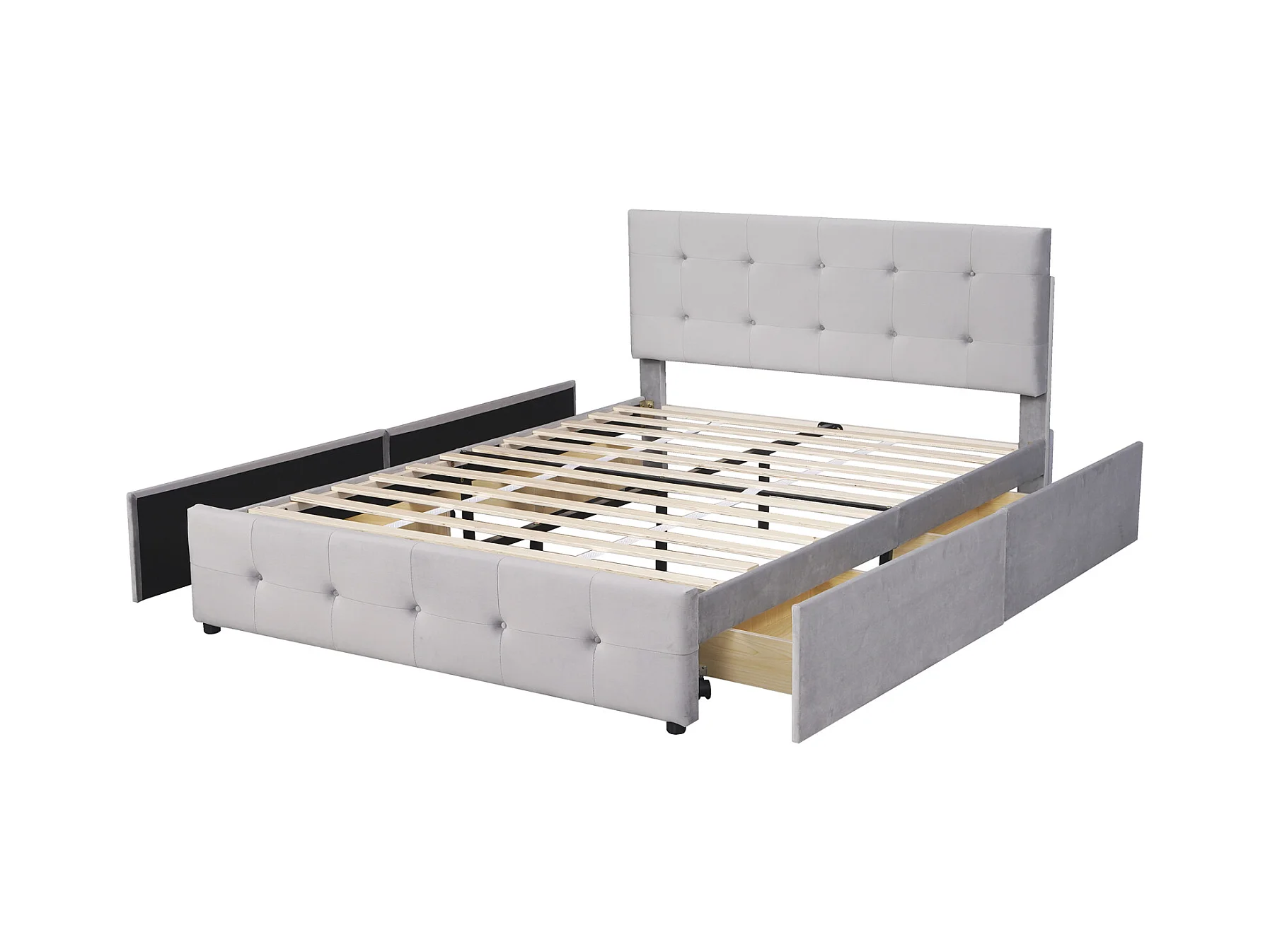Lit avec tiroirs double capitonné 140 x 200 cm - avec 4 tiroirs, sommier à lattes, tête de lit, velours, style scandinave -lit adulte Gris