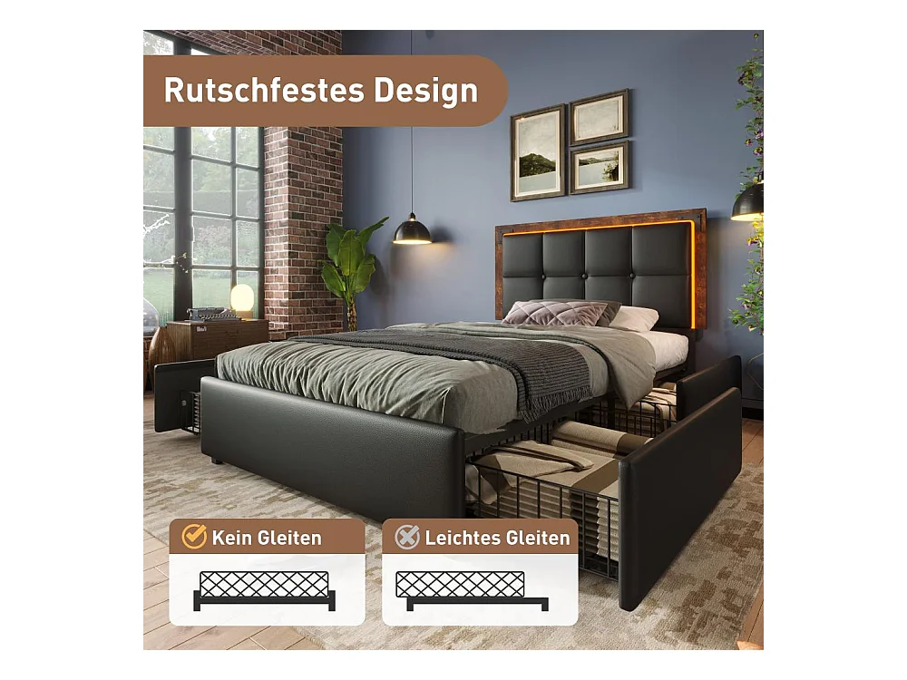 Lit avec tiroirs Lit adulte 90x200 cm Lit avec rampe lumineuse LED et 4 tiroirs Lit simple PU Noir