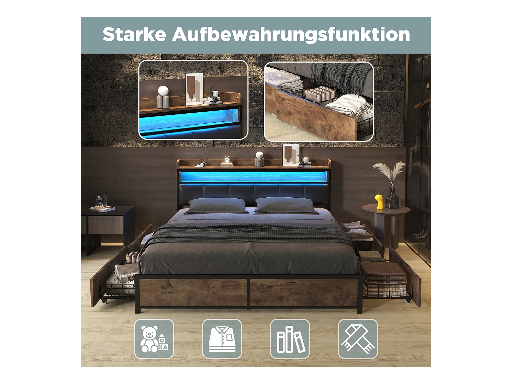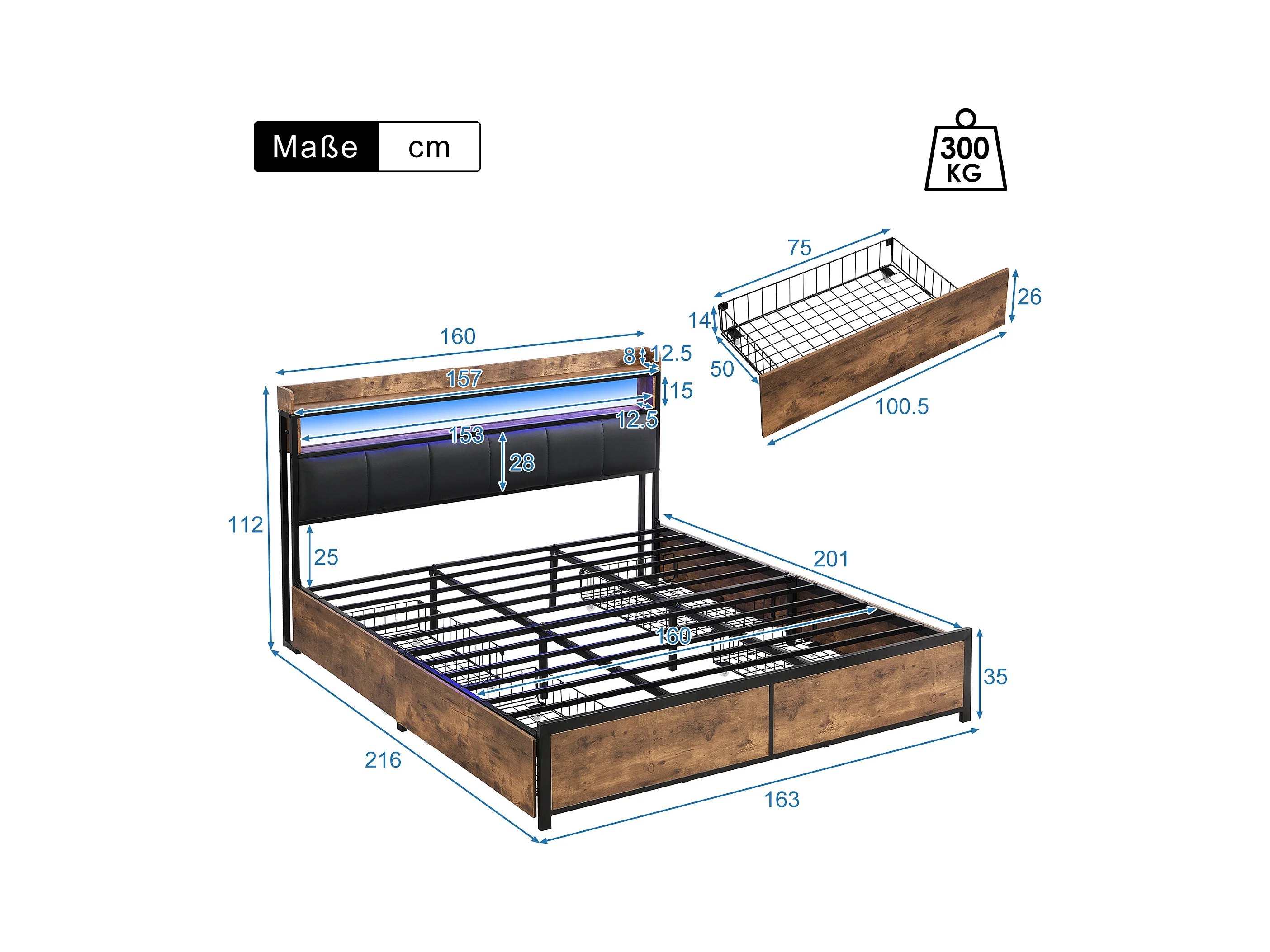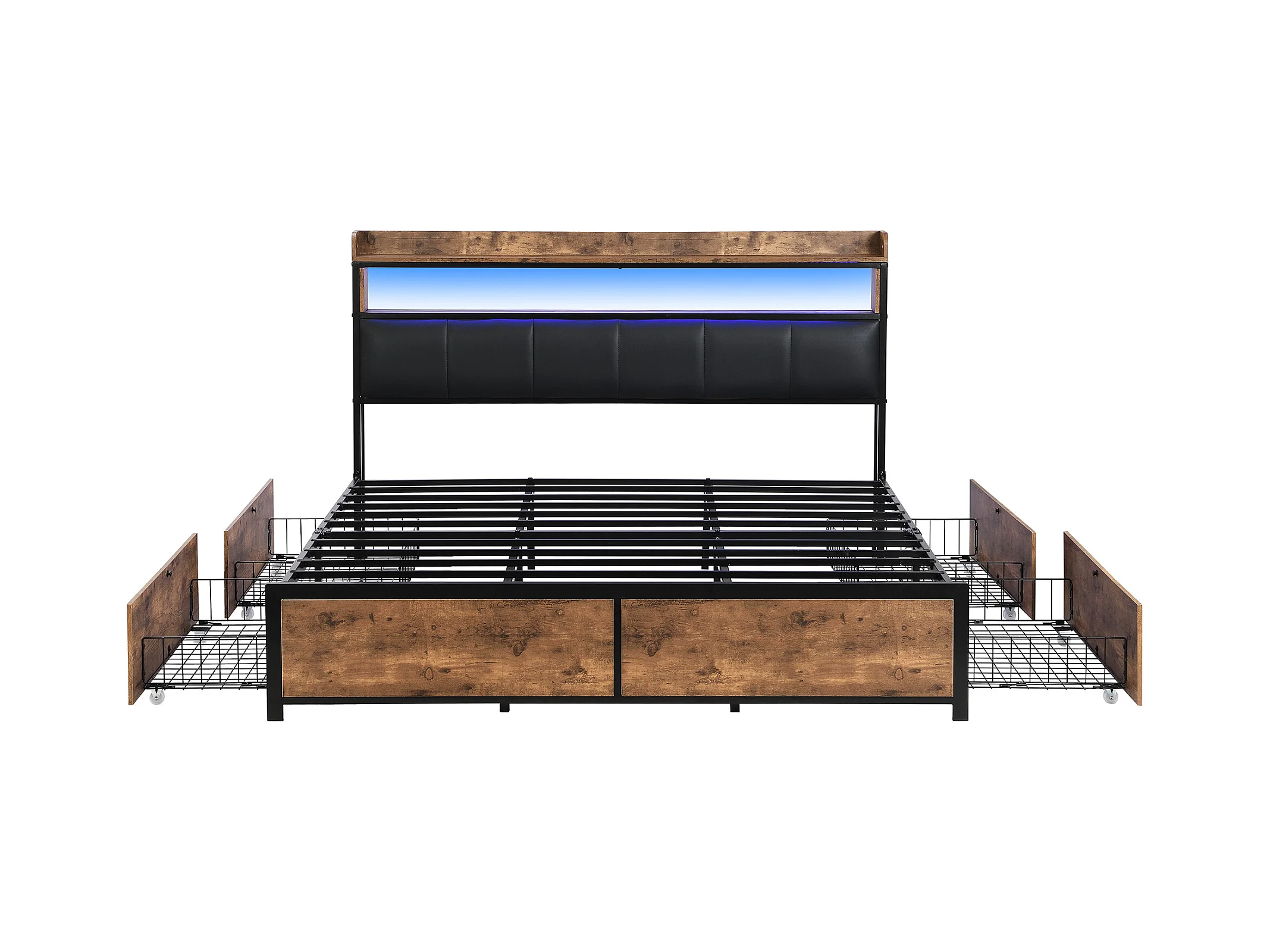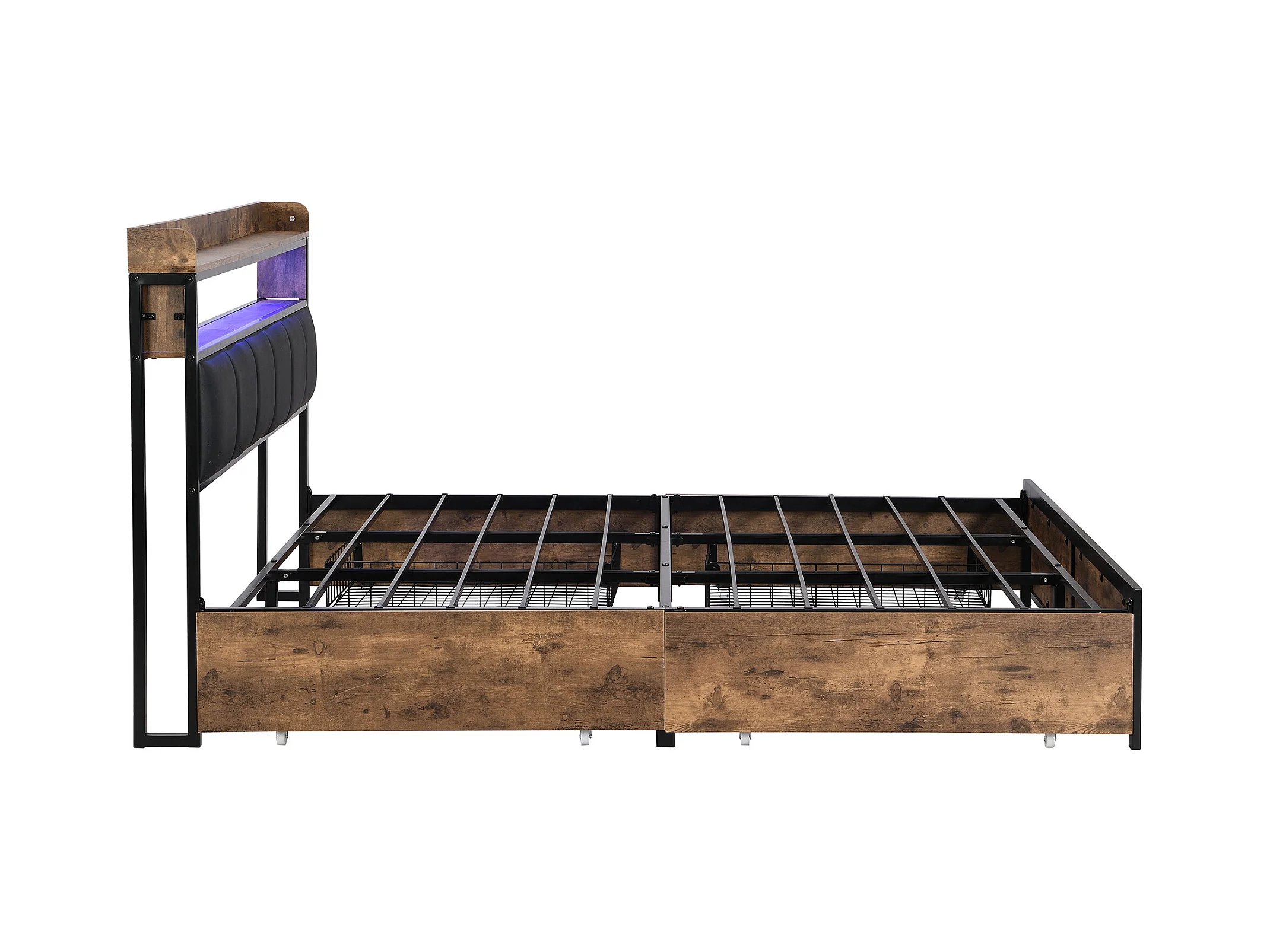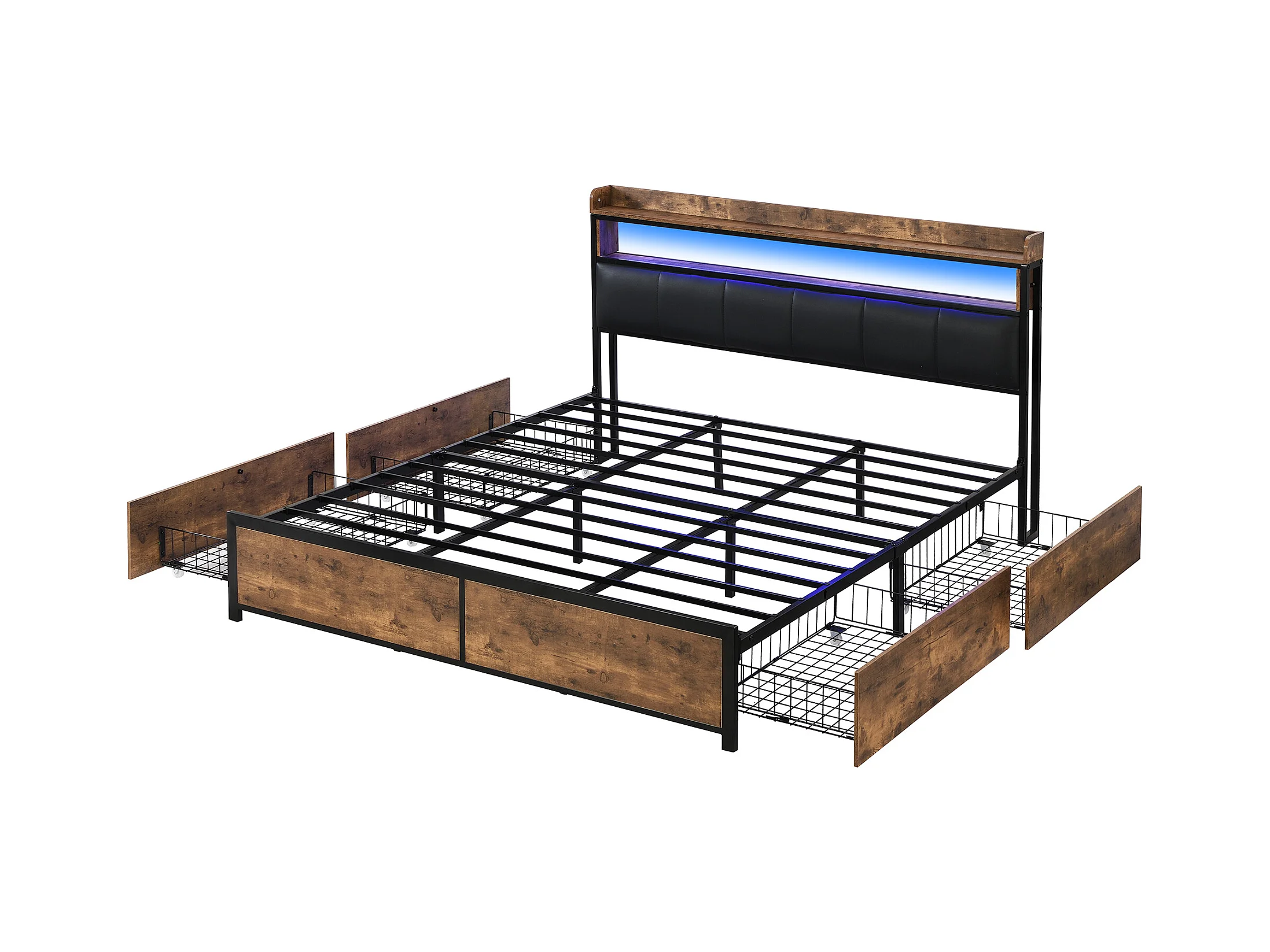 Lit avec tiroirs Lit capitonné 160x200 en PU avec 4 tiroirs et USB, fonction rangement - ​​Noir