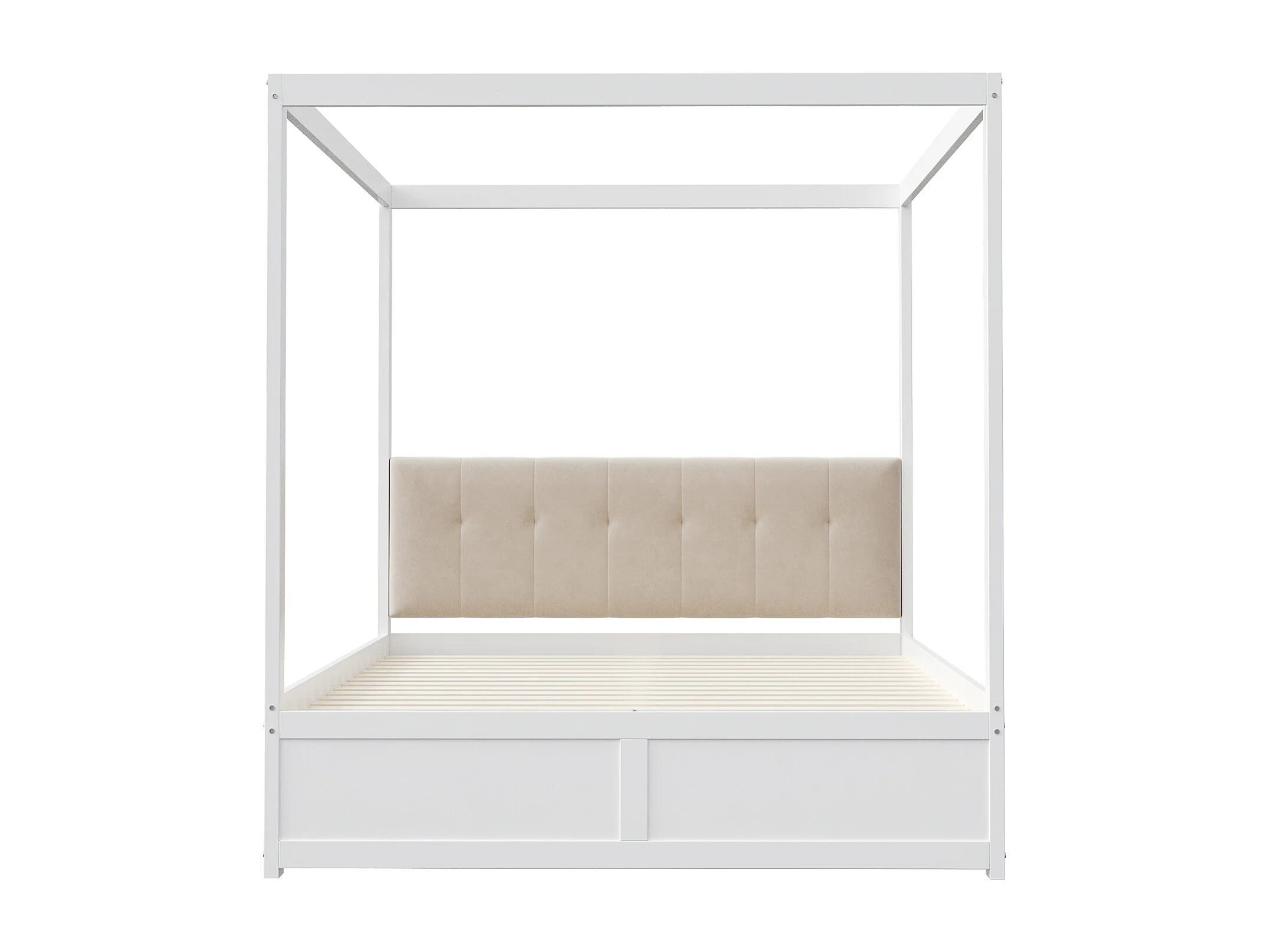 Lit baldaquin 140x200 cm avec 2 tiroirs, adapté à la suspension de moustiquaires, bois blanc, sans matelas