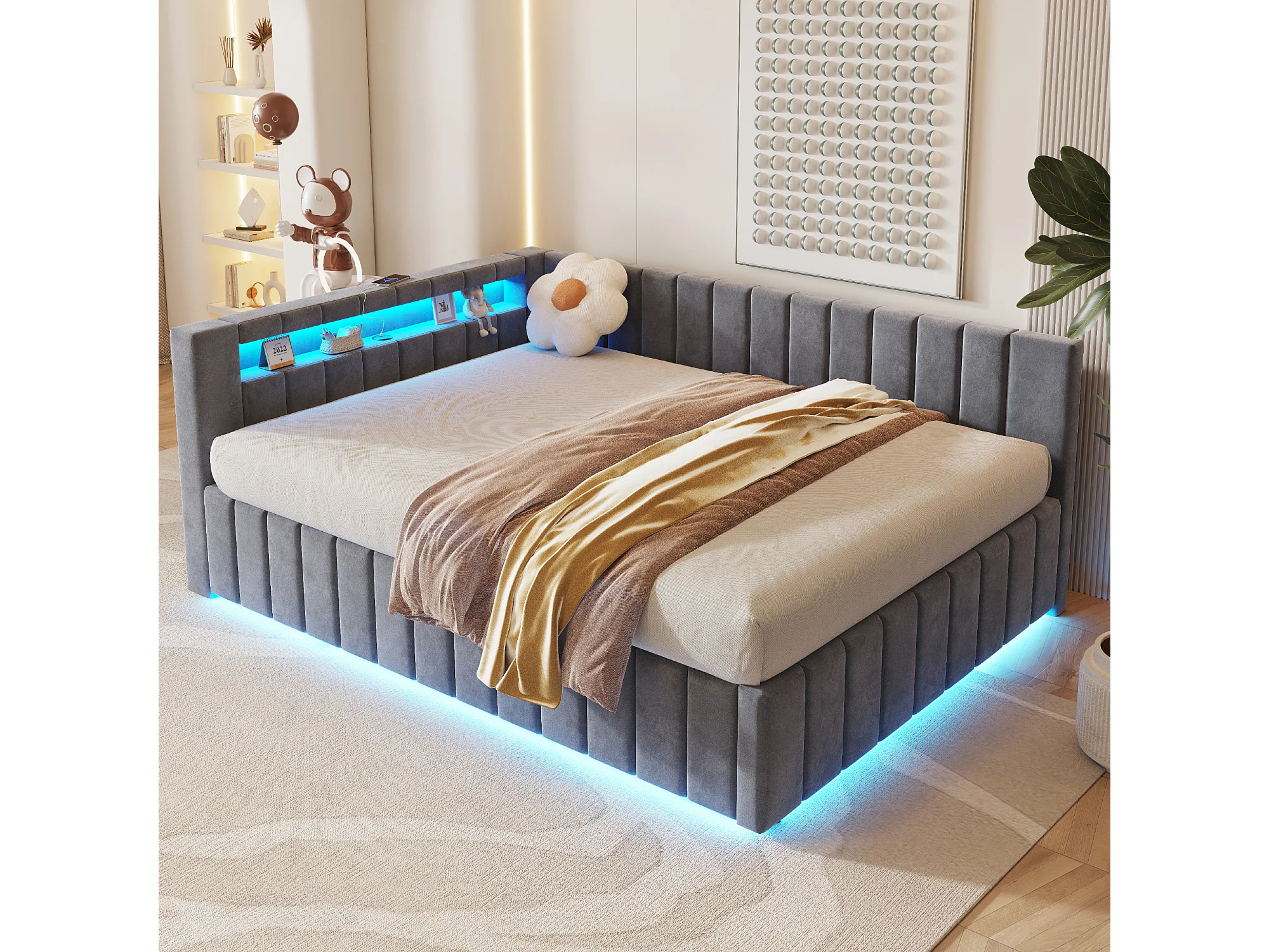 Lit banquette 140x200 cm avec rangement, éclairage LED et port USB - velours gris (sans matelas)