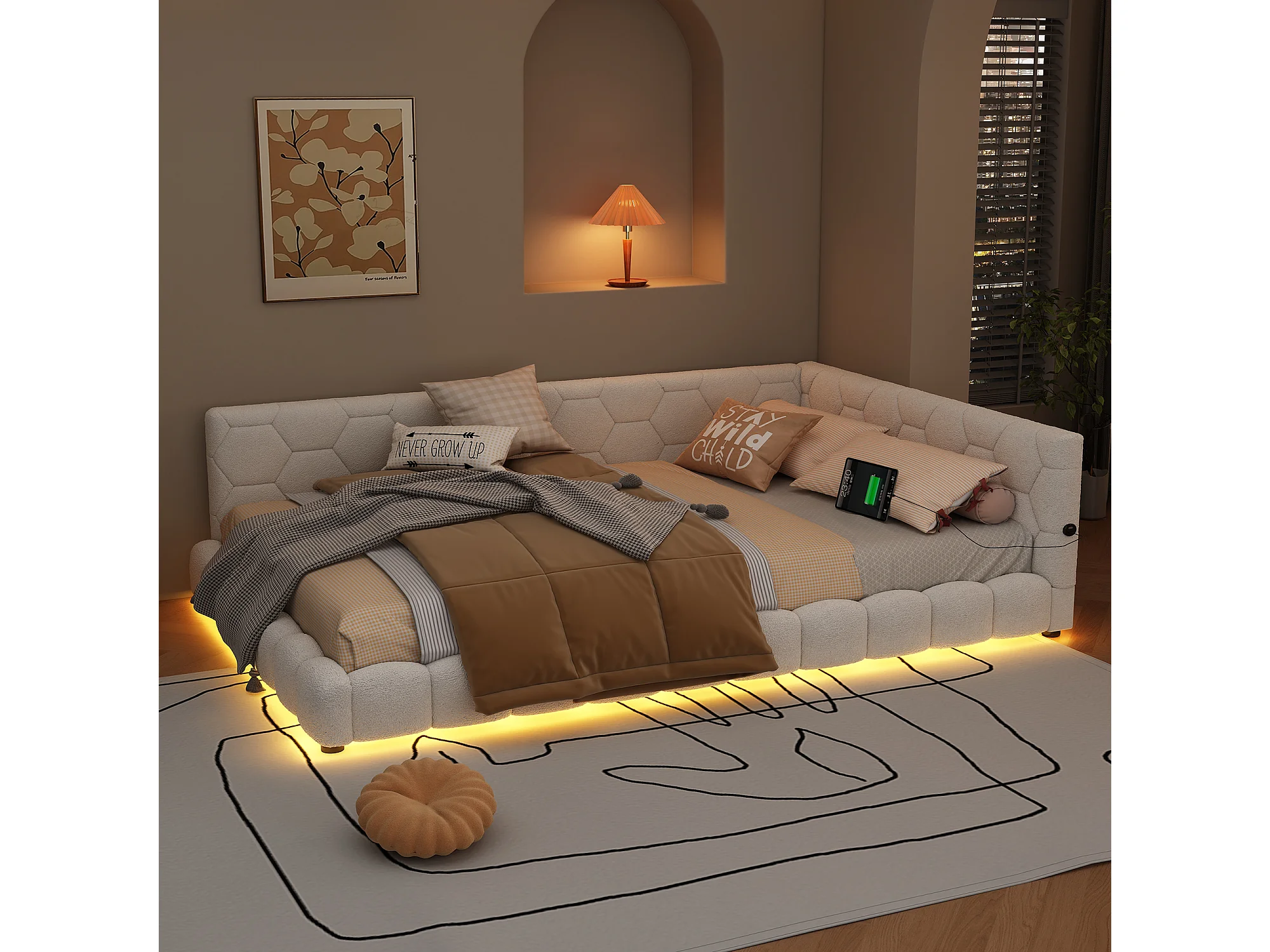 Lit banquette 140x200 cm blanc avec sommier, LED 16 couleurs, ports USB et Type-C, design confortable