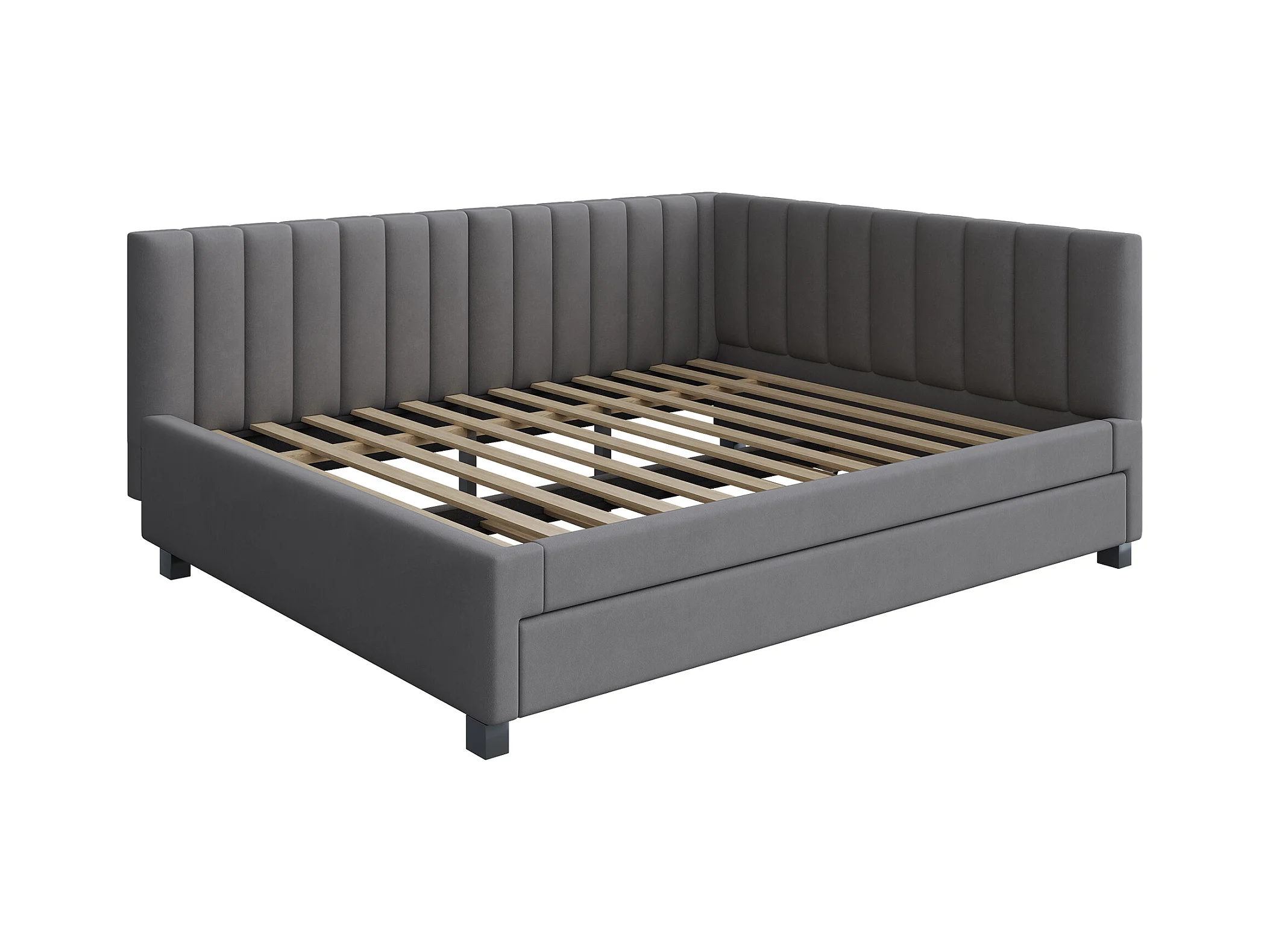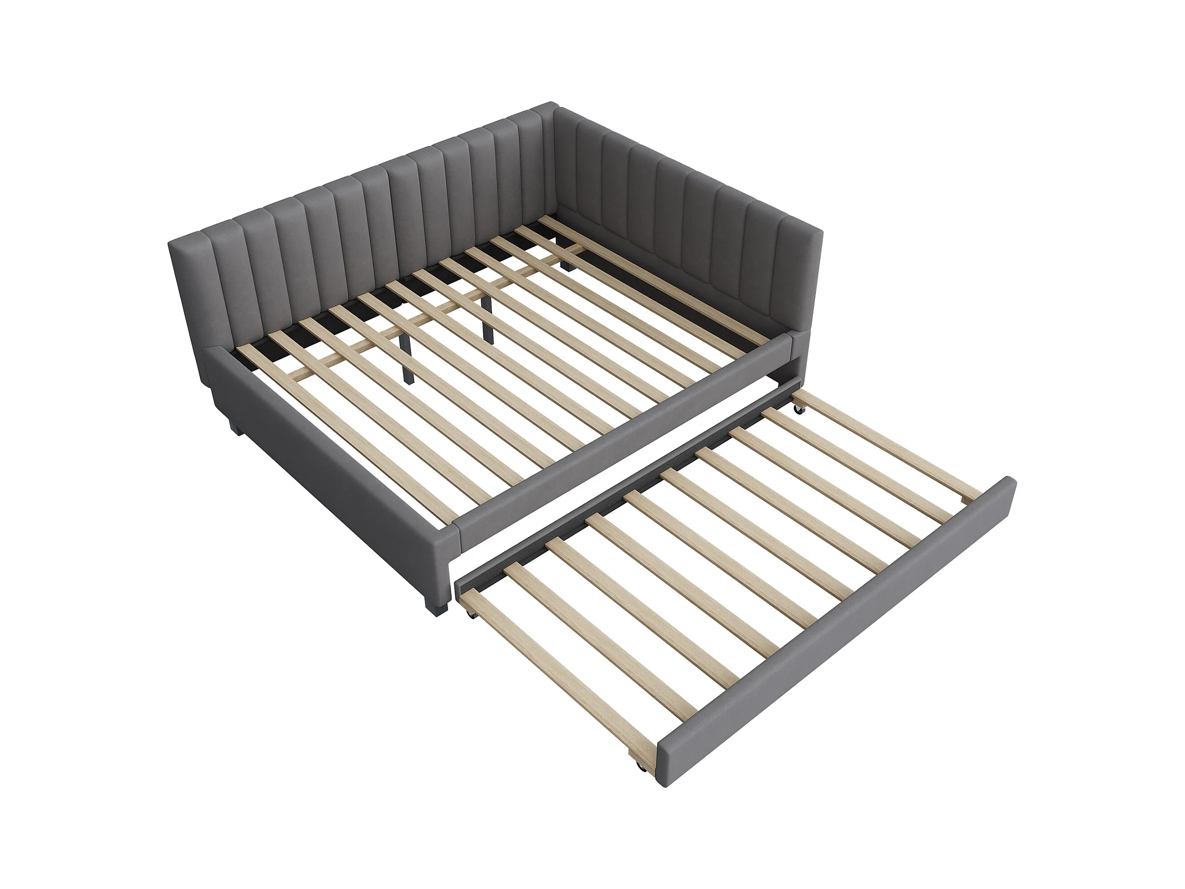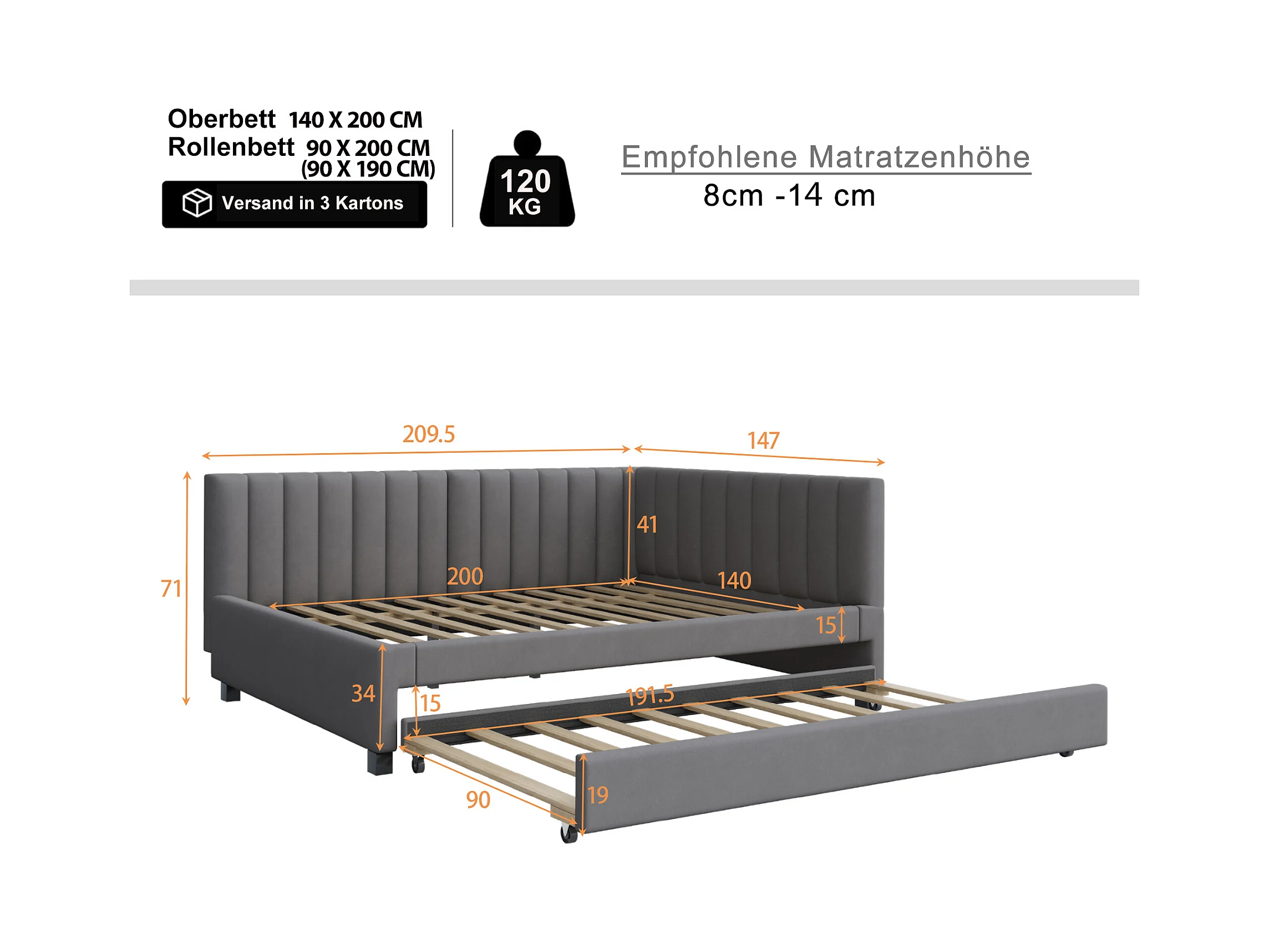 Lit banquette 140x200cm avec lit gigogne 90x190cm, sommier à lattes, tissu en velours gris, sans matelas