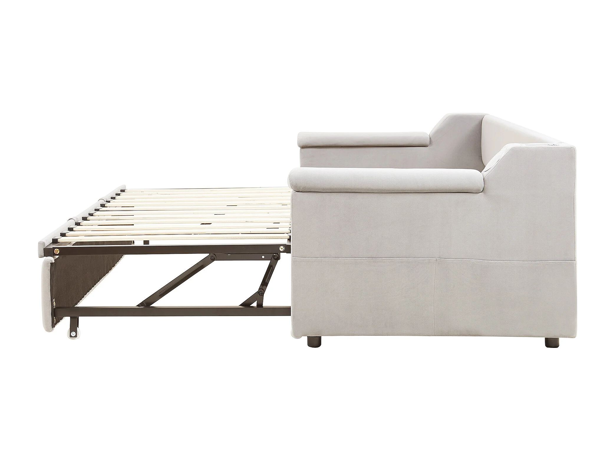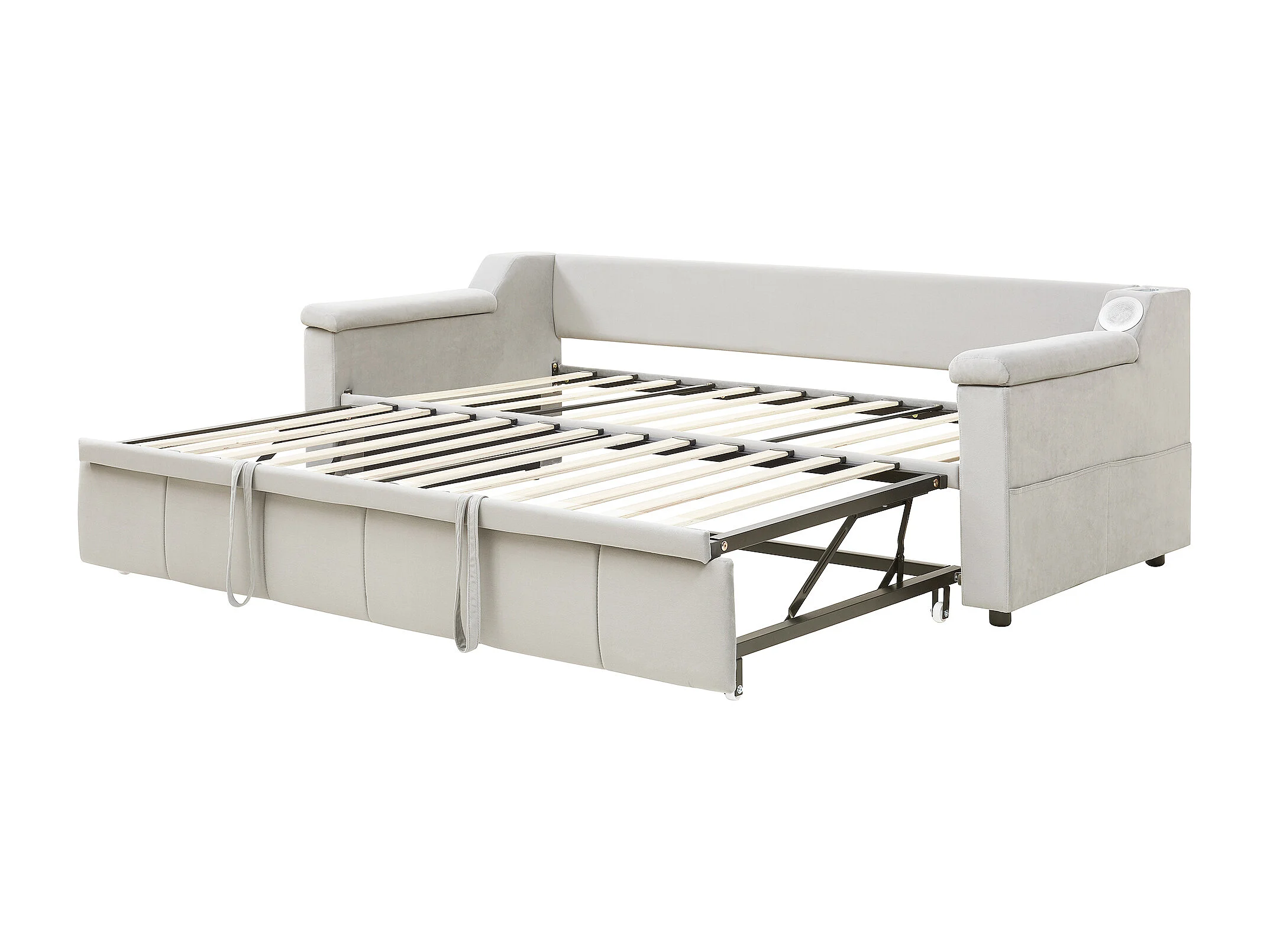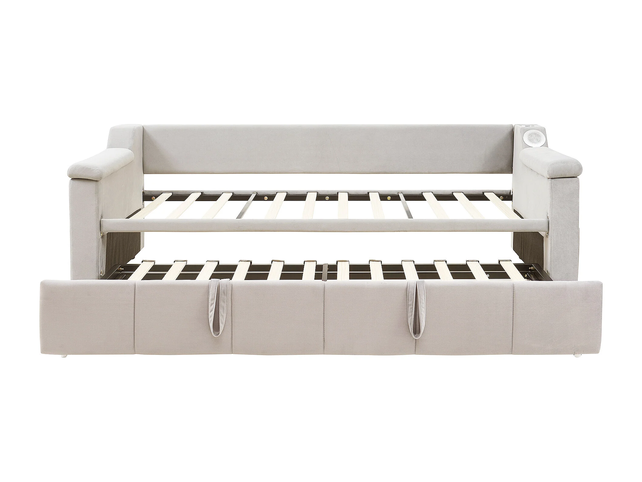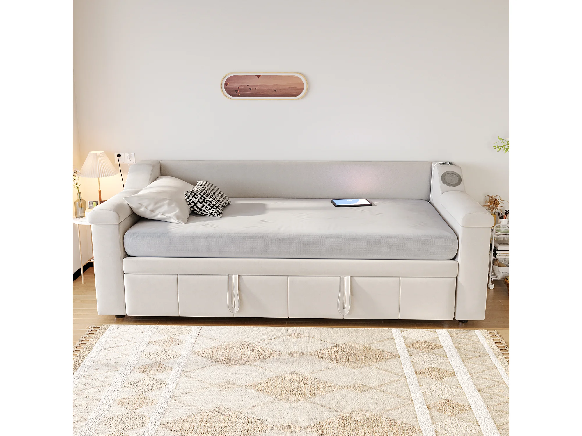 Lit banquette 90/180x190cm avec USB et poches latérales - Tissu velours beige ( sans matelas)