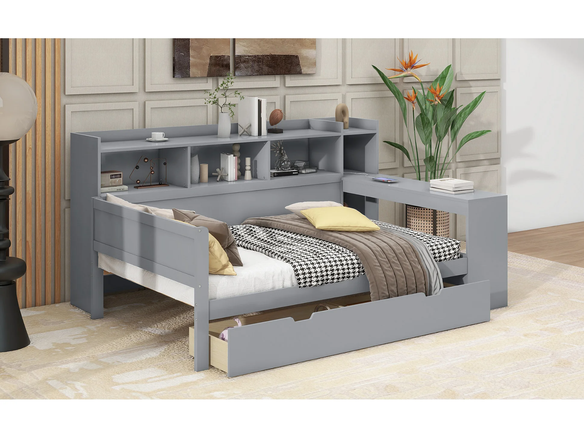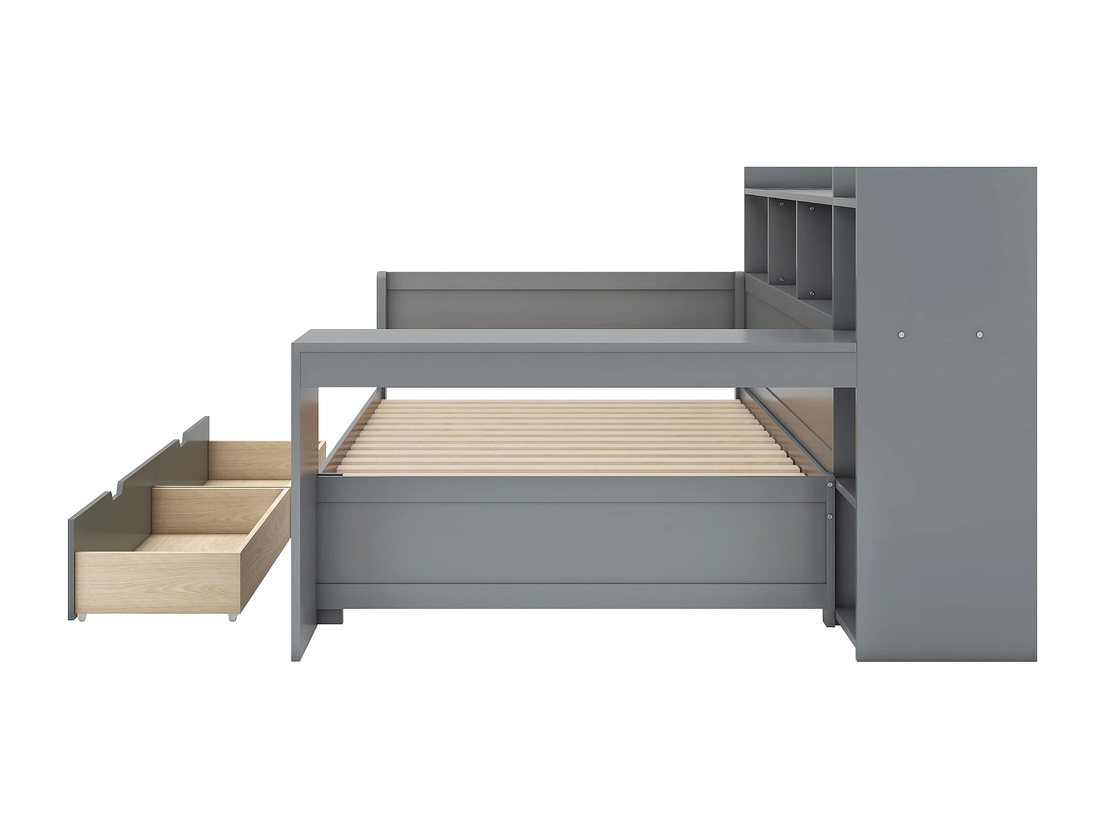 Lit banquette 90 x 200 cm avec prise , USB, 2 tiroirs et bureau - Sans matelas - Bois en PB gris