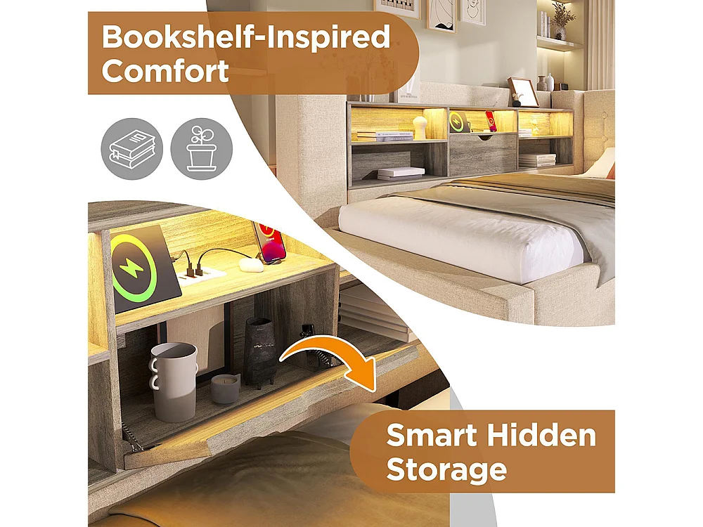 Lit banquette 90x200 cm, avec lit escamotable 90x190 cm et éclairage LED, tête de lit en forme de L, peut être monté des deux côtés, lin, beige