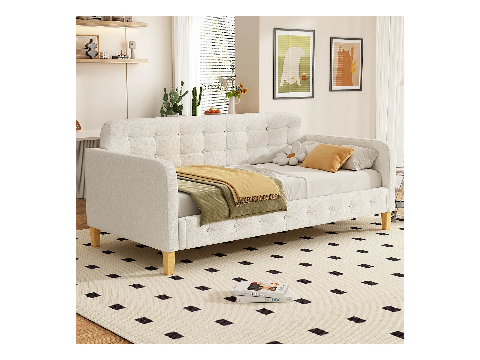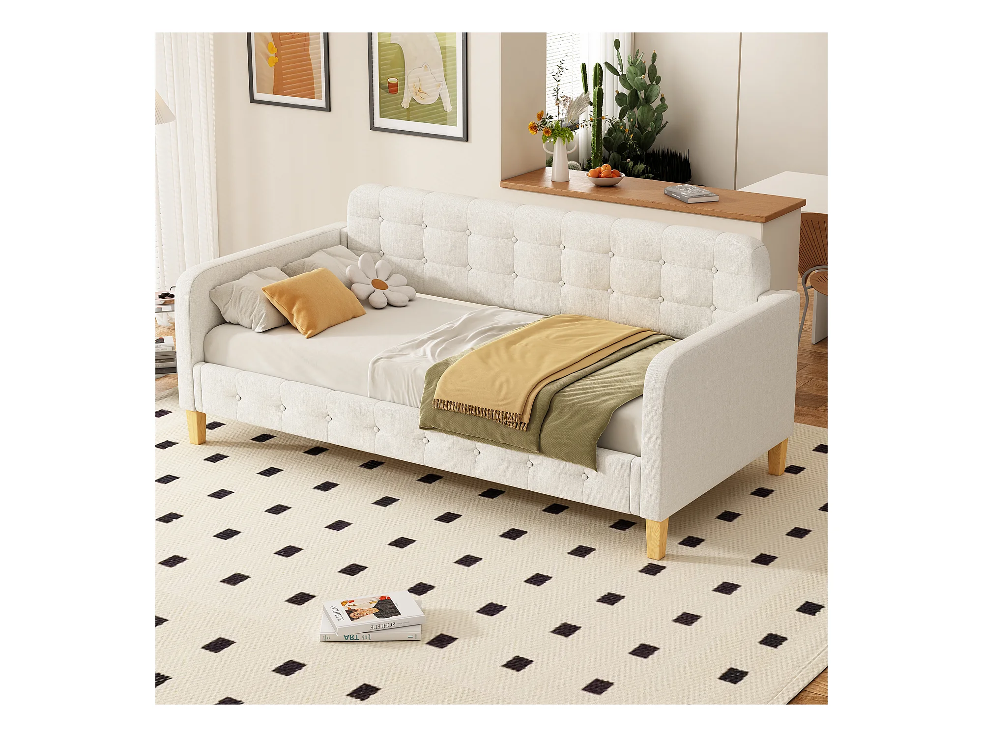 Lit banquette 90x200 cm beige, capitonnage à boutons, design sobre et confortable, idéal chambre d’amis