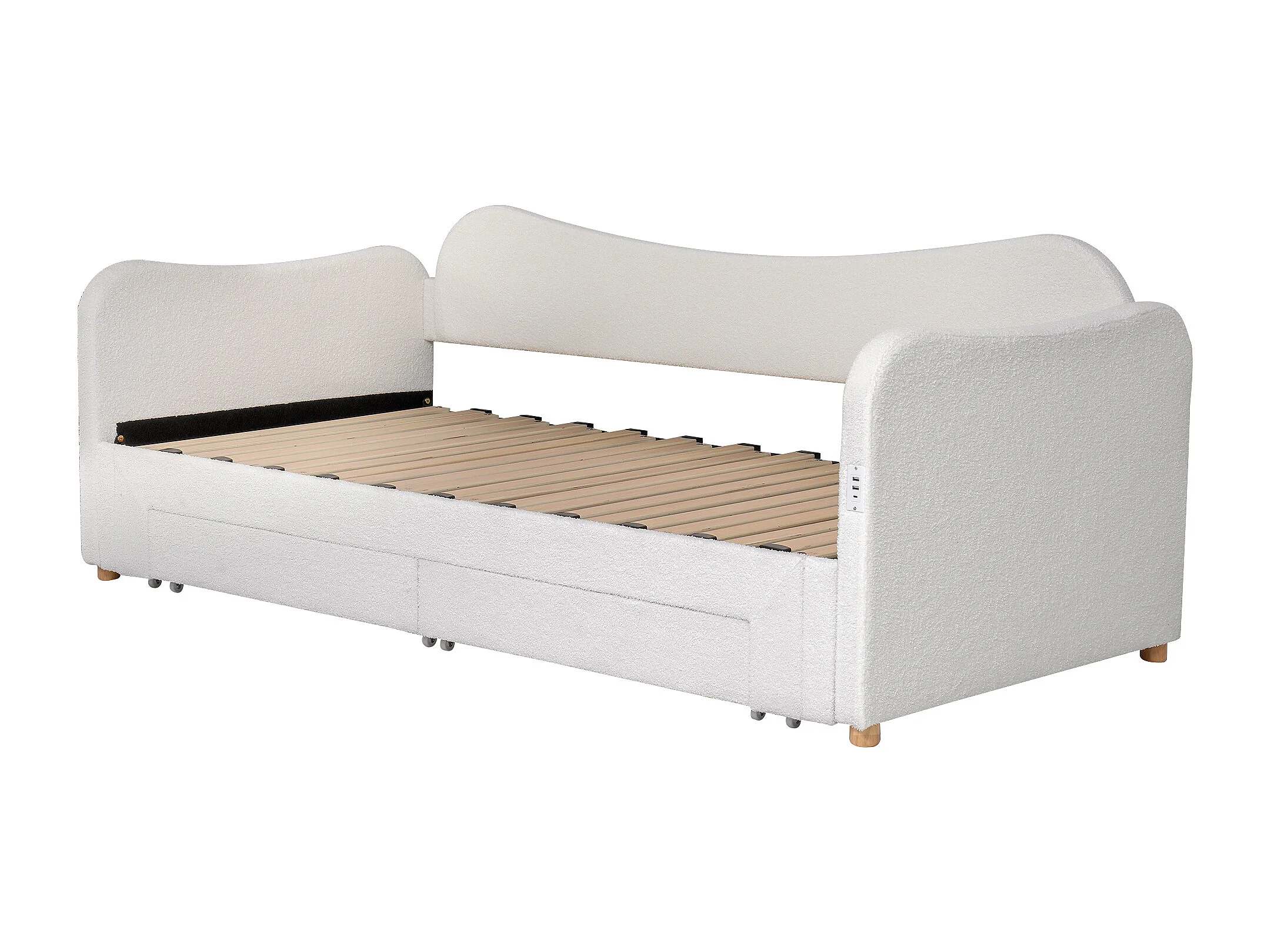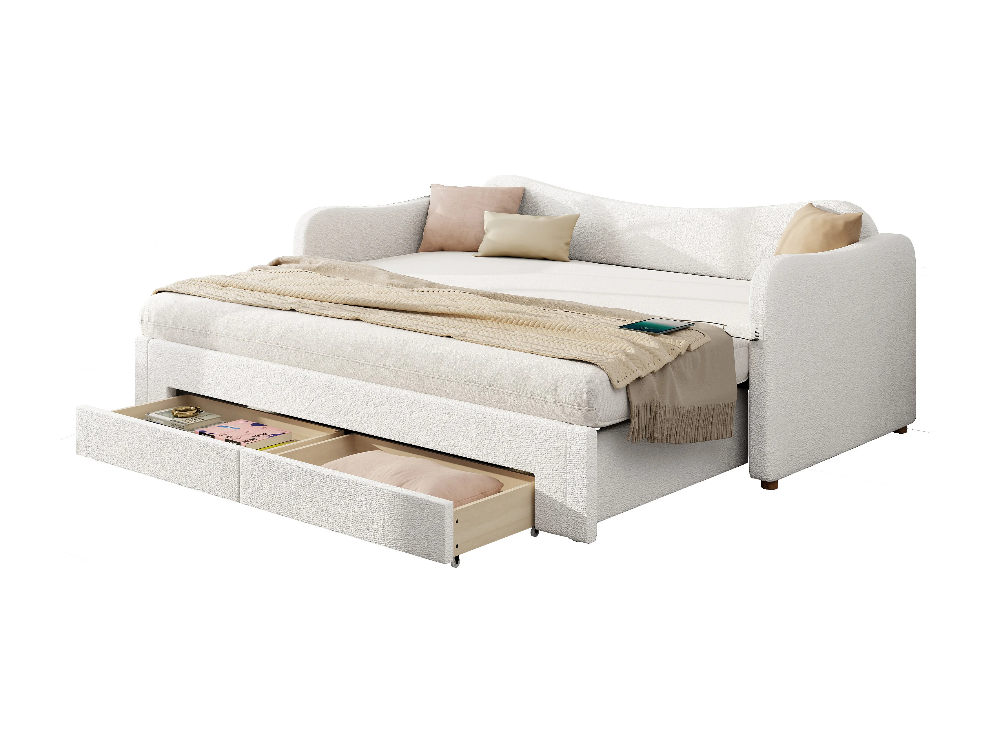 Lit banquette 90x200 cm extensible 180x200 cm - Lit adulte avec 2 tiroirs et port USB - Beige Bouclé