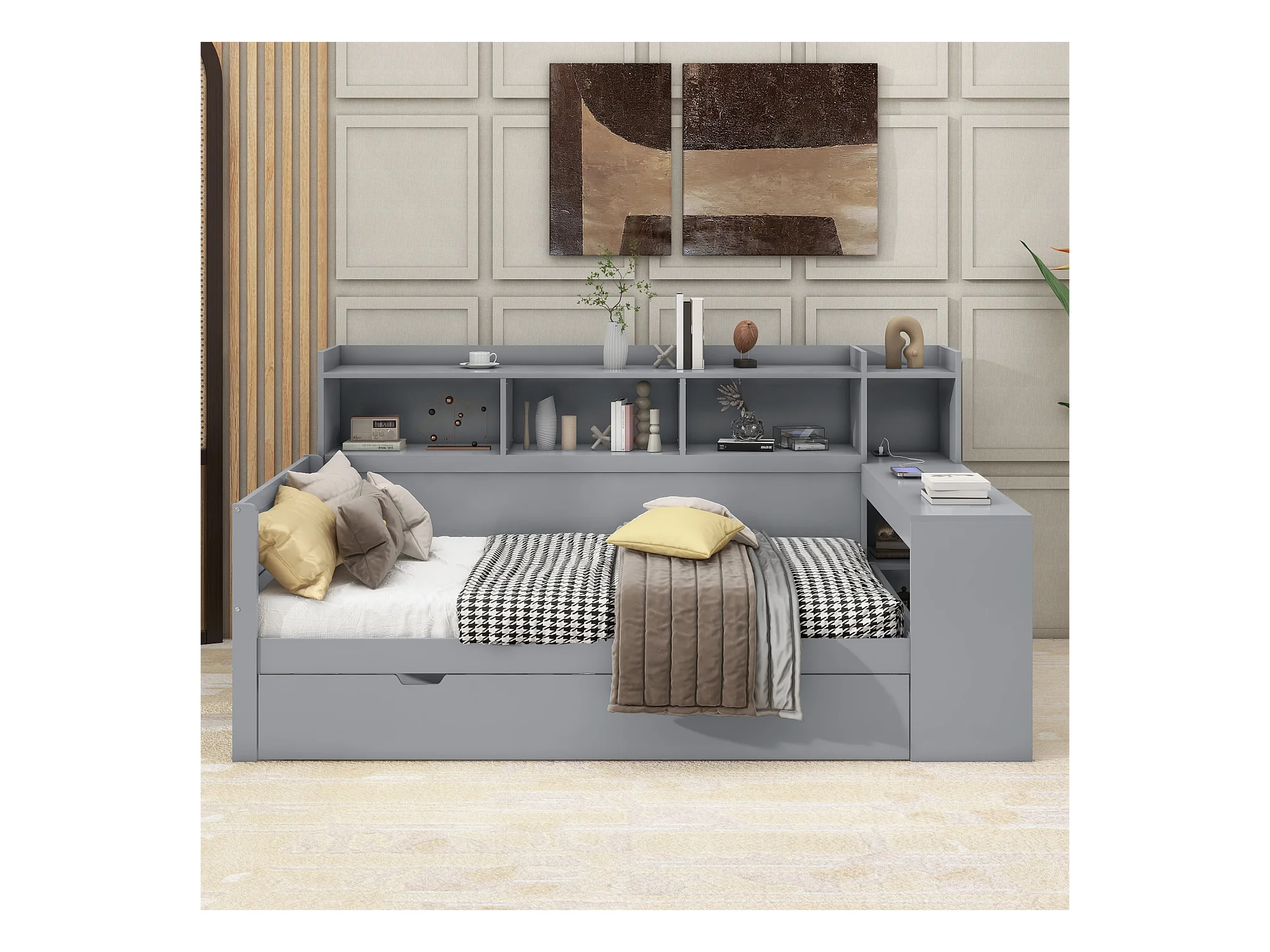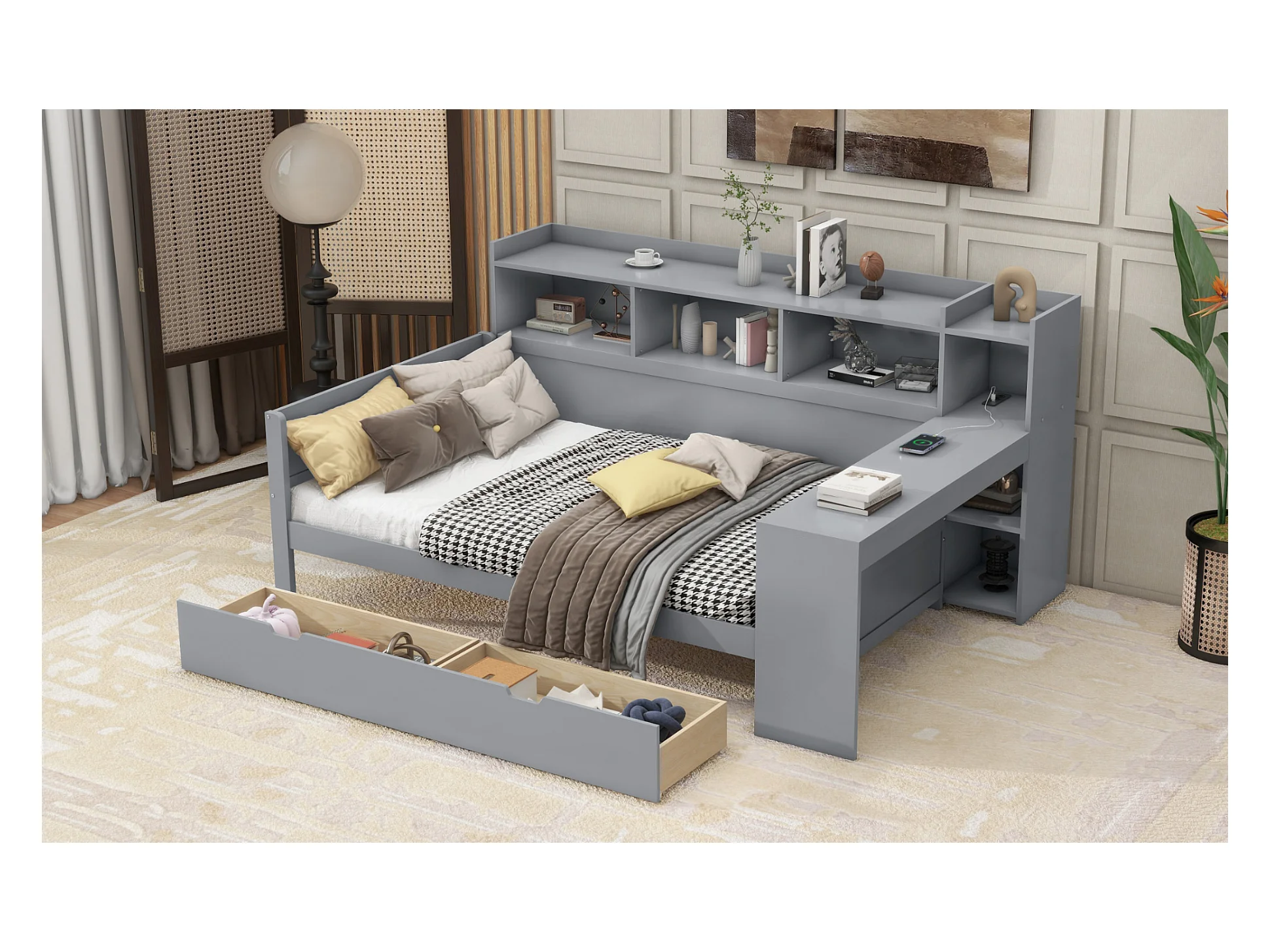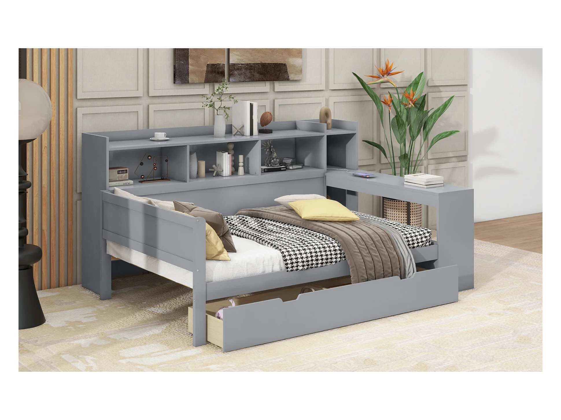 Lit banquette 90x200 cm gris, avec bureau, 2 tiroirs, table de chevet intégrée, prise et port USB, sans matelas