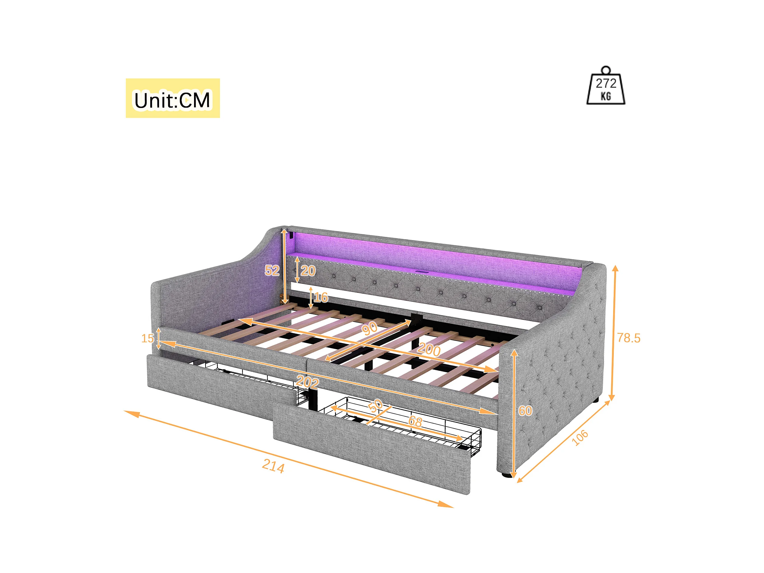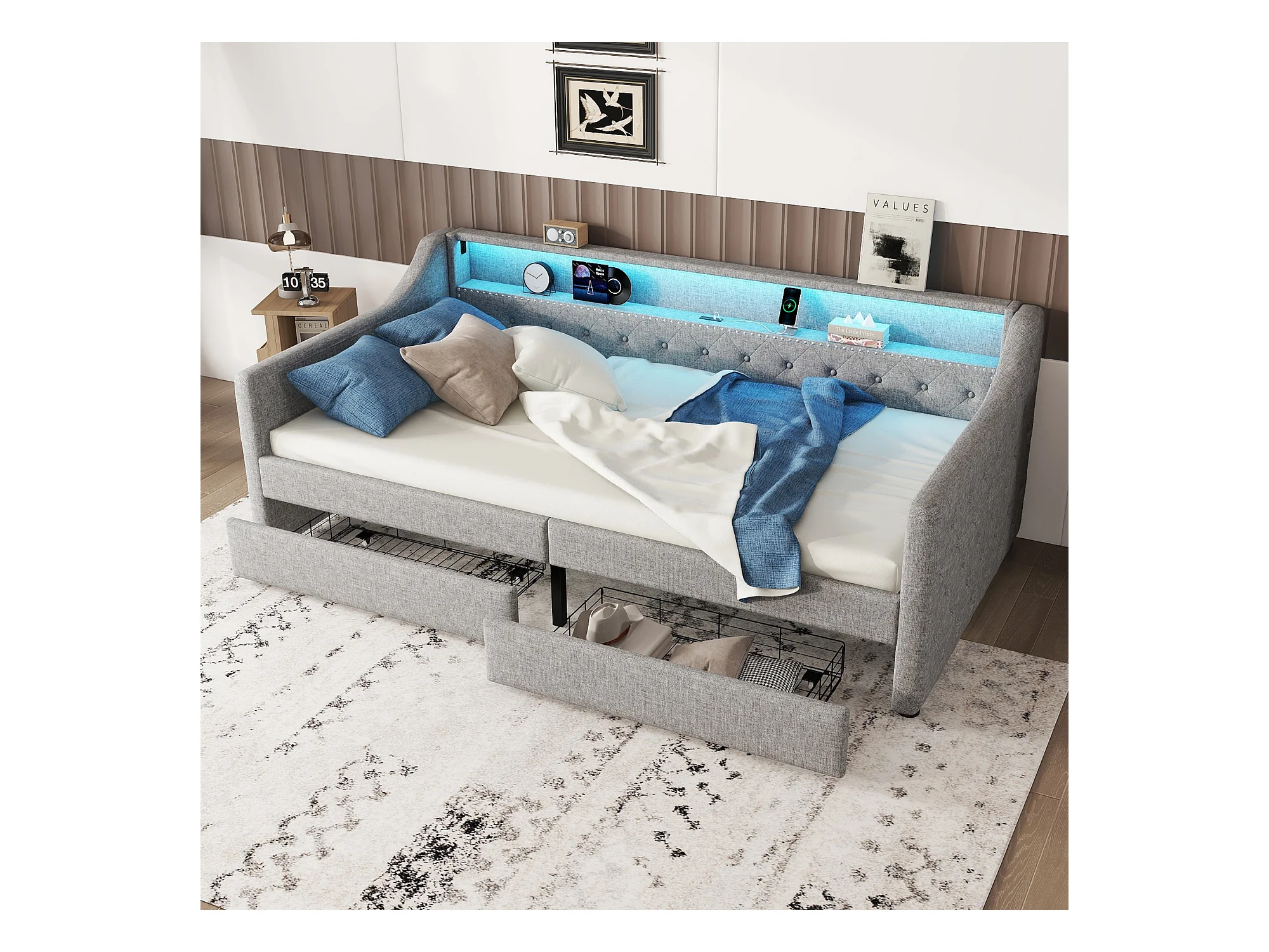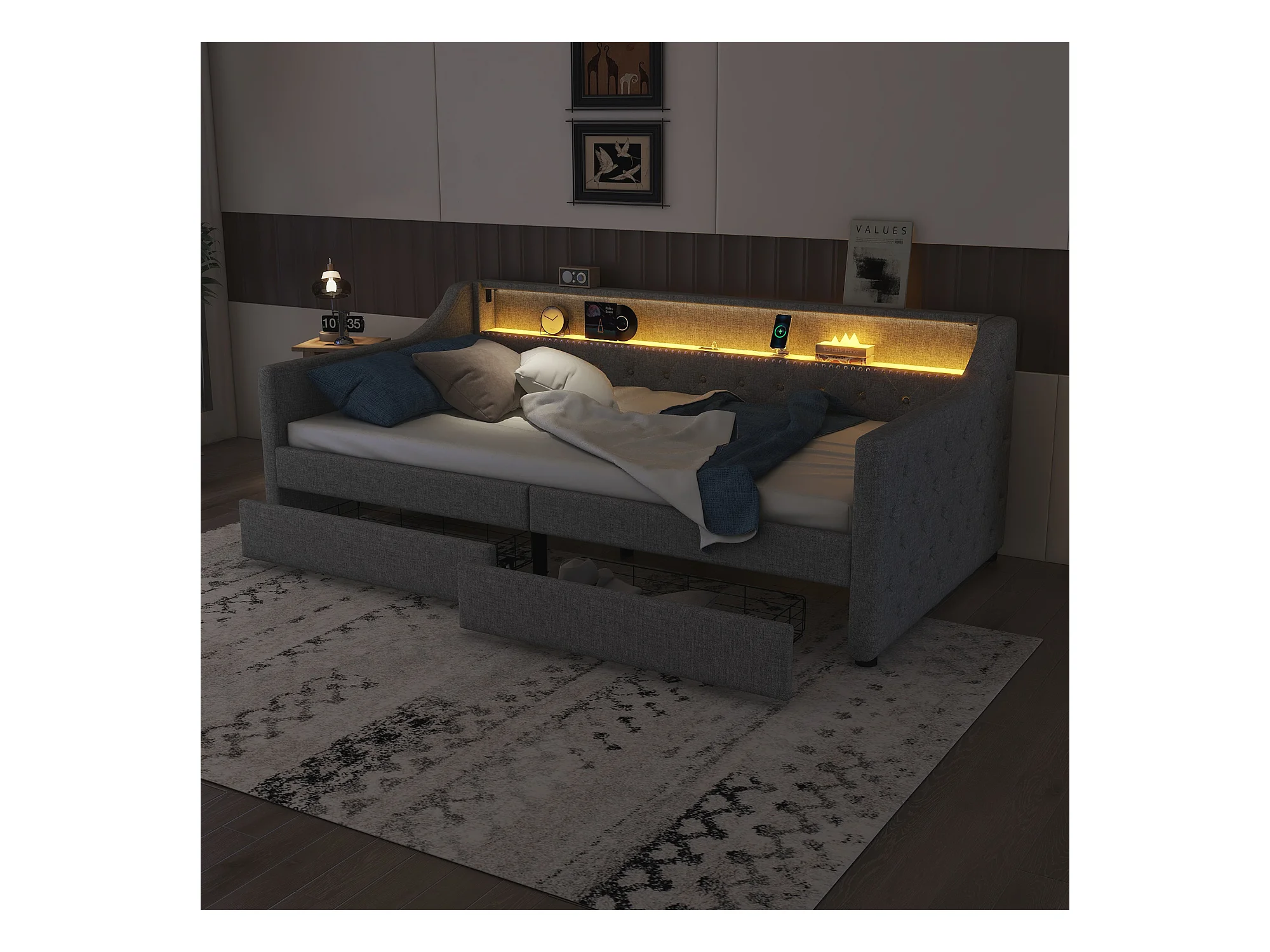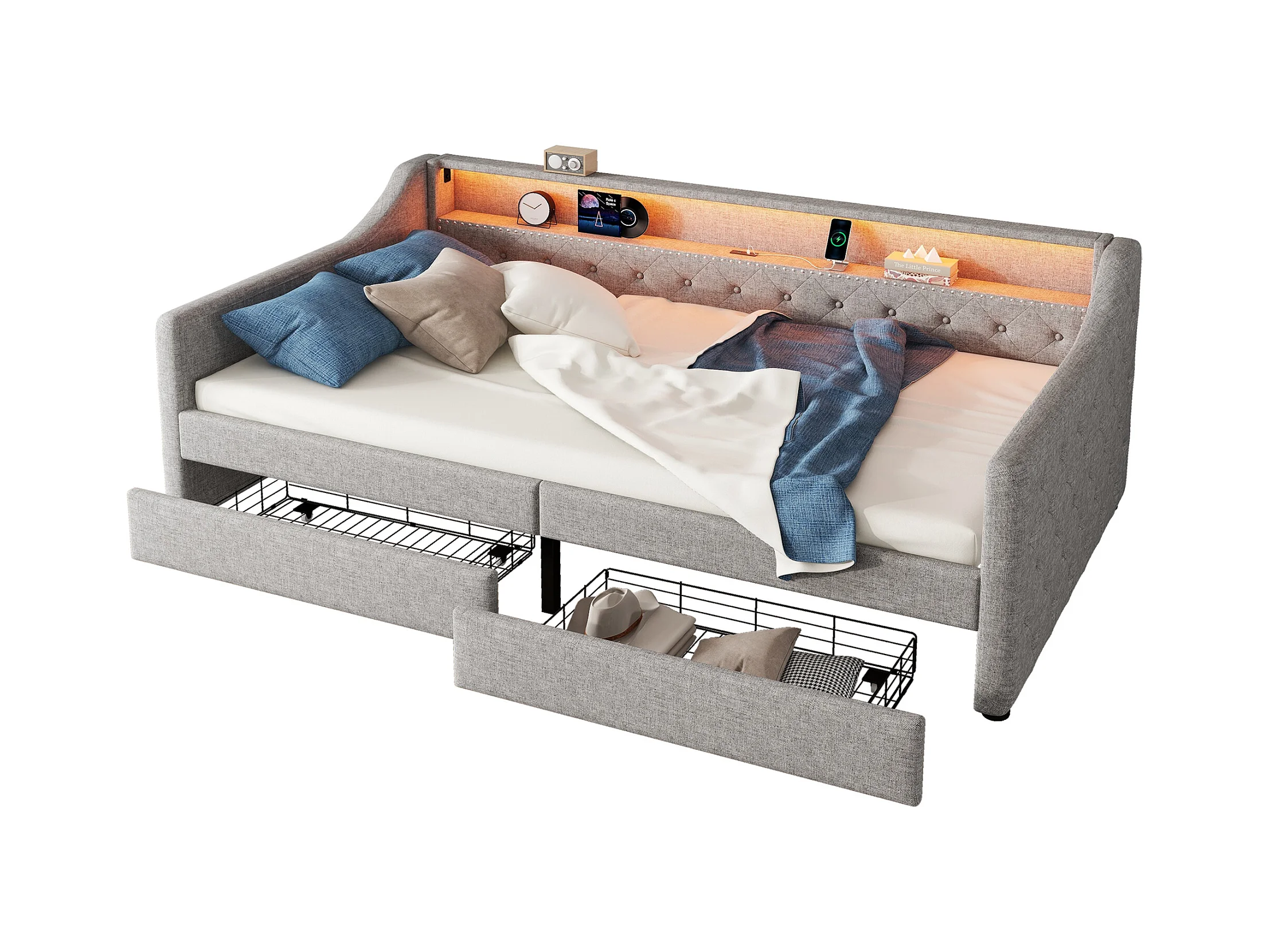 Lit banquette 90x200 cm gris avec LED d’ambiance, télécommande, ports USB, deux tiroirs et structure en lin