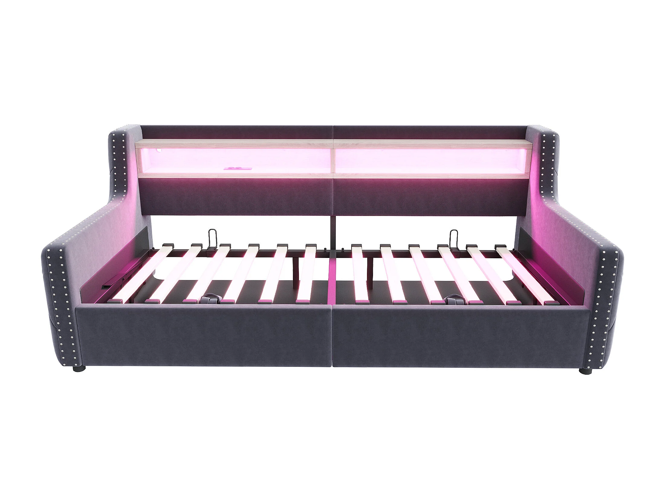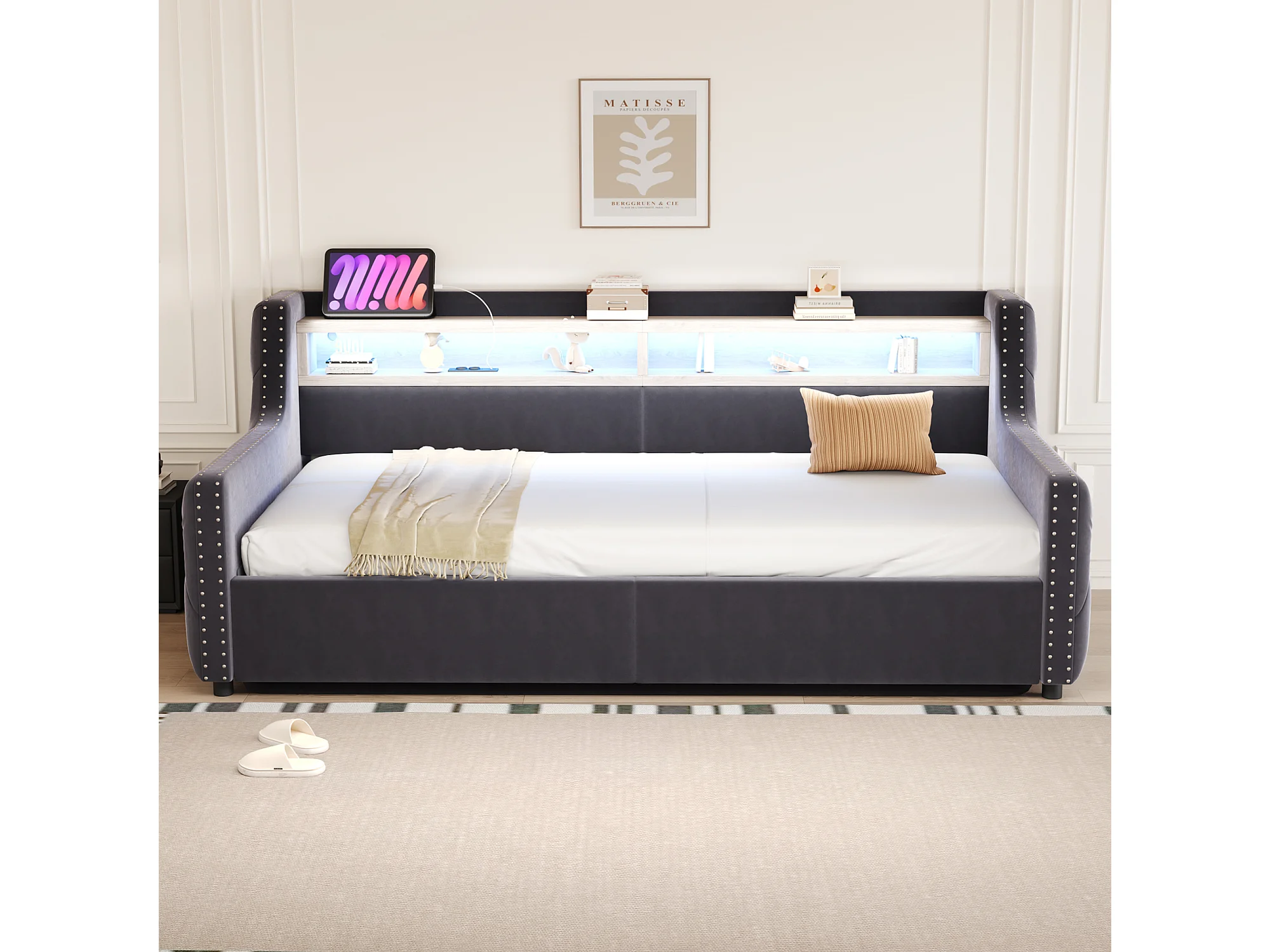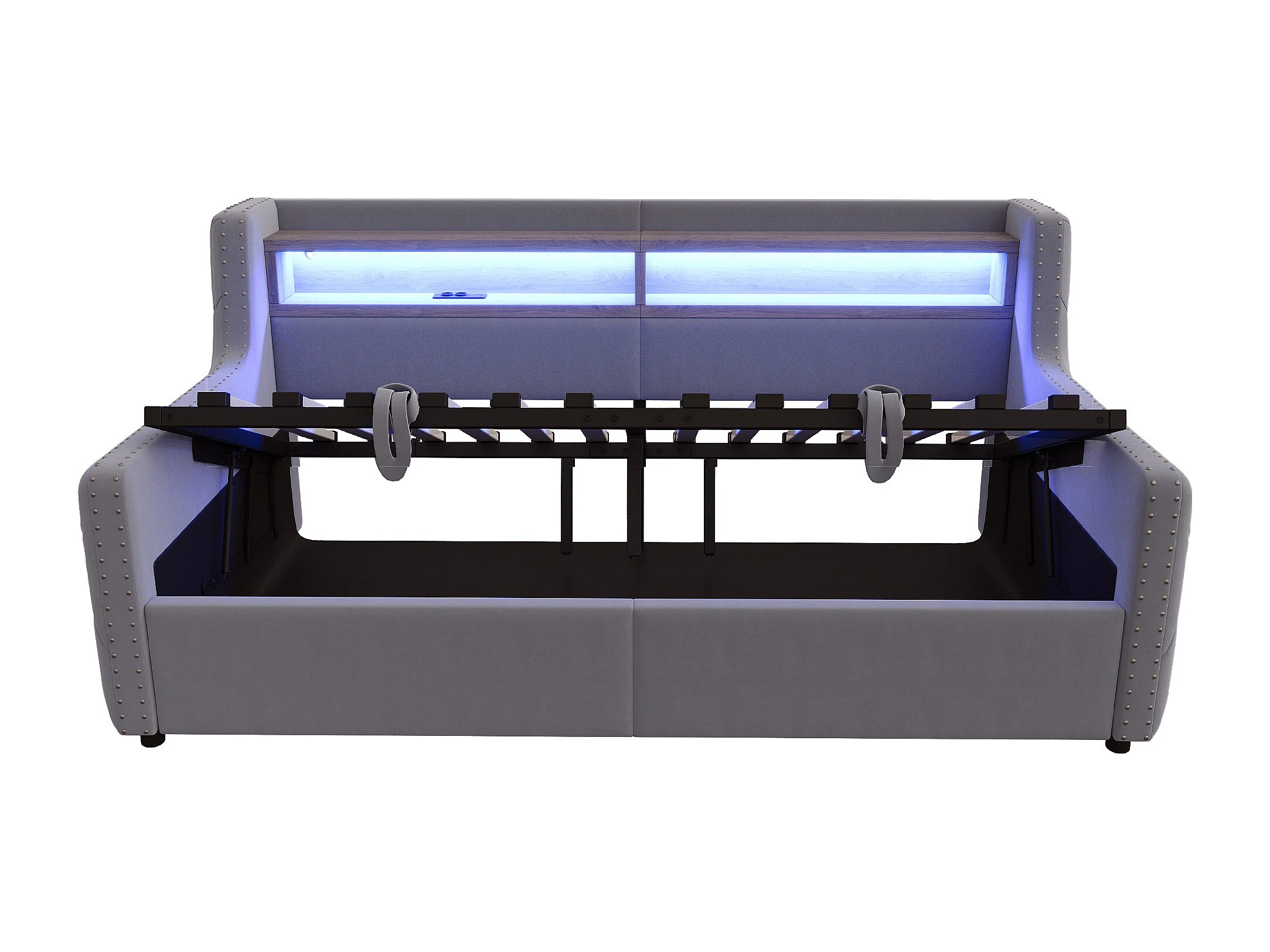 Lit banquette 90x200 cm, lit adulte avec rangement, éclairage LED et ports USB - velours gris (sans matelas)