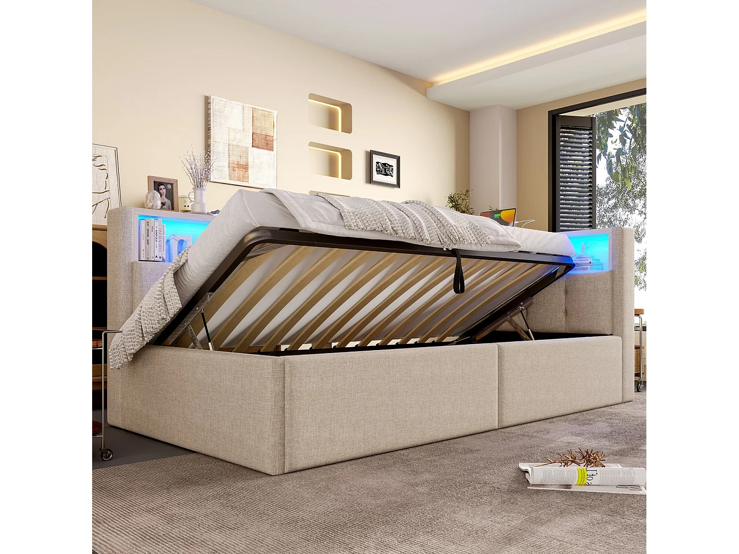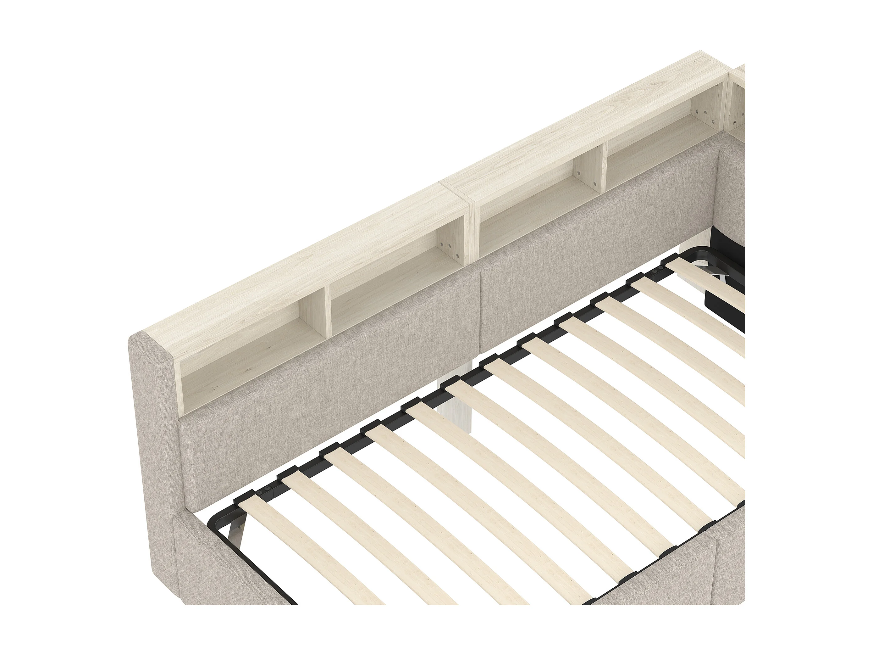 Lit banquette 90x200 cm, lit coffre avec lumière LED et USB, étagères de rangement - lin beige (sans matelas)